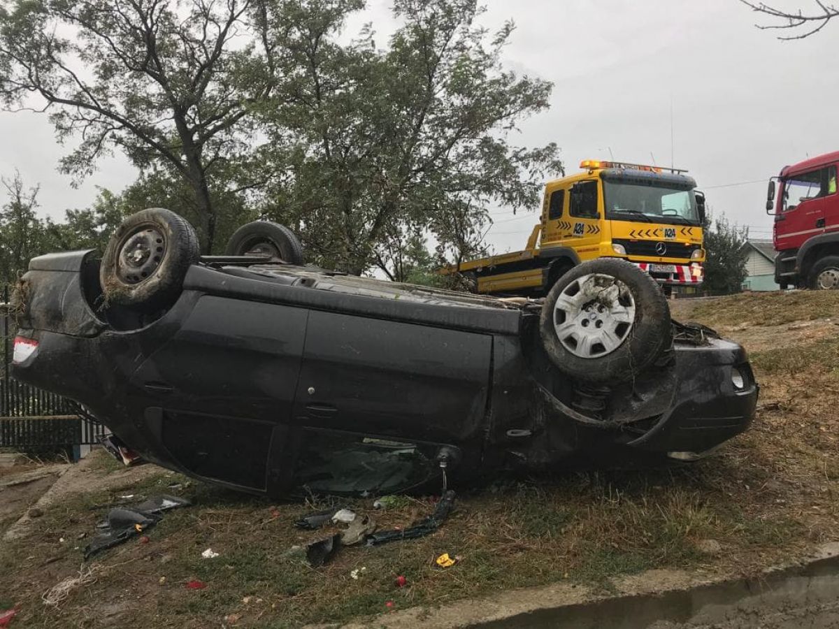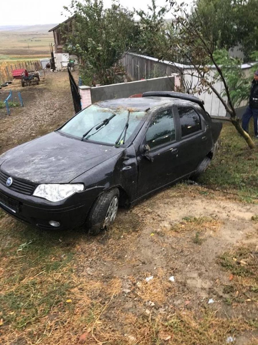 Un autoturism marca Fiat care a derapat cel mai probabil pe carosabilul ud putea fi observat cu roțile în sus, lângă gardul unei case, ultima din Stăuceni de altfel.