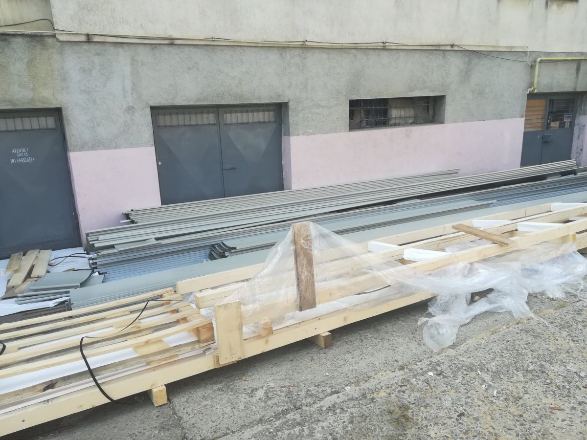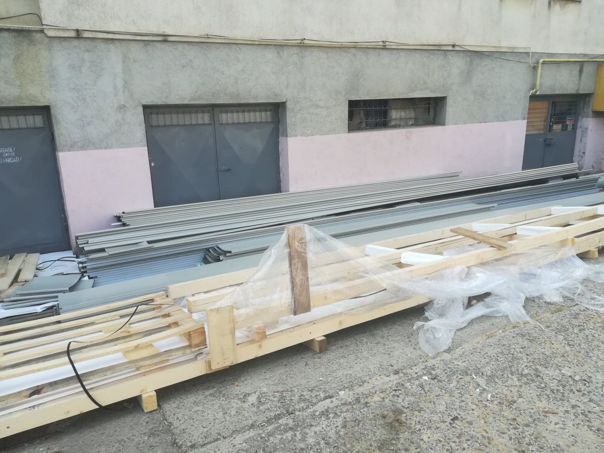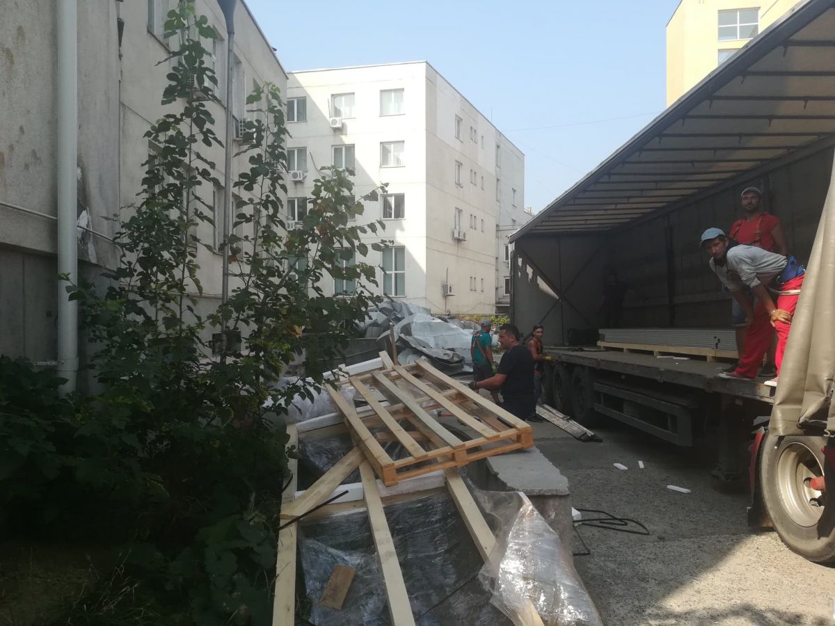 Joi, câțiva muncitori au descărcat tabla cea nouă, astfel că în curând sediul fostei Direcții a Muncii va avea un nou acoperiș.