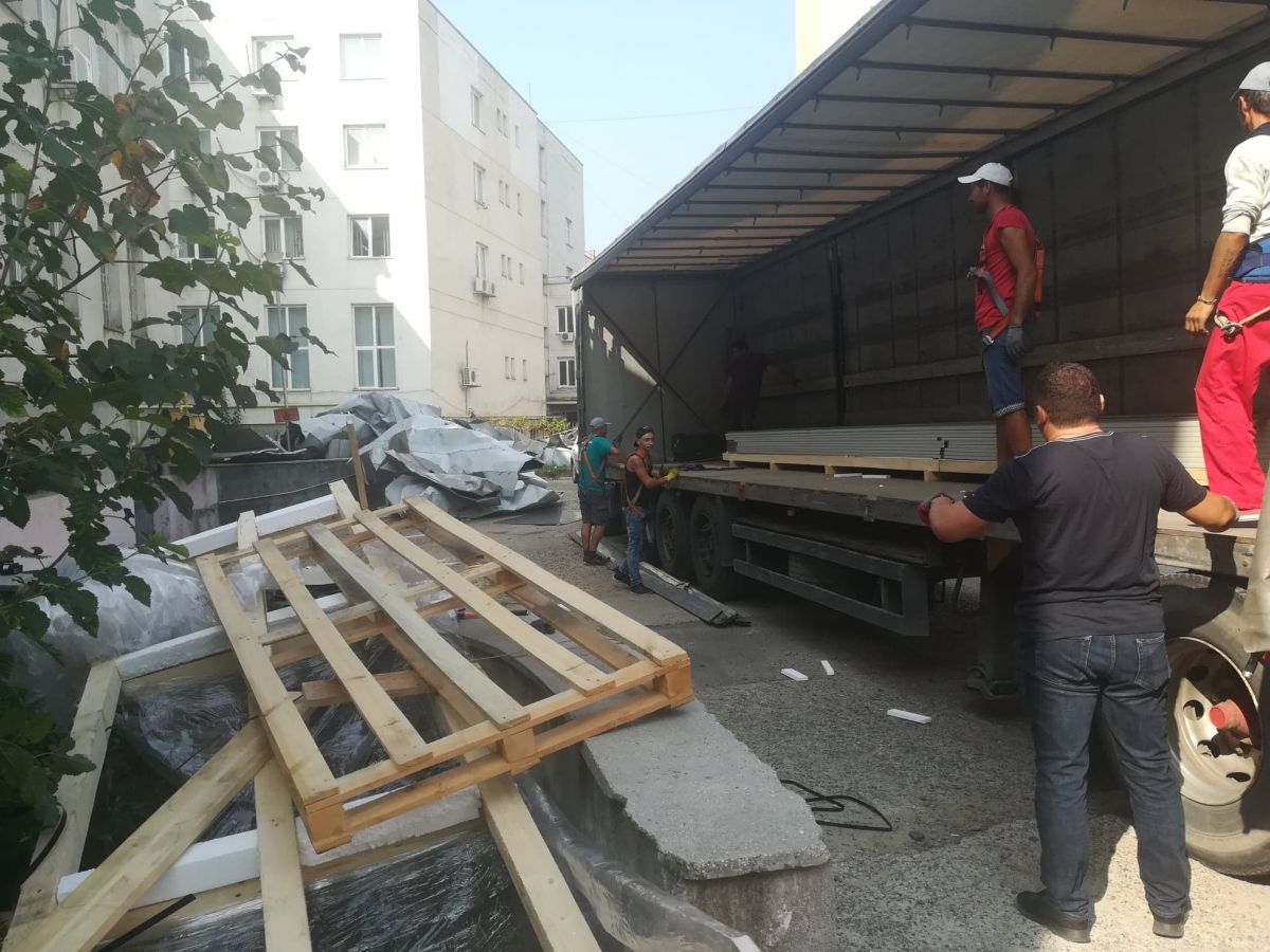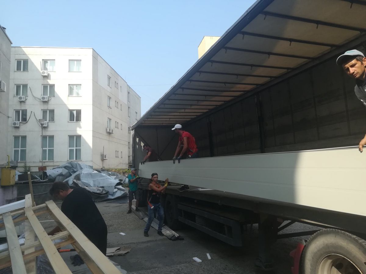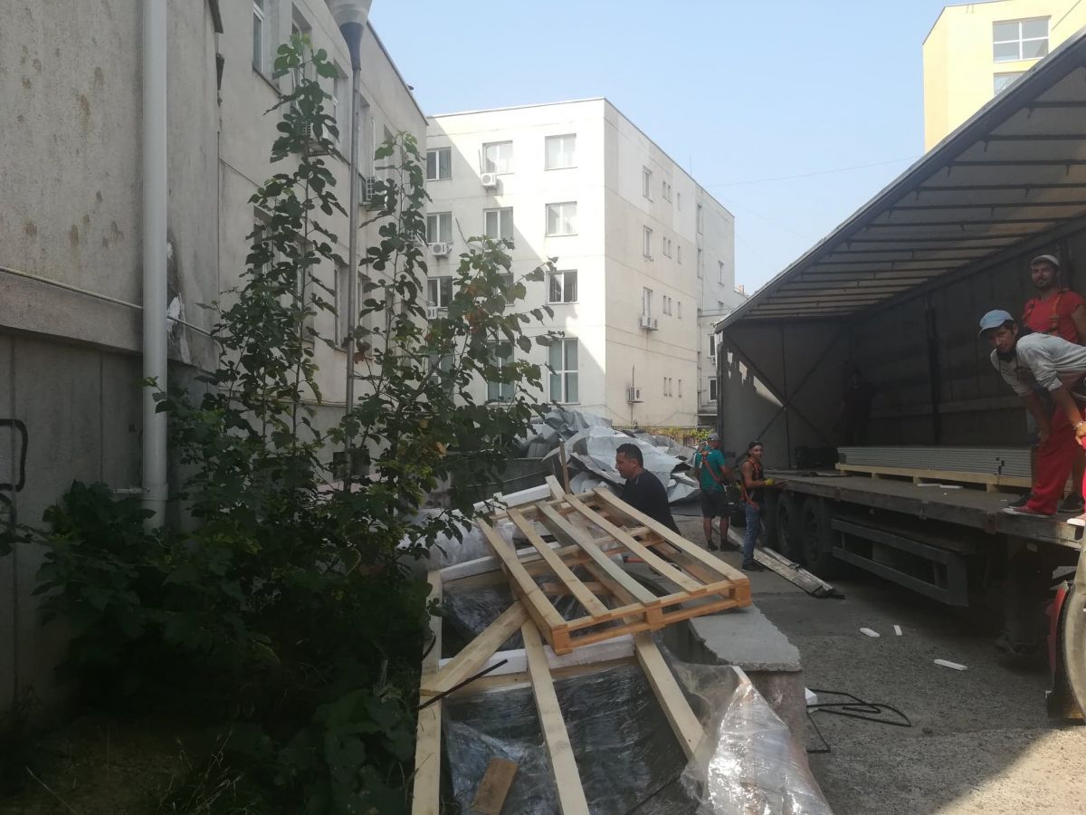 Joi, câțiva muncitori au descărcat tabla cea nouă, astfel că în curând sediul fostei Direcții a Muncii va avea un nou acoperiș.