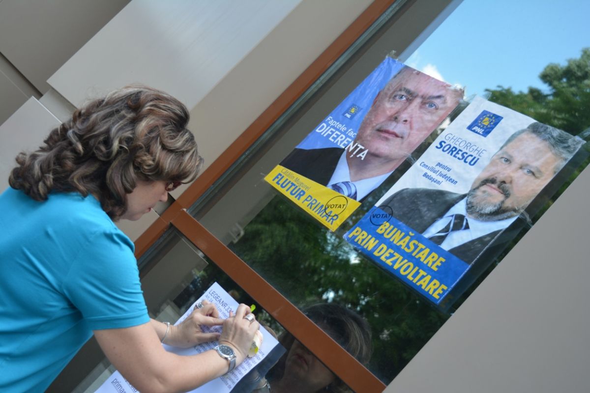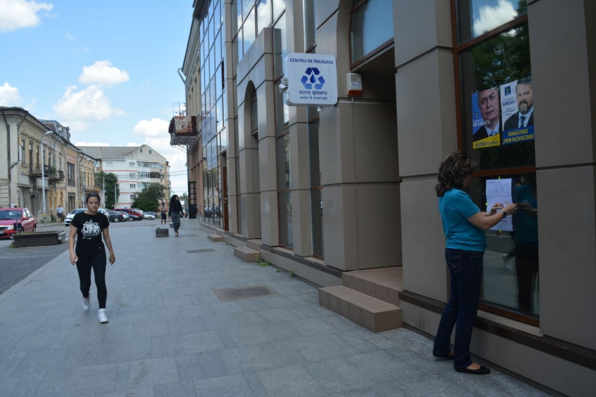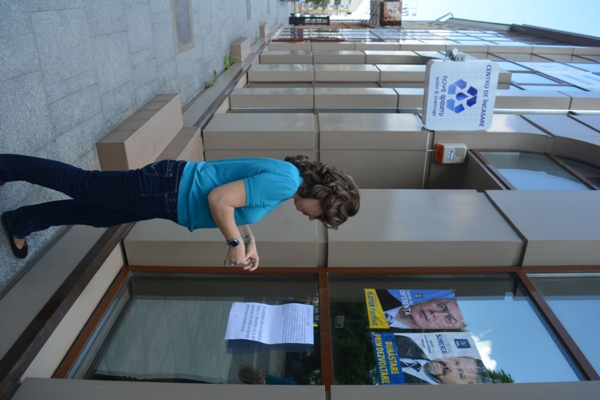 Tereza Nica s-a deplasat luni la amiază în Piaţa Centrală şi Centrul Vechi pentru a atrage atenţia asupra faptului că respectivele postere ale candidaţilor PSD şi PNL sunt puse ilegal.