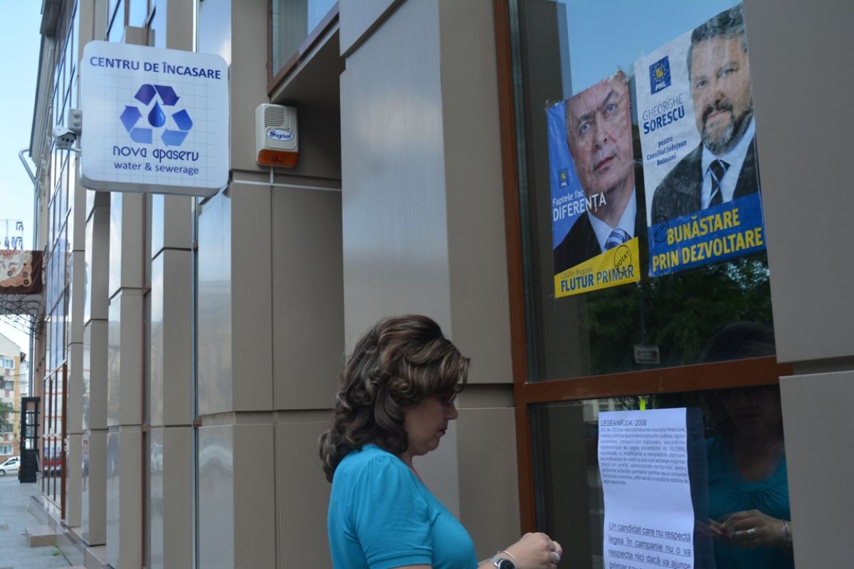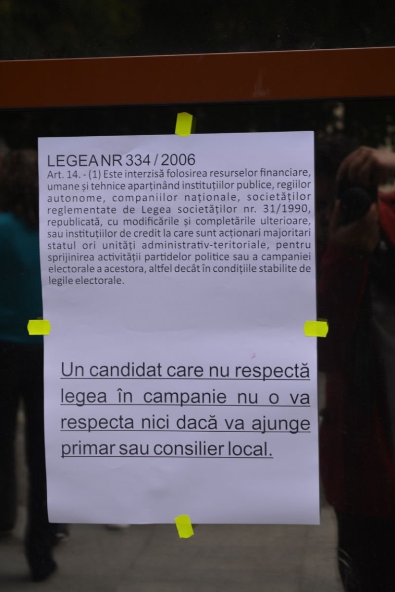 La punctul de lucru al SC Nova Apaserv SA lidera UNPR a lipit lângă afişele cu Gheorghe Sorescu şi Cătălin Flutur un extras din legea 334/2006 privind finanţarea activităţii partidelor politice şi a campaniilor electorale.