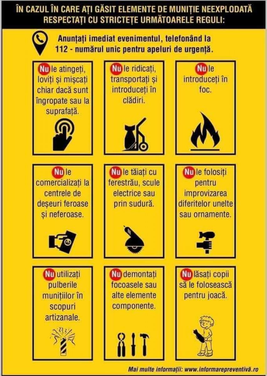 Tot ce trebuie să facă cetățenii este să apeleze numărul de urgență 112 dacă descoperă obiecte metalice cilindrice sau de altă formă ce prezintă suspiciunea că ar fi elemente de muniţie neexplodată.