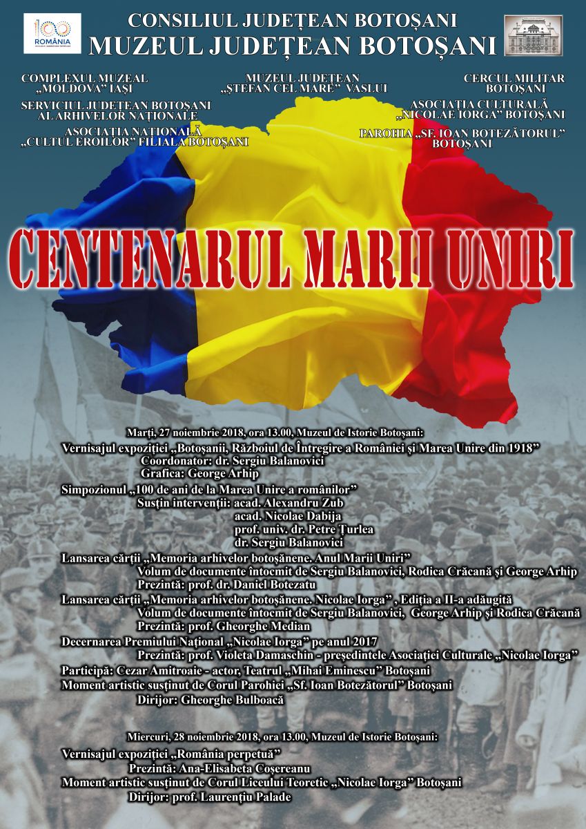 Muzeul Judeţean Botoşani organizează în zilele de 27 și 28 noiembrie 2018, în Sala Polivalentă a Muzeului Județean Botoșani o serie de manifestări dedicate Centenarului Marii Uniri.