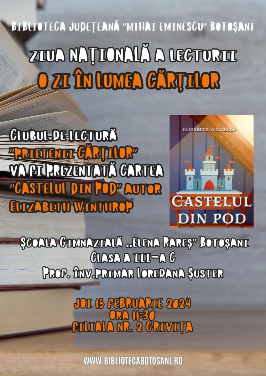 De la ora 11:30, membrii Clubului de Lectură ”Prietenii Cărților” vor citi cartea ”Castelul din Pod”, semnată de Elizabeth Winthrop. Micuții clasei a III-a C de la Școala Gimnazială ”Elena Rareș” Botoșani, coordonați de Profesor Învățământ Primar Loredana Șuster, vor păși în universul aventurilor lui William, explorând tainele și magia unui castel primit în dar.