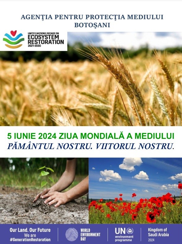 Agenţia pentru Protecţia Mediului (APM) Botoşani organizează, în această perioadă, o campanie de conștientizare și informare dedicată sărbătoririi, pe 5 iunie 2024, a Zilei Mondiale a Mediului.