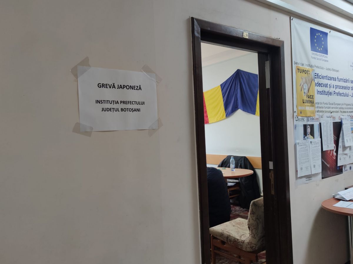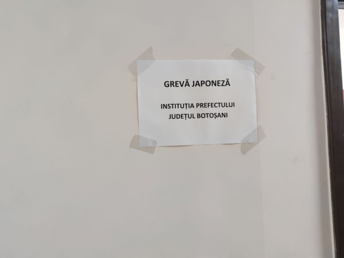 Angajații Prefecturii Botoșani din Sindicatul „Egalitatea” sunt, astăzi, în grevă japoneză. Ei solicită urgentarea adoptării proiectului legislativ care modifică legea privind salarizarea personalului plătit din fonduri publice și trecerea personalului angajat în prefecturi din categoria funcțiilor teritoriale în cea a funcțiilor de stat.