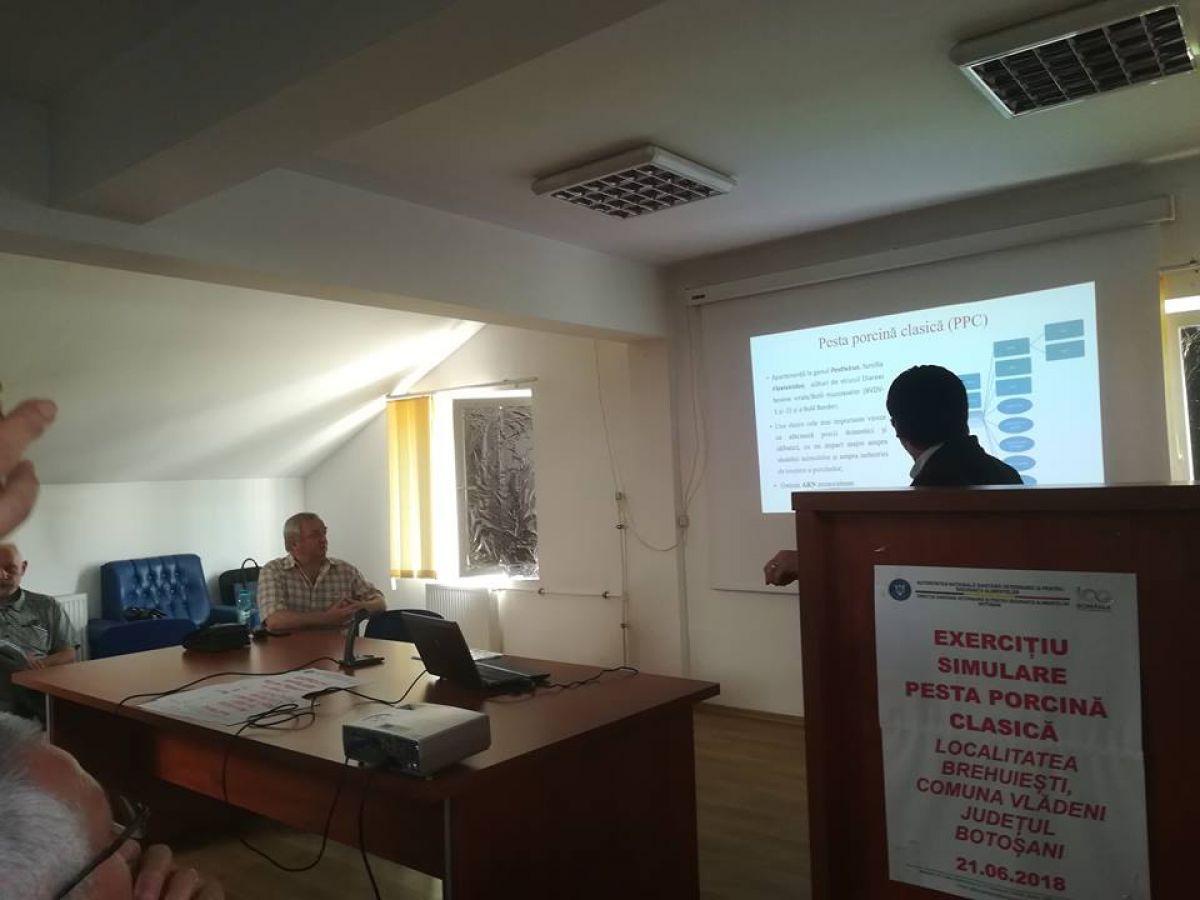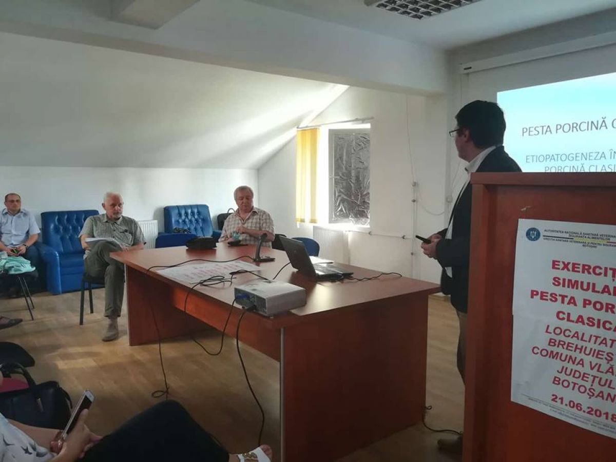 Întâlnirea are loc la sediul Direcției Sanitar Veterinar și pentru Siguranța Alimentară și asta, pentru că aici, se va desfășura un exercițiu de simulare a pestei porcine clasice. La instituția menționată va avea loc doar partea teoretică, care este prezentată de trei medici veterinari veniți de la Iași.