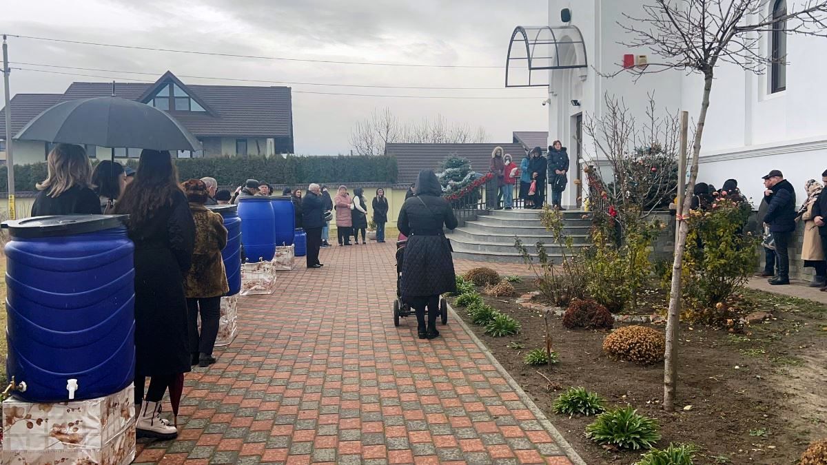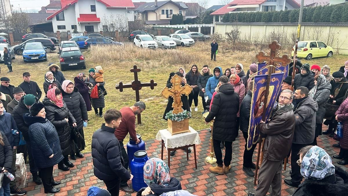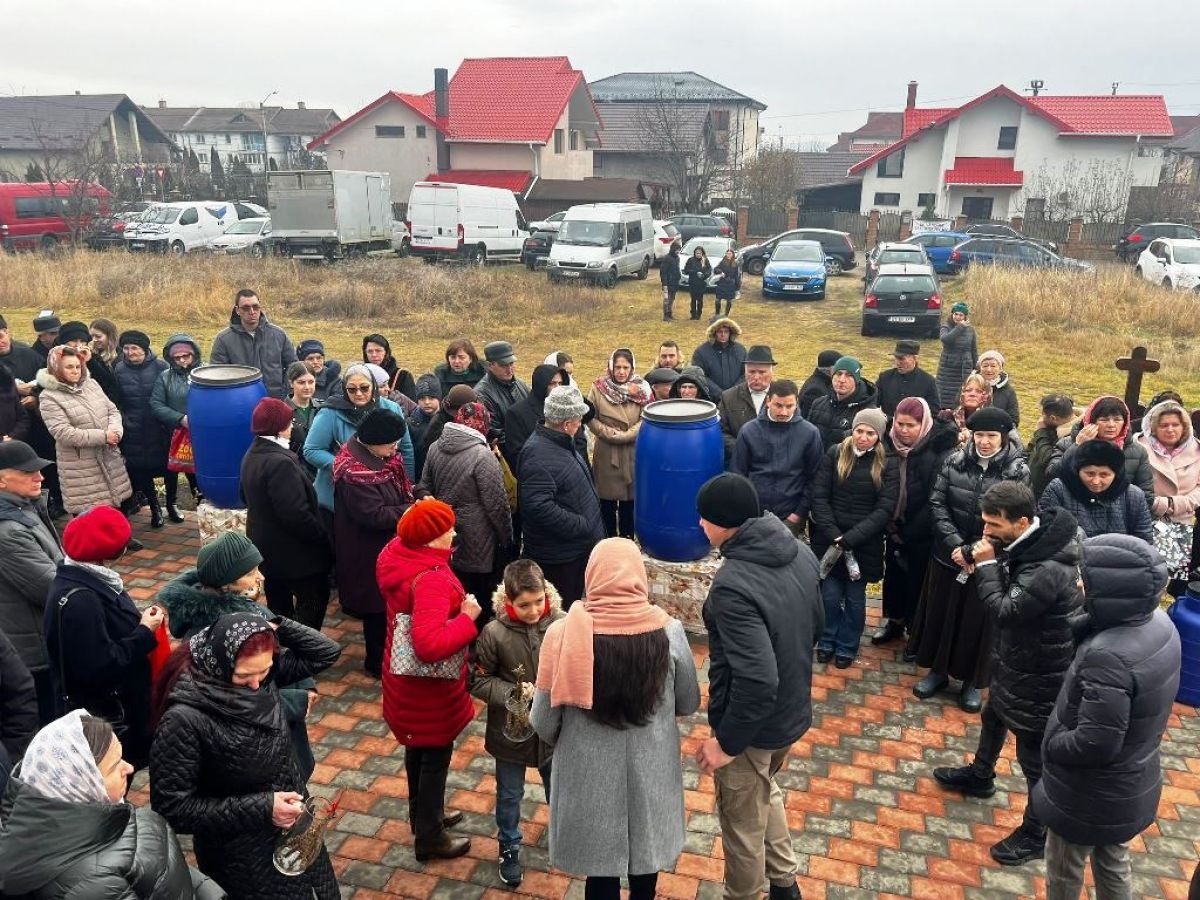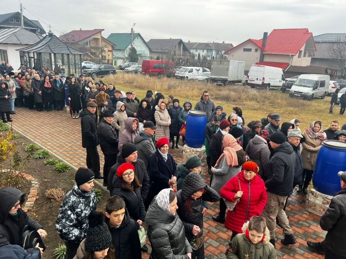 În mâini au căni și sticle pentru a lua apa sfințită, în curte fiind de altfel pregătite de către biserică recipiente uriașe din plastic.