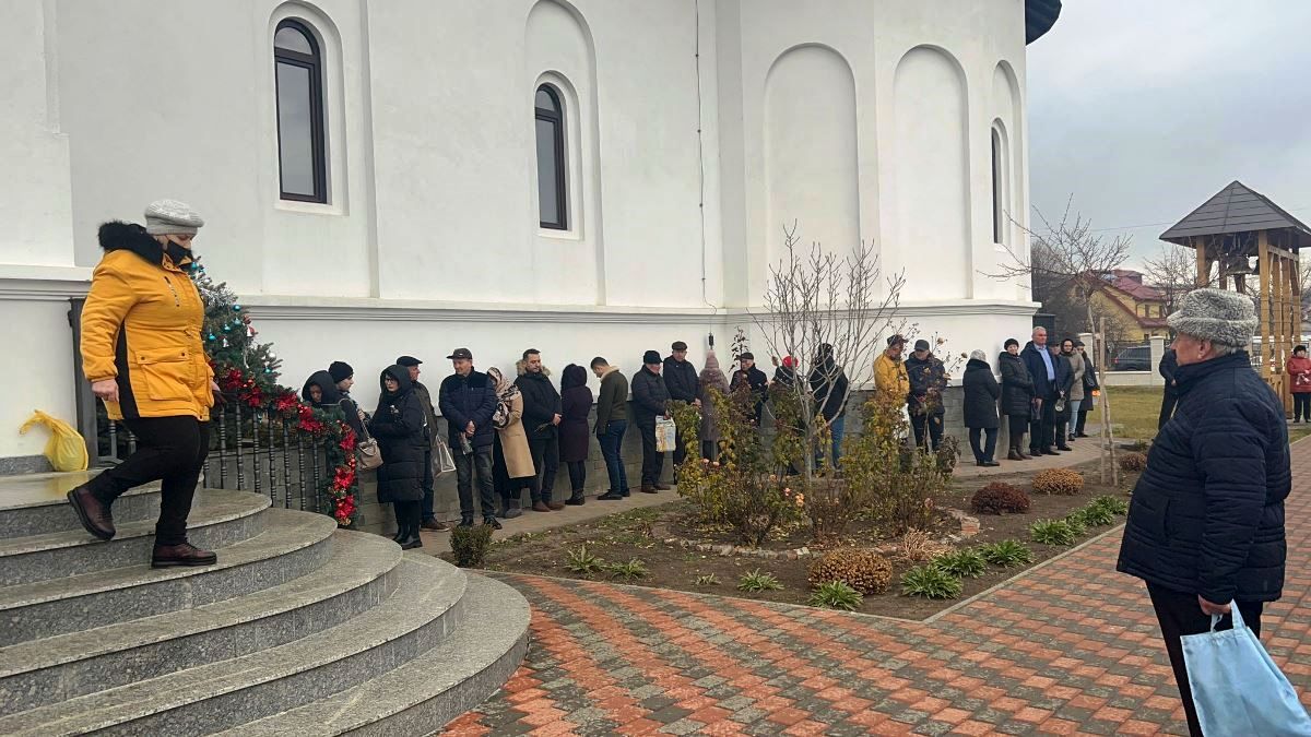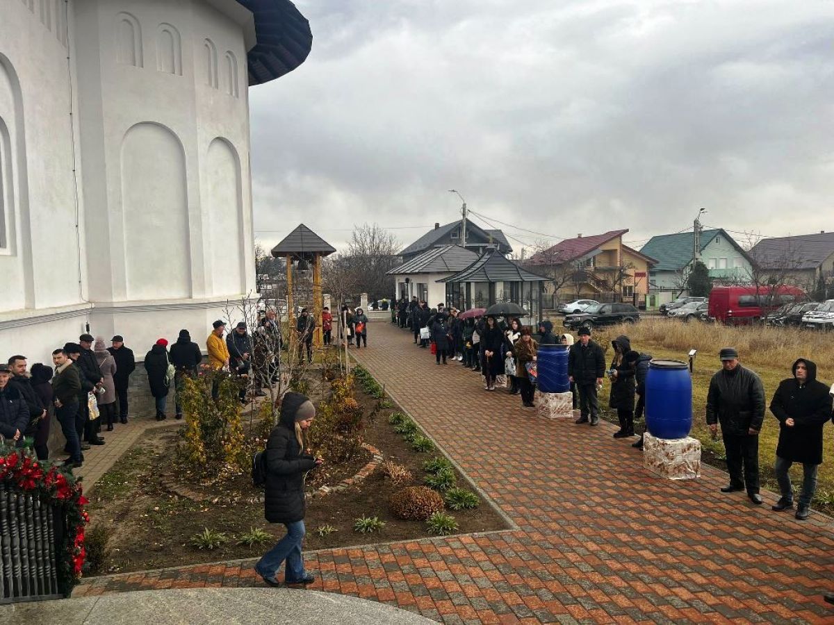 În ciuda ploii care a început să cadă, credincioșii continuă să vină spre lăcașul de cult și să se așeze afară, la rând, mulți adăpostindu-se sub umbrele.