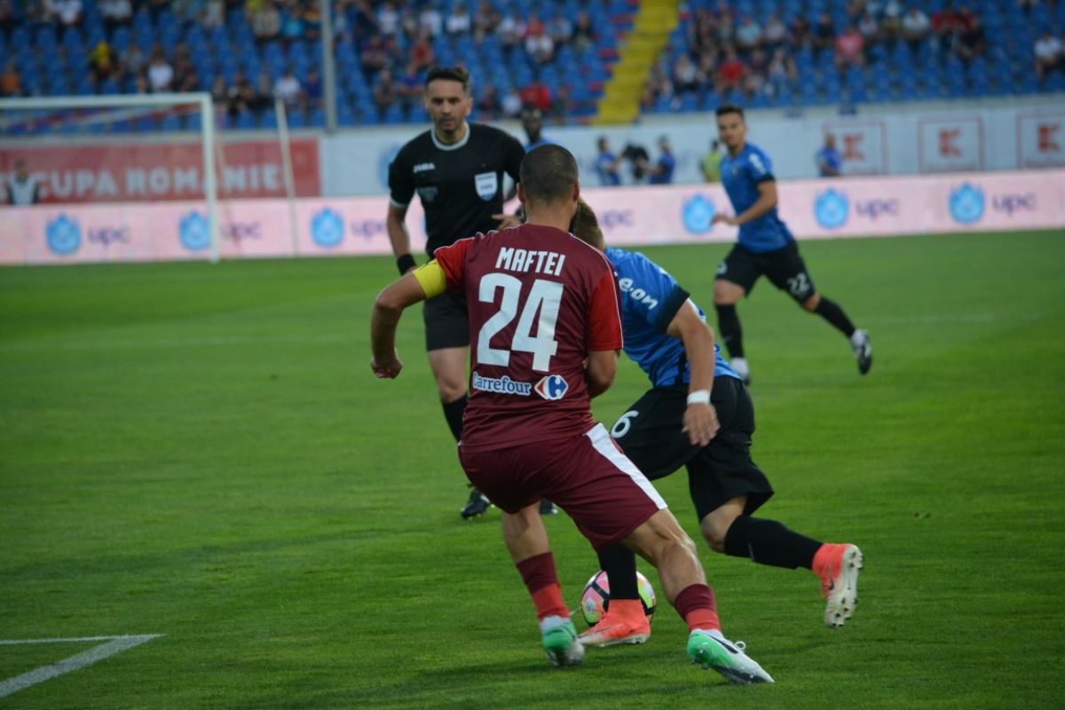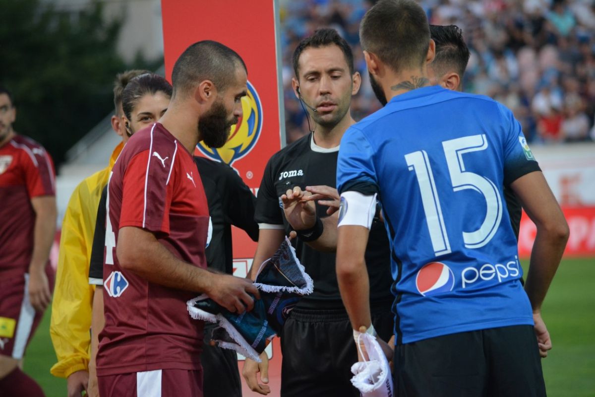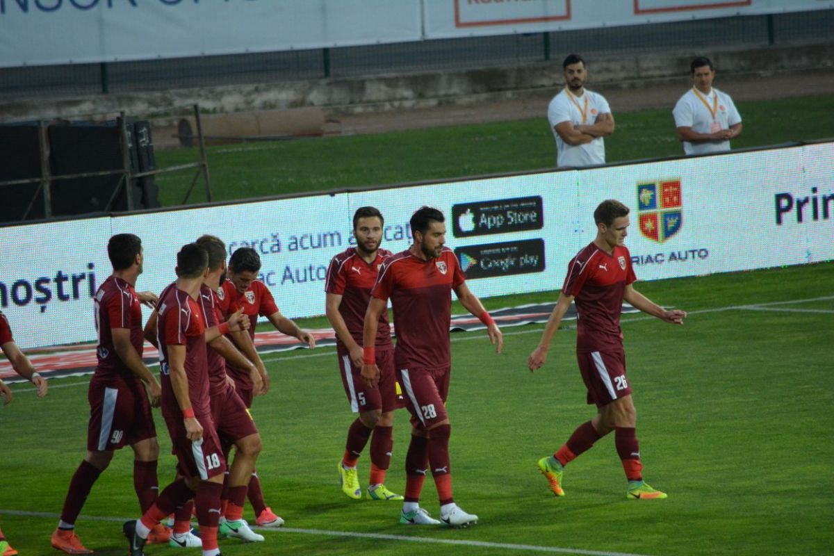 În minutul 40 ilfovenii conduc cu 1 - 0, iar dobrogenii evoluează cu un jucător mai puţin după eliminarea lui Vână.