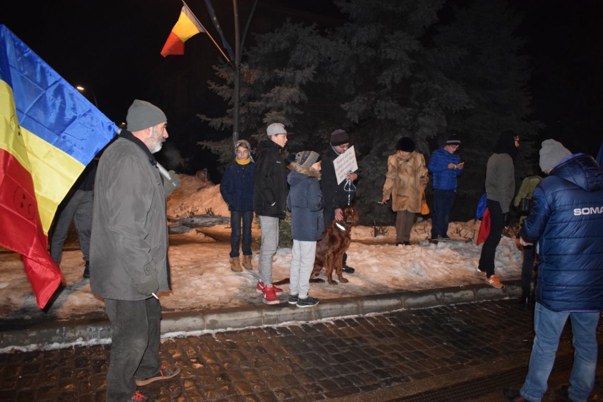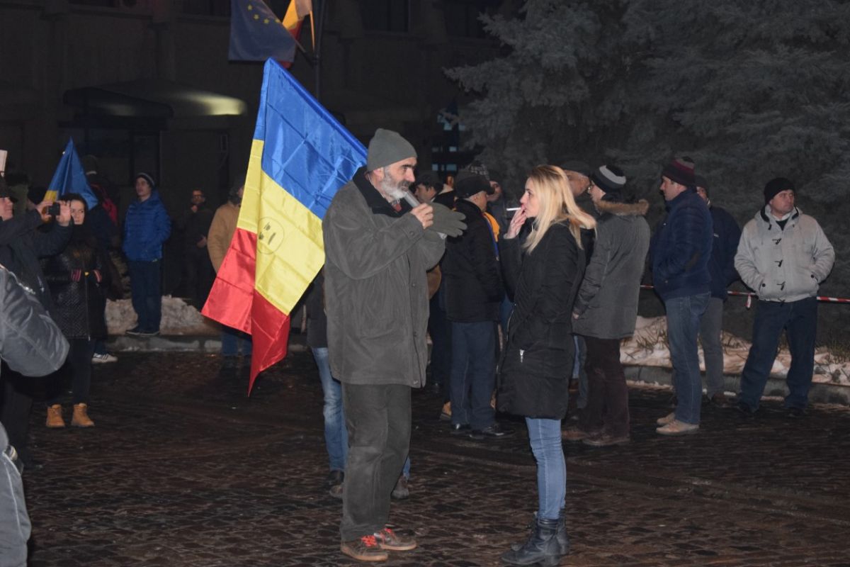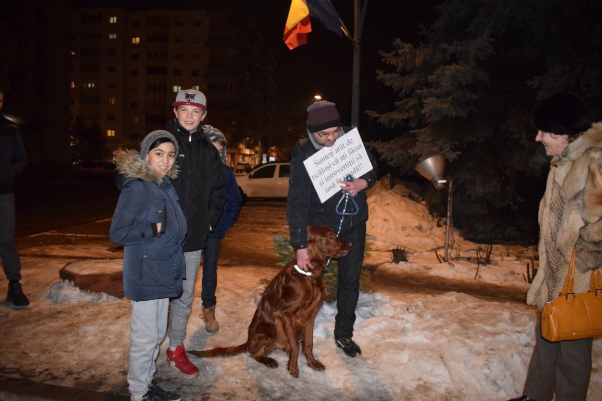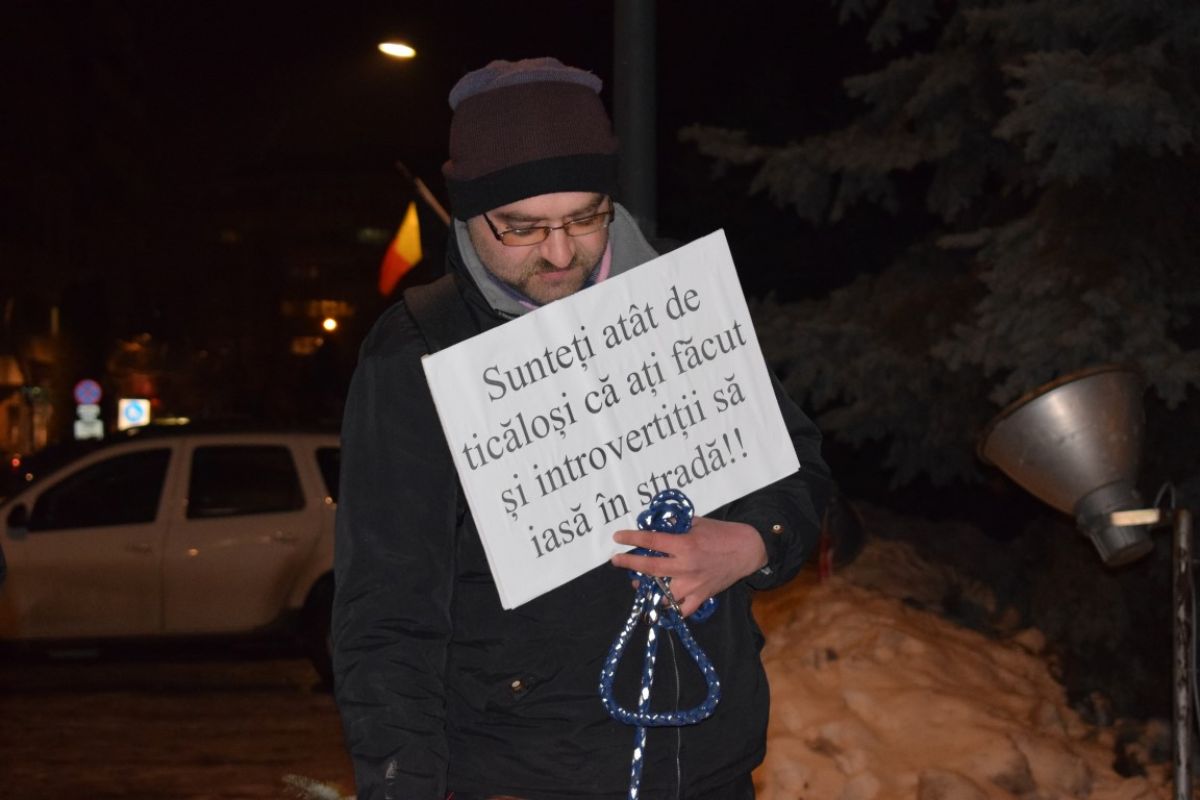 Ușor, ușor însă piața a început să se umple de oameni, parte care au fost și seara trecută, alții noi. Un domn a ieșit cu câinele de companie, altul decât în prima zi și cu un mesaj original care i-a amuzat pe ceilalți participanți : ”Sunteți așa de ticăloși că ați făcut și introvertiții să iasă în stradă”.