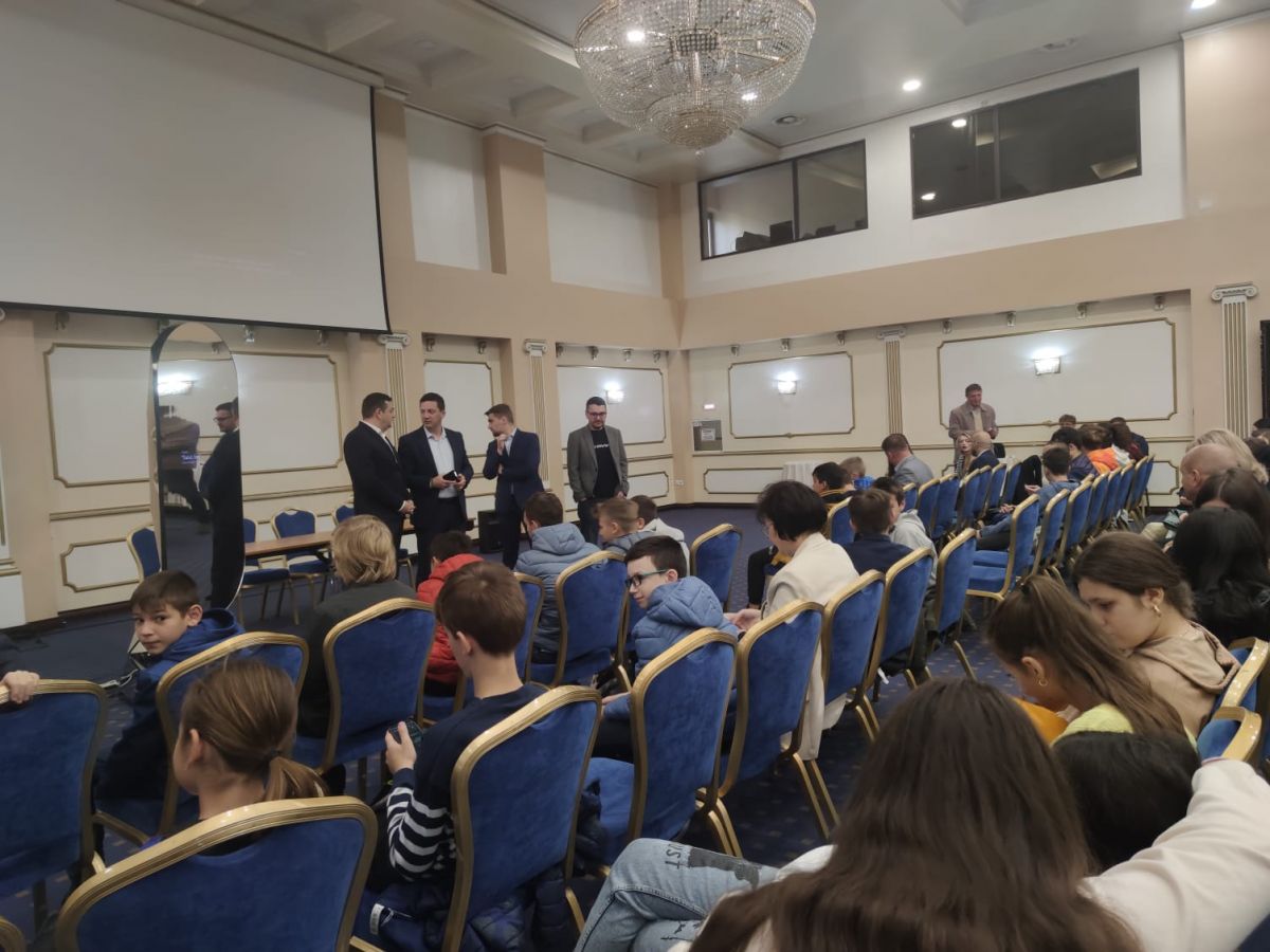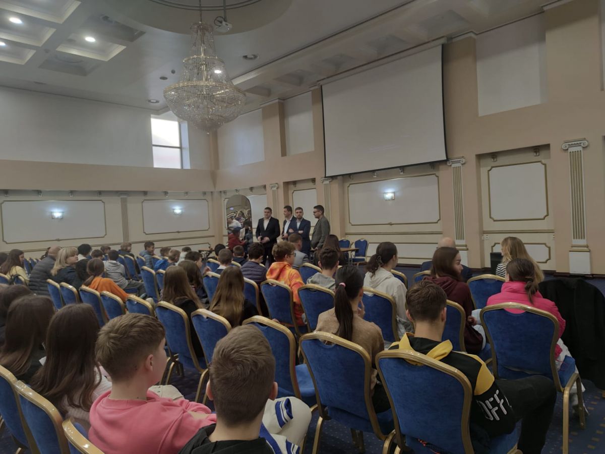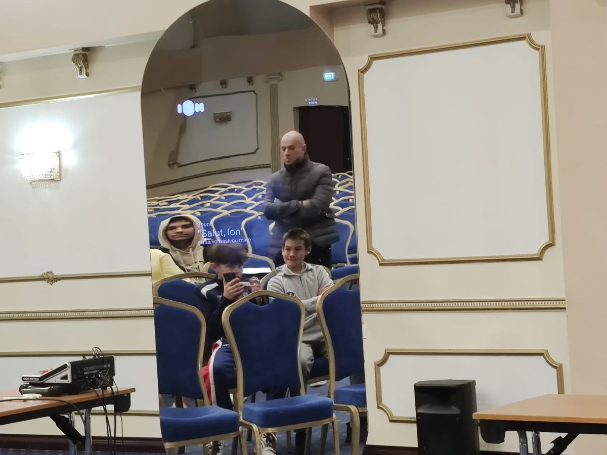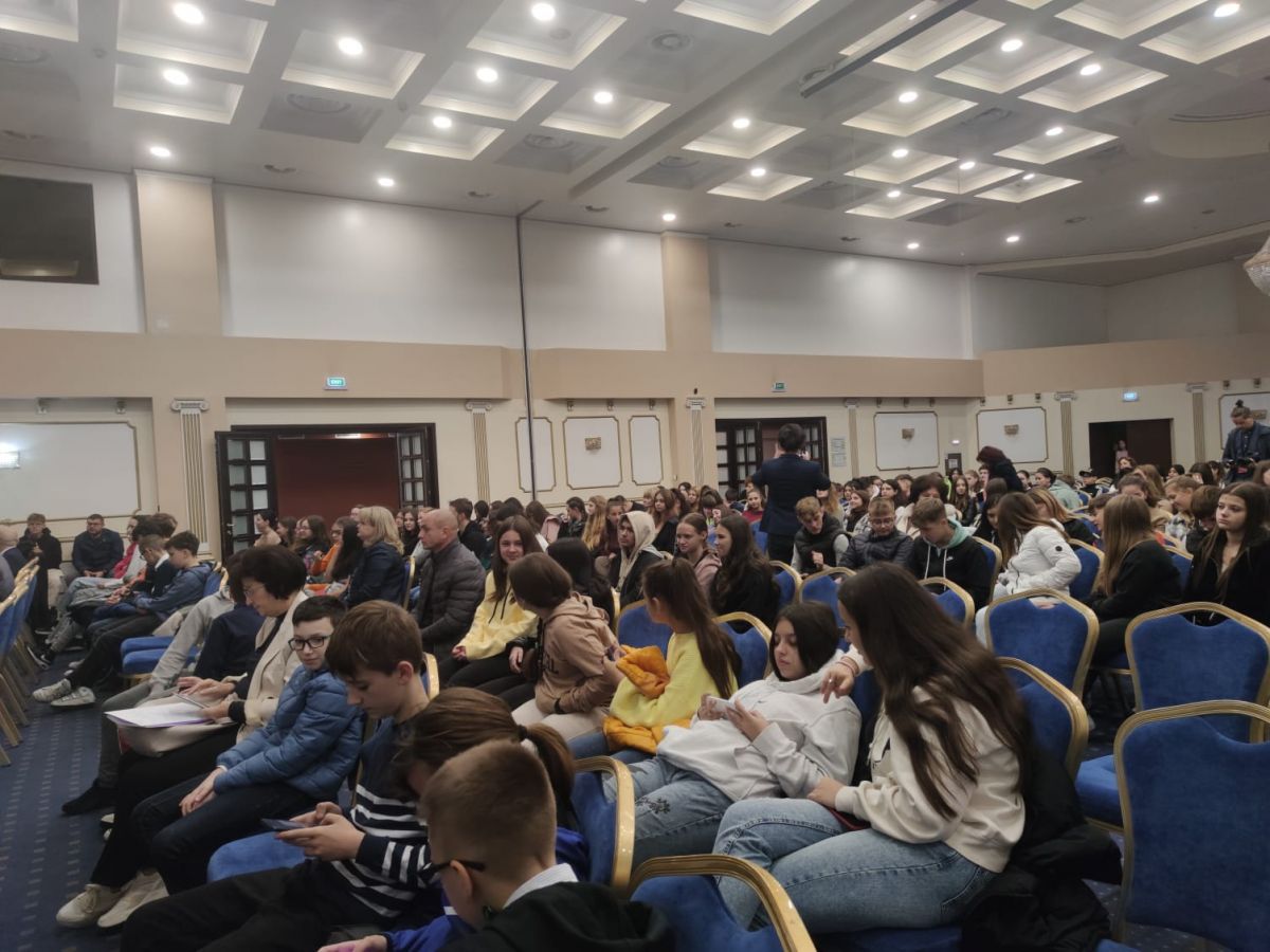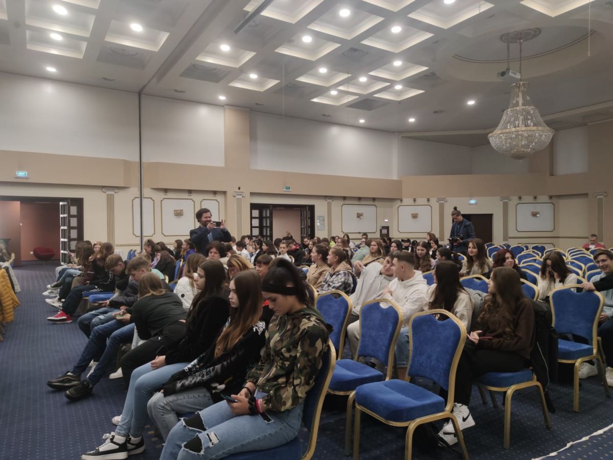 În sala Eminescu a Hotelului Rapsodia se află în jur de 300 de elevi de liceu și o gimnaziu din municipiu.