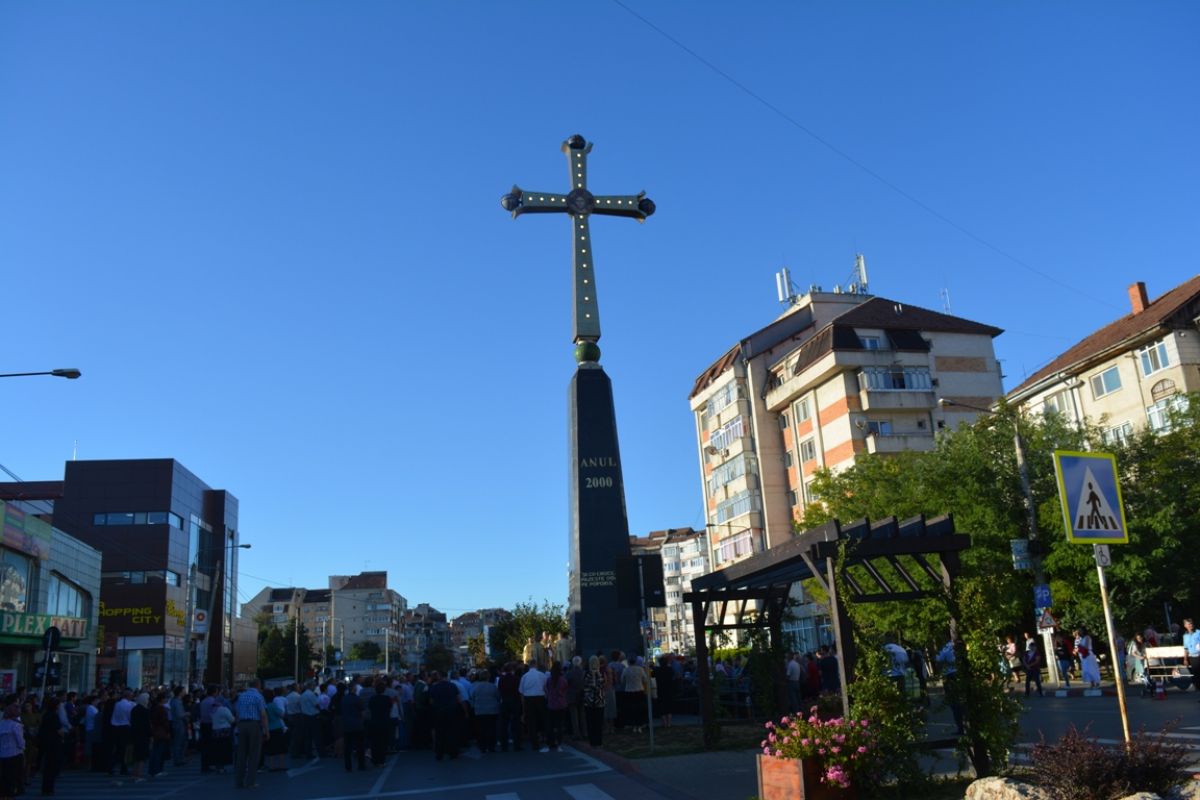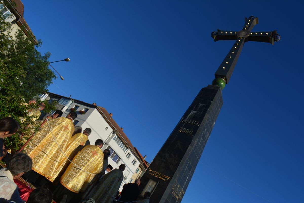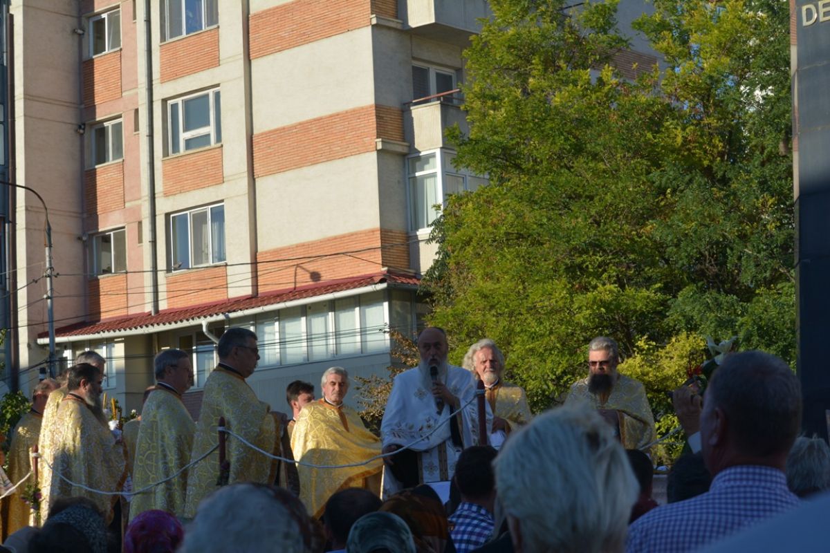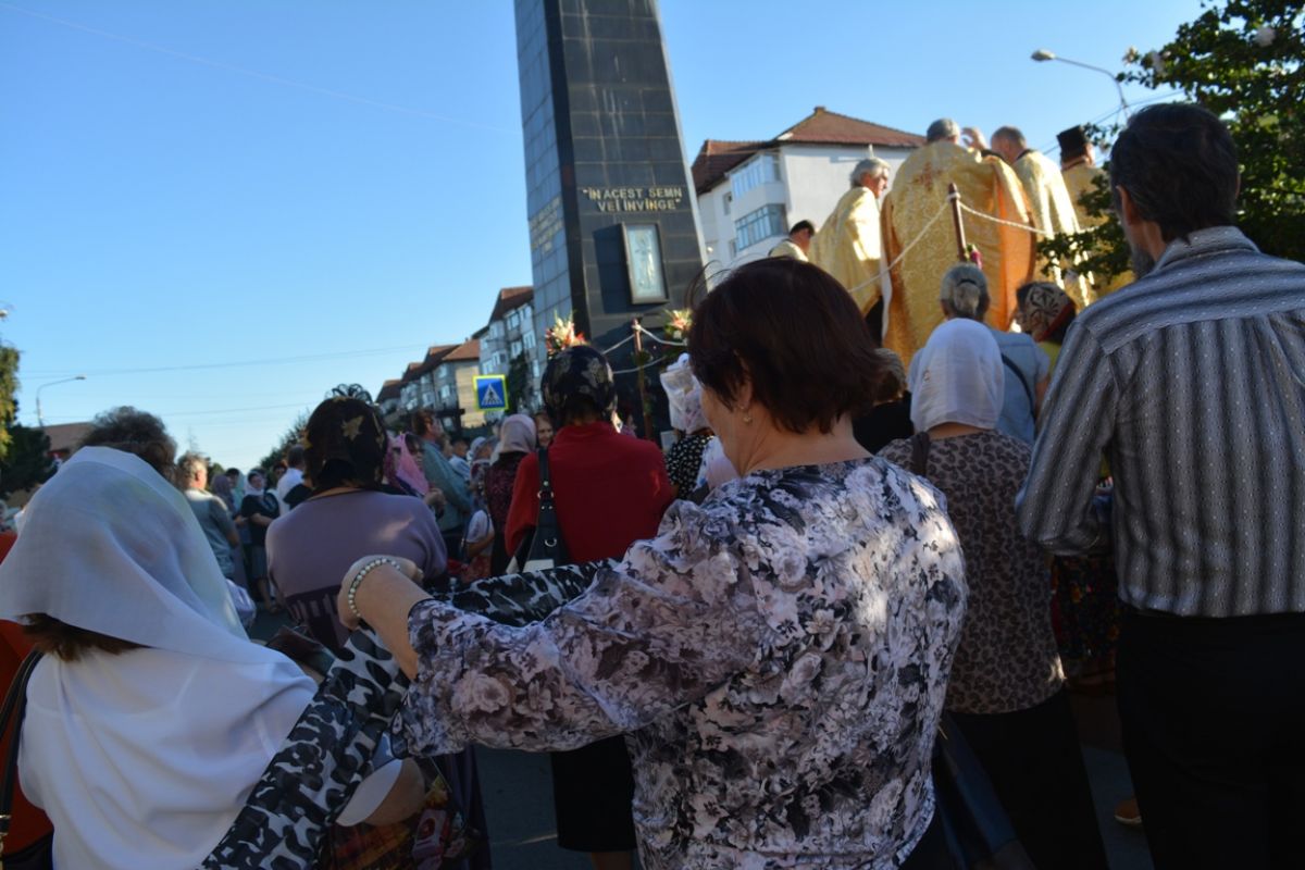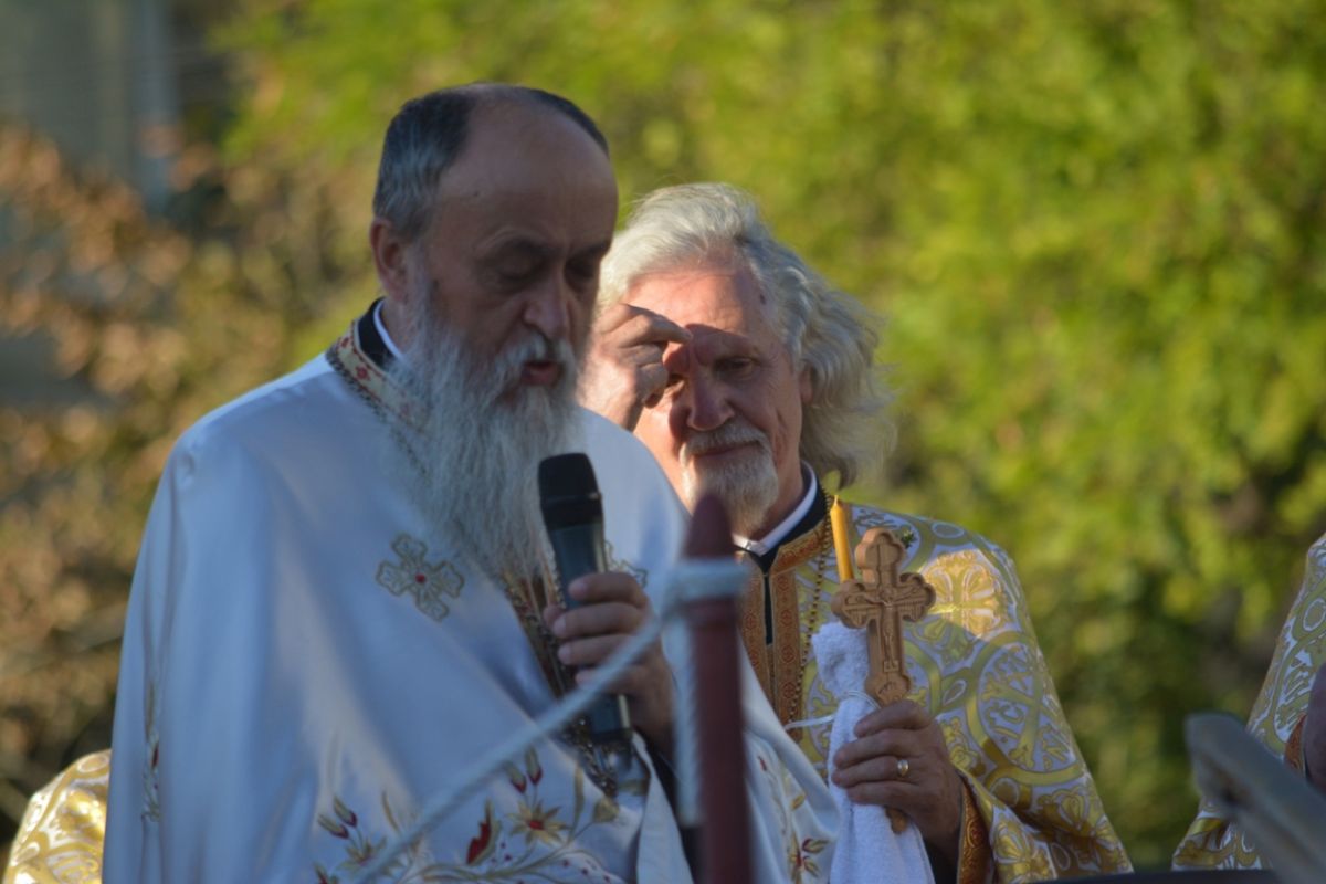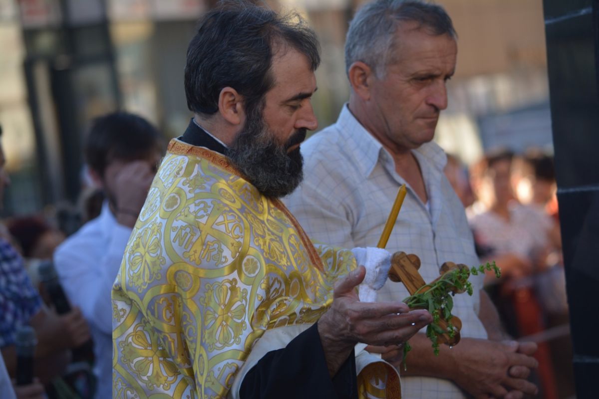 Un sobor format din peste zece preoţi, condus de părintele protopop Lucian Leonte, oficiază slujba închinată Înălţării Sfintei Cruci.