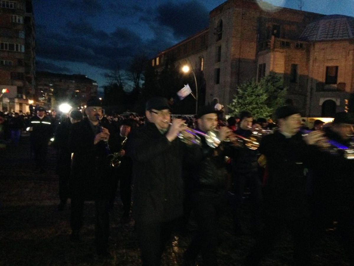 În urmă cu puțin timp, militarii cu torțele în mână au ajuns în Piața Revoluției, chiar în timpul concertului susținut de orchestra Rapsozii Botoșanilor.