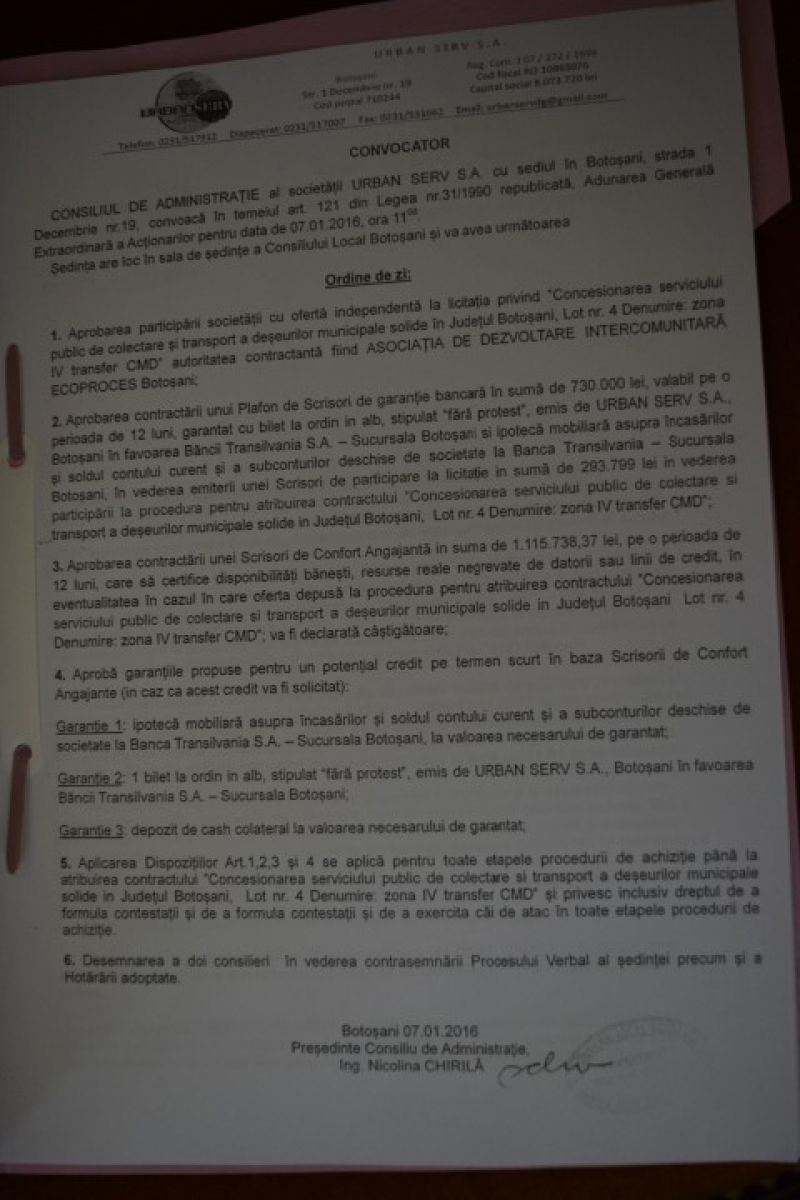 S-a luat decizia ca în primă fază să fie luate în dezbatere punctele aflate pe ordinea de zi a ședinței adunării acționarilor pentru societatea de salubrizare Urban Serv care cere acceptul să participe la licitația organizată de Consiliul Județean pentru colectarea deșeurilor pe cele cinci zone ale județului.