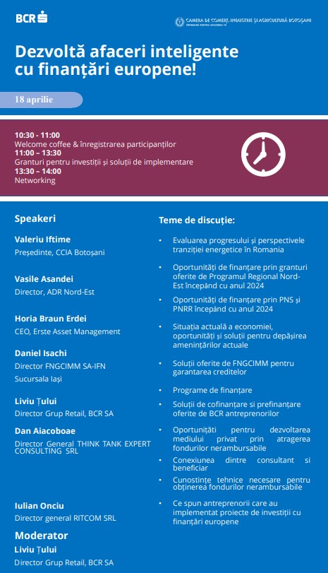 Este vorba despre o sesiune de informare privitoare la dezvoltarea de noi afaceri inteligente prin finanțări europene.