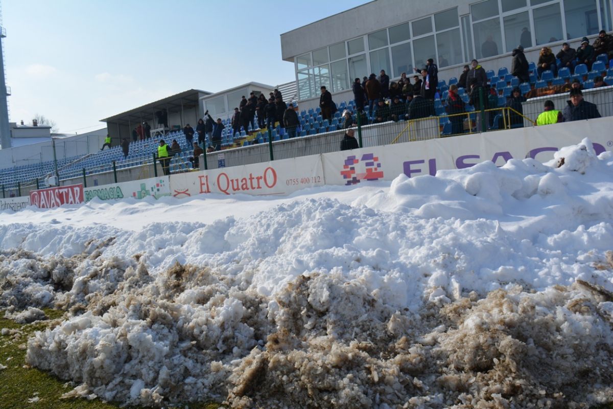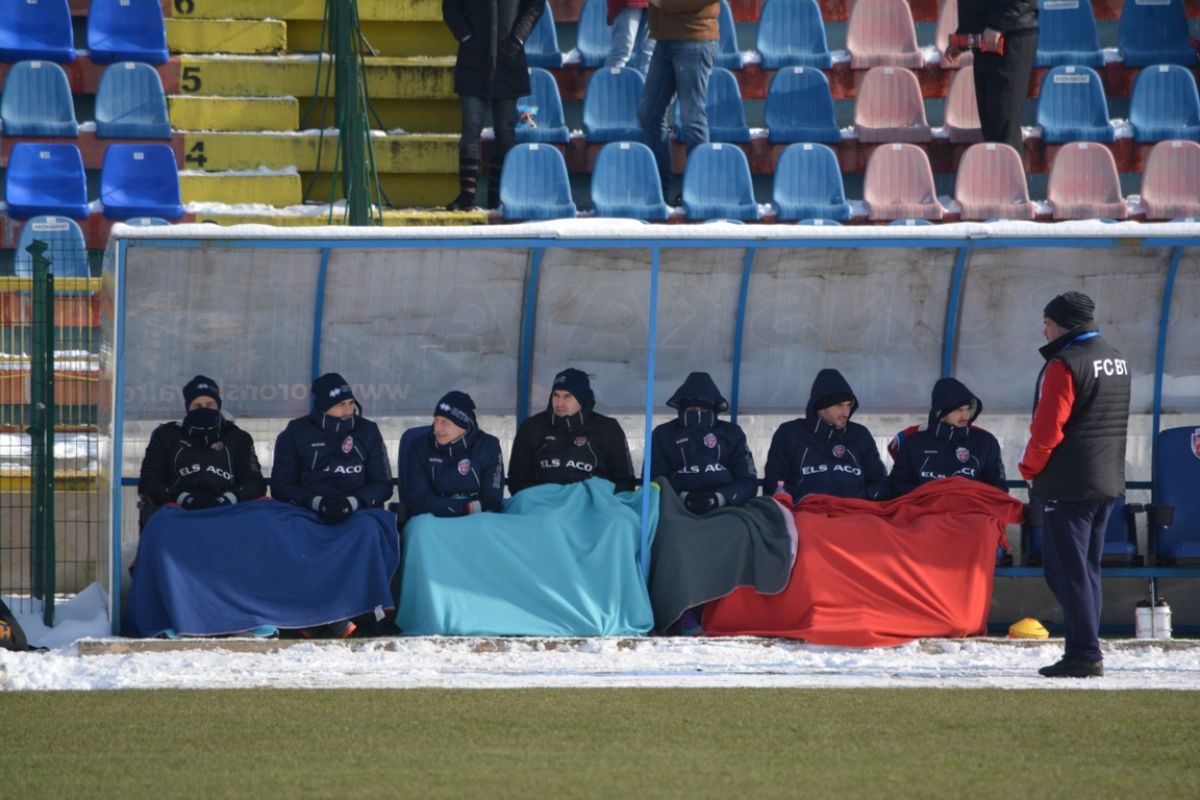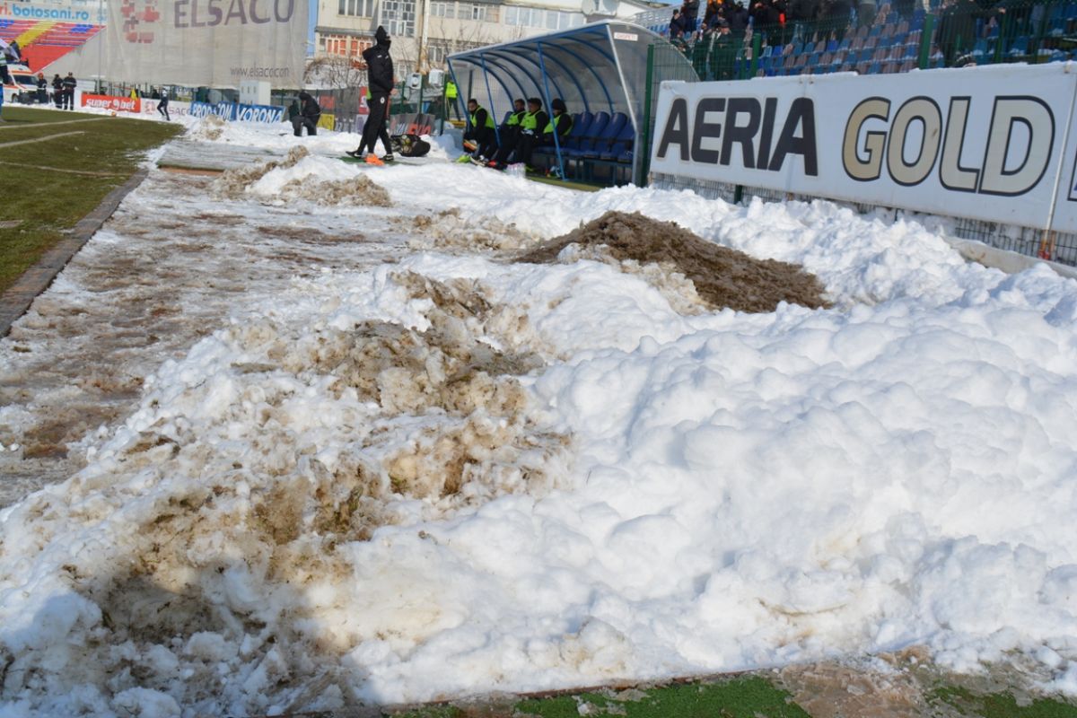 Confruntarea începută la ora 14:00 se dispută într-un decor hibernal. Grămezi mari de zăpadă înconjoară suprafaţa de joc, care s-a înmuiat, fotbaliştii având serioase probleme în a-şi menţine echilibrul. Asta în timp ce rezervele stau pe bancă acoperite cu pături.