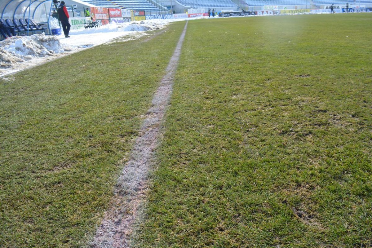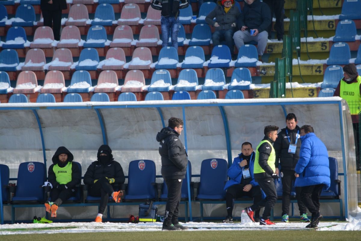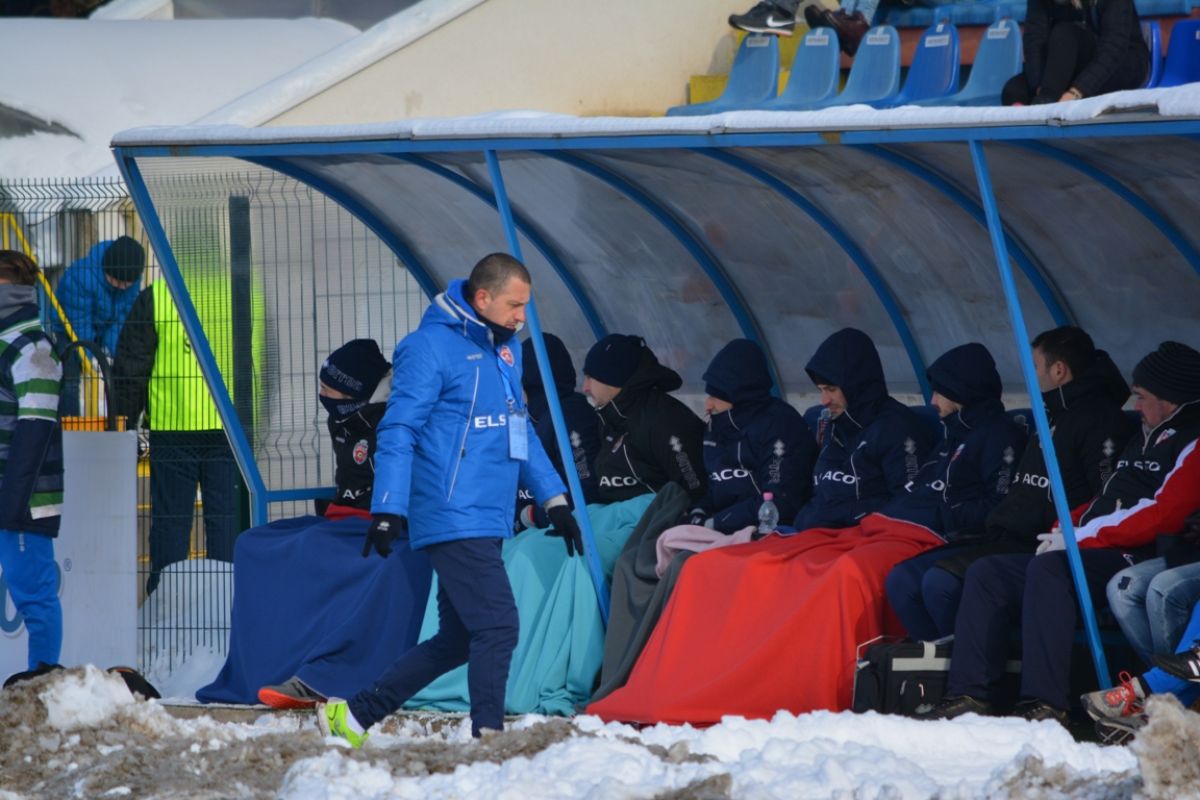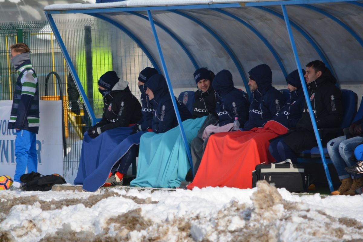 Confruntarea începută la ora 14:00 se dispută într-un decor hibernal. Grămezi mari de zăpadă înconjoară suprafaţa de joc, care s-a înmuiat, fotbaliştii având serioase probleme în a-şi menţine echilibrul. Asta în timp ce rezervele stau pe bancă acoperite cu pături.