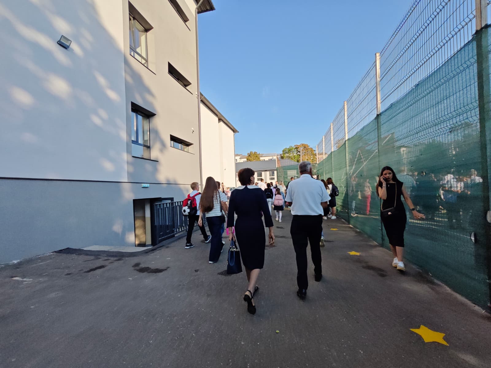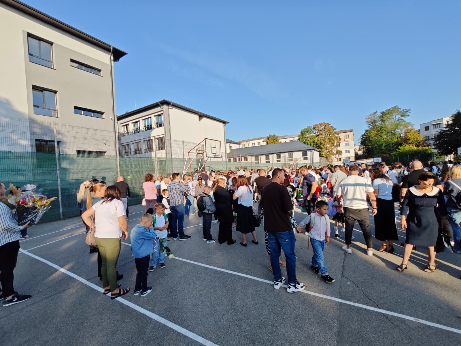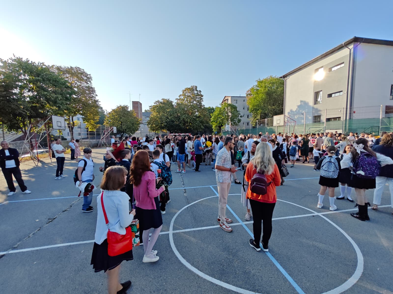 Sunt adunați aici sute de elevi, părinți și profesori pentru a marca începerea unui nou an școlar.