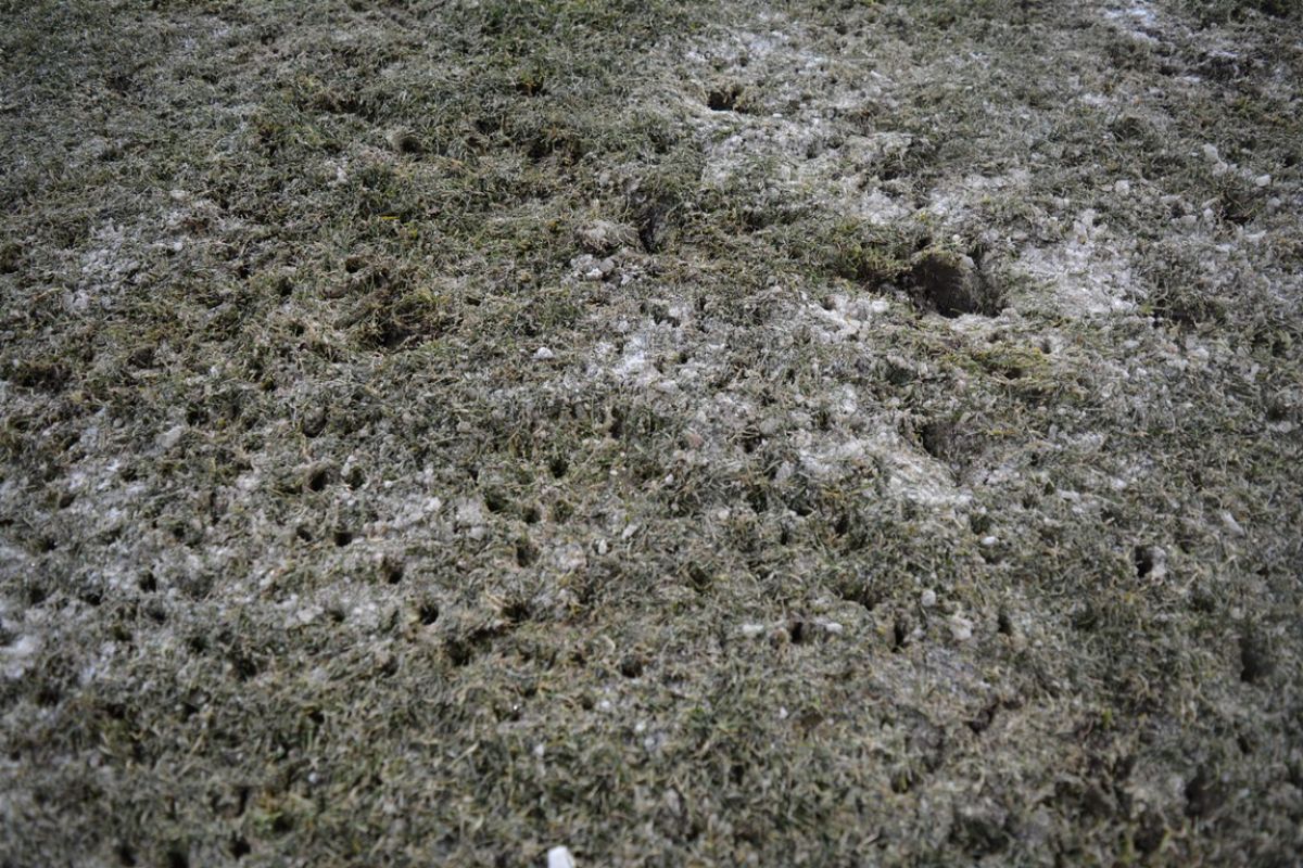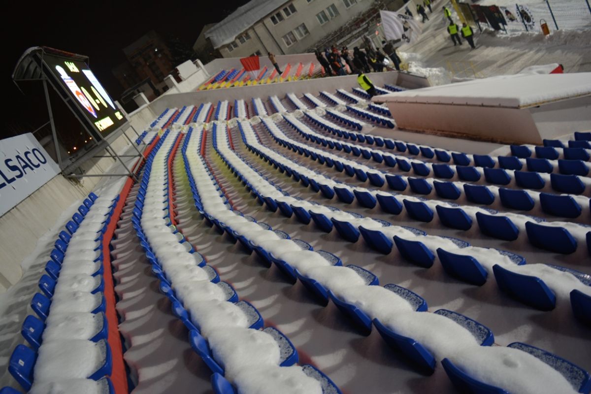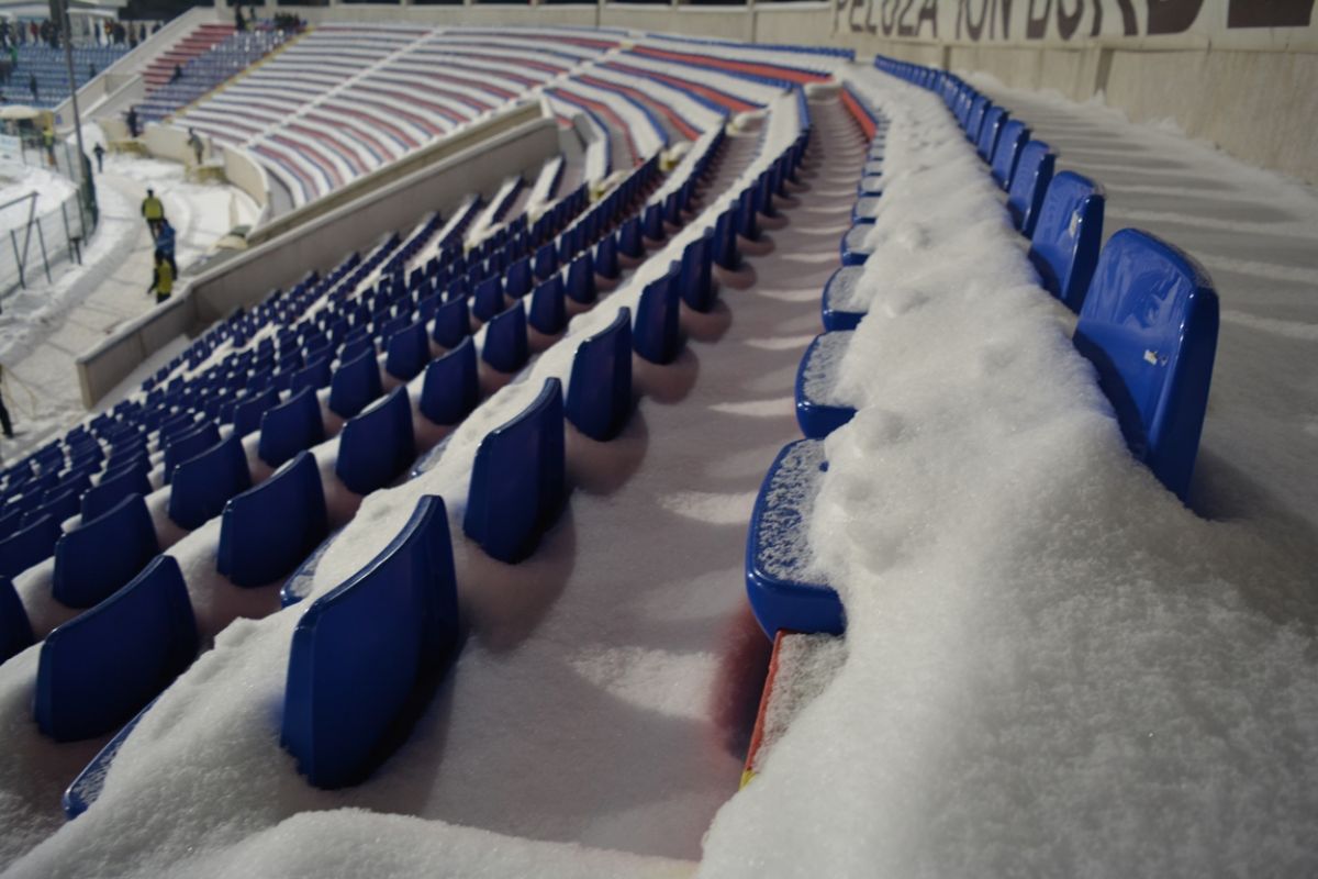 S-au degajat de zăpadă cele două tribune, în timp ce ambele peluze sunt pline cu nămeți. Pista de atletism are grămezi masive de zăpadă.