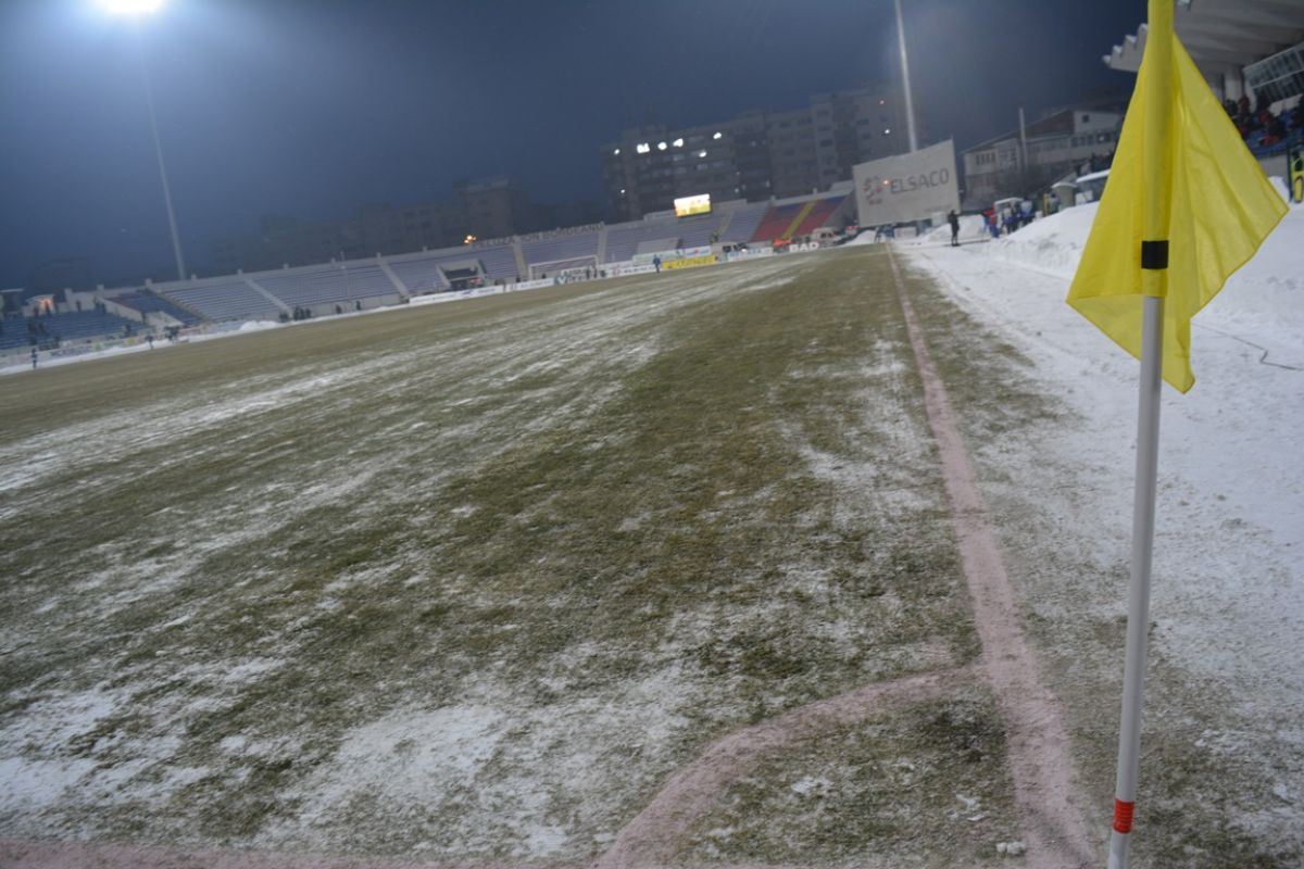 Și asta într-un decor hibernal. După zile întregi de muncă s-a reușit degajarea gazonului, care mai are ceva urme de zăpadă și care arăta ca o sită cu găuri groase din cauza combinației zăpadă – gheață – instalație de încălzire – crampoane. Jucătorii au dificultăți în a-și menține echilibrul, spectacolul fotbalistic având serios de suferit. Pe cel două bănci tehnice jucătorii de rezervă stau înveliți cu pături, iar în tribunele Stadionului Municipal se află cel mult 1.000 de spectatori care pe o asemenea vreme s-au încumetat să iasă din case și să plătească 20 de lei pe un bilet. De altfel, o singură casă era deschisă, la o alta pe geam încă fiind lipit anunțul de la partida precedentă, cu Concordia Chiajna.