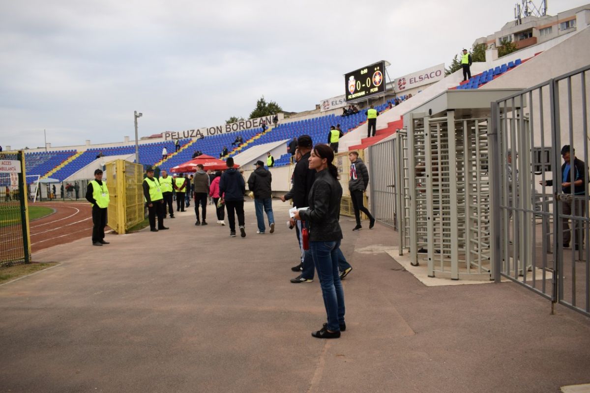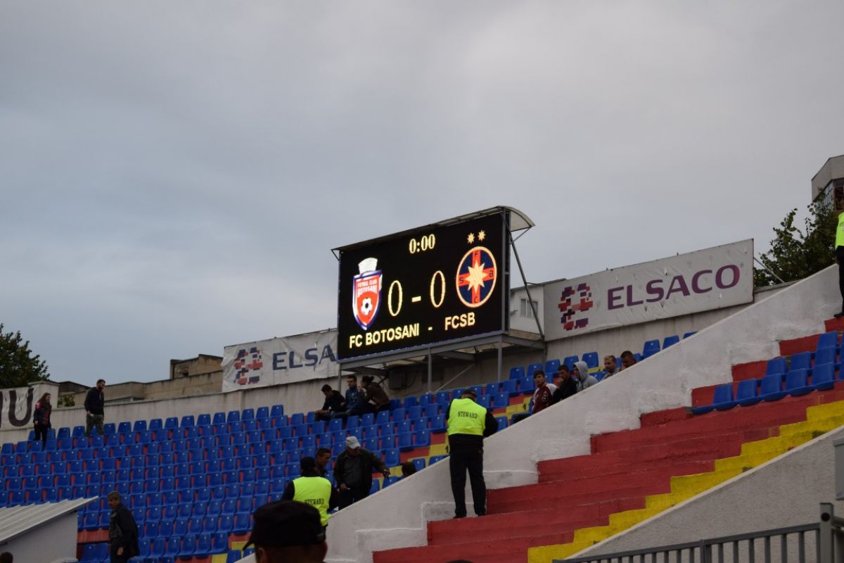 În interior, peluzele și tribunele sunt încă goale, în ciuda apelurilor făcute de organizatori. Cel mai probabil suporterii au amânat venirea pe arenă din cauza vremii ploioase. Dată fiind notorietatea acestei întâlniri sportive, la Peluza Sud a apărut un banner uriaș cu principalul sponsor al echipei – Primăria și Consiliul Local Botoșani. Asta după ce, trei ani de zile, cea mai mare reclamă a avut-o Elsaco.