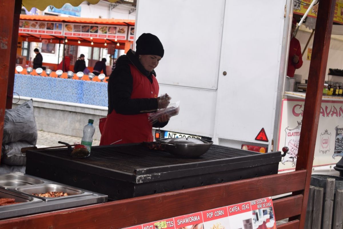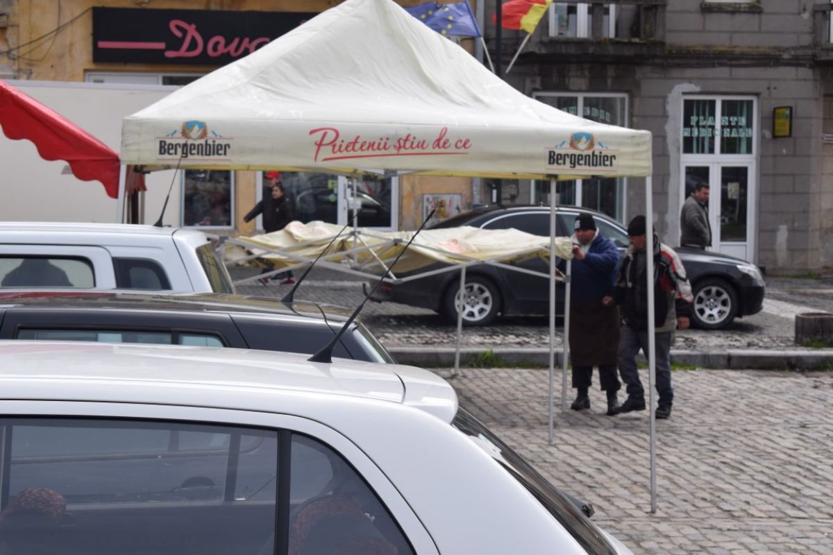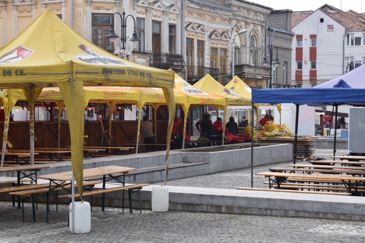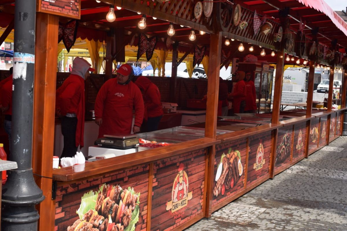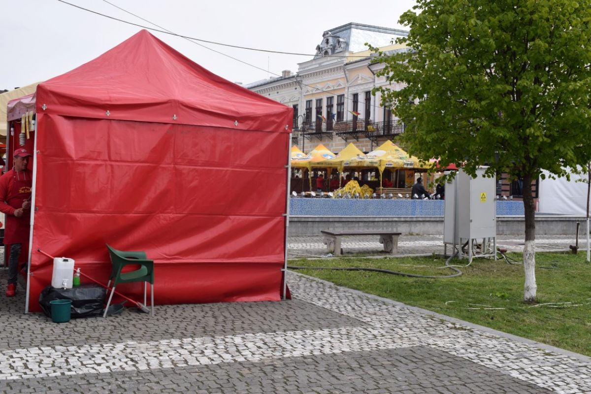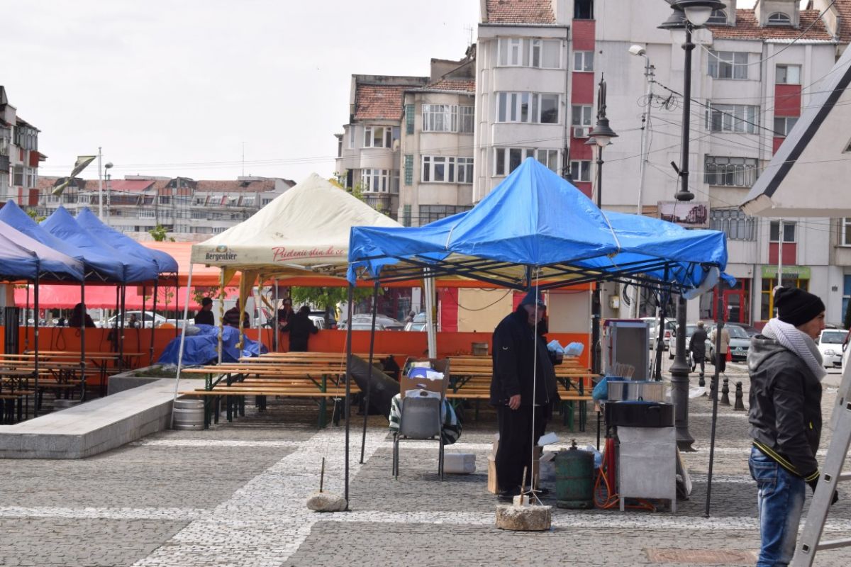 Parcă și vremea s-a îmbunat și un soare călduț a învăluit oamenii care, înfofoliți lucrează la scenă sau la terasele din perimetrul alocat acestui eveniment. Vântul strică puțin planurile comercianților, mai ales a celor care au aprins deja focul la grătare și au gătit primii mici sau grătare din carne de porc și pui.