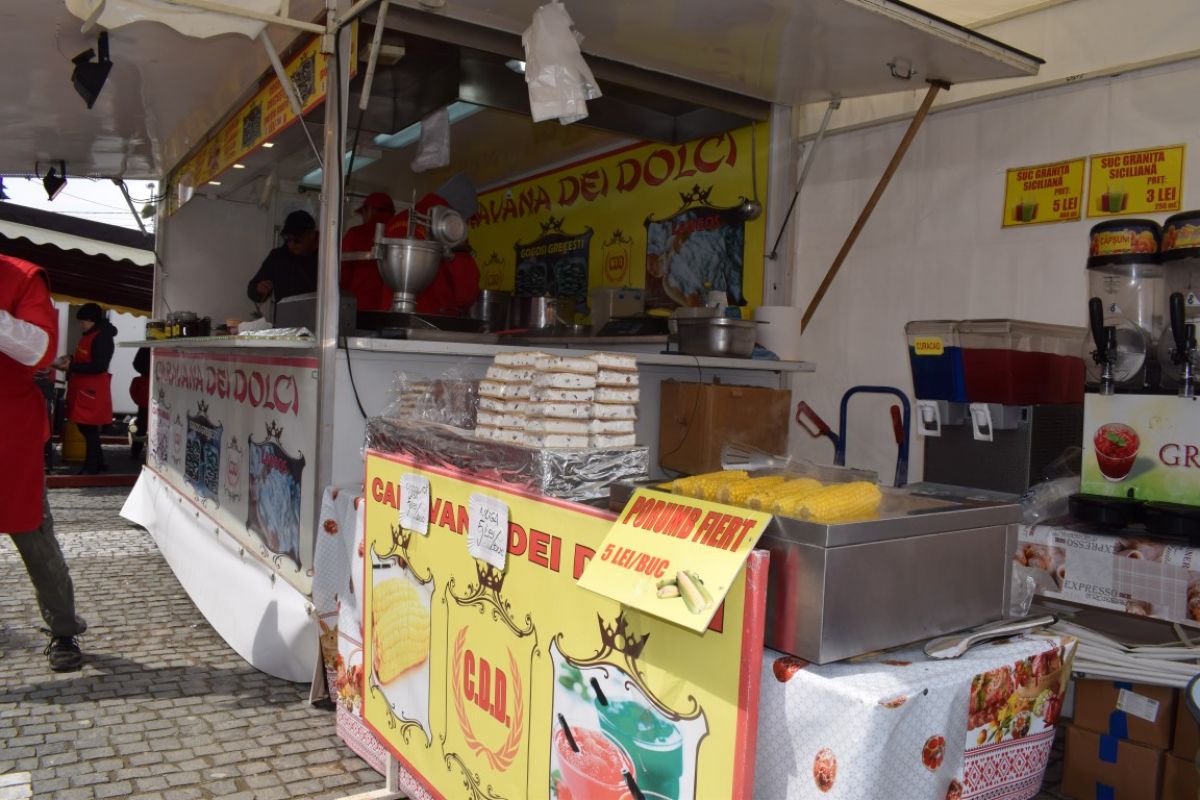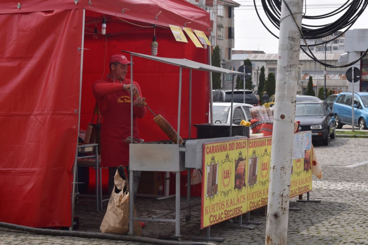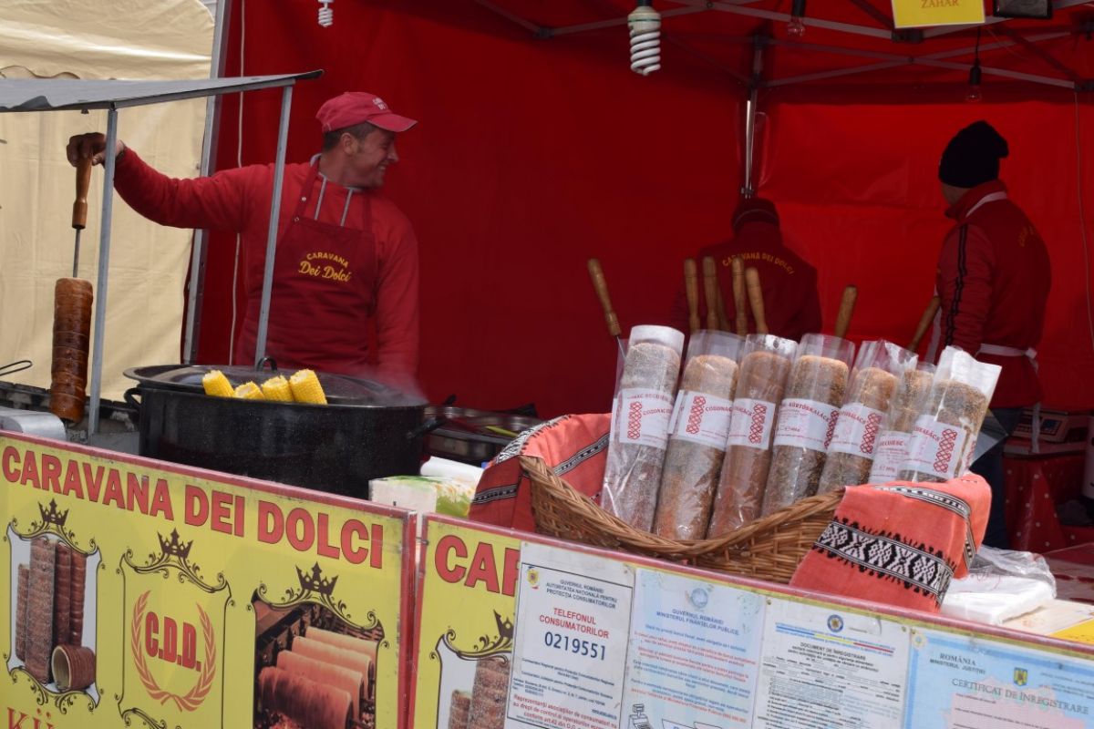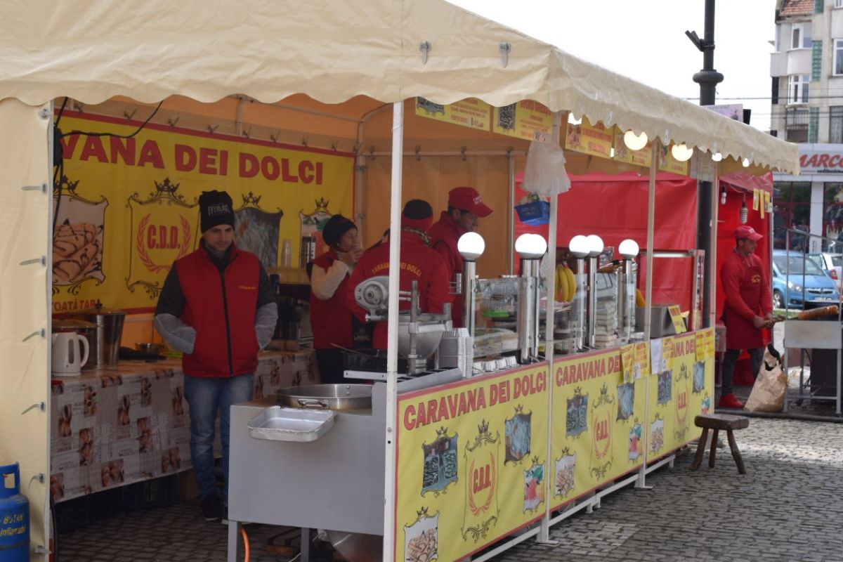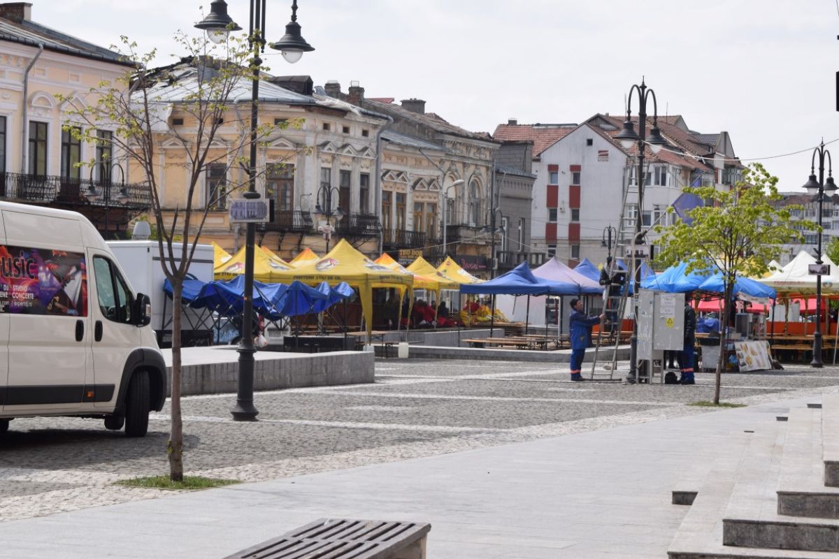 Parcă și vremea s-a îmbunat și un soare călduț a învăluit oamenii care, înfofoliți lucrează la scenă sau la terasele din perimetrul alocat acestui eveniment. Vântul strică puțin planurile comercianților, mai ales a celor care au aprins deja focul la grătare și au gătit primii mici sau grătare din carne de porc și pui.