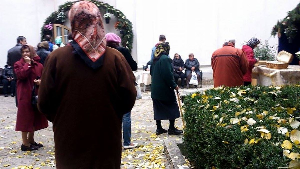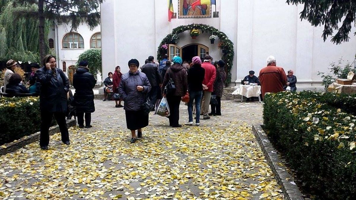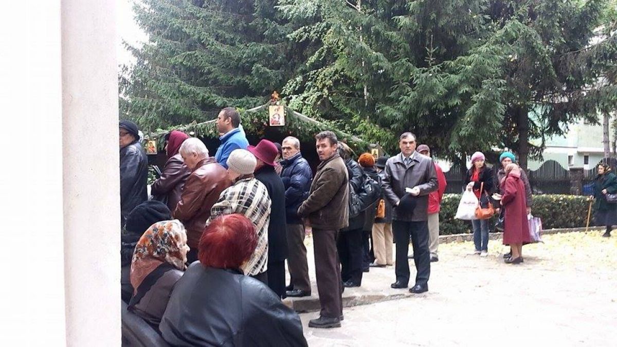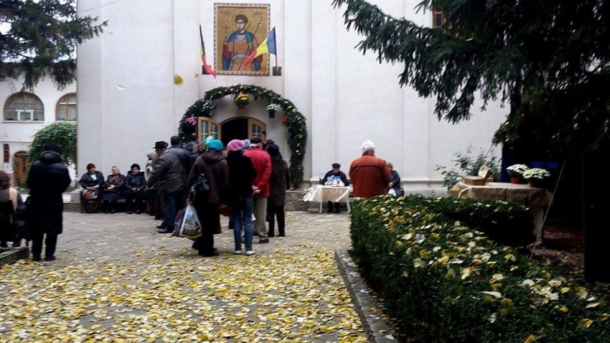 Deşi vremea nu este tocmai prietenoasă, zeci de oameni iau parte la oficierea religioasă din curtea bisericii. Liniştea este însă tulburată de doi oameni ai străzii. Aceştia au consumat spirt, după care s-au apucat de făcut scandal, înjurând în gura mare şi întorcând privirile oamenilor prezenţi la slujbă. Aceasta ar urma să se termin după ora 11:00. (Ş.V.)