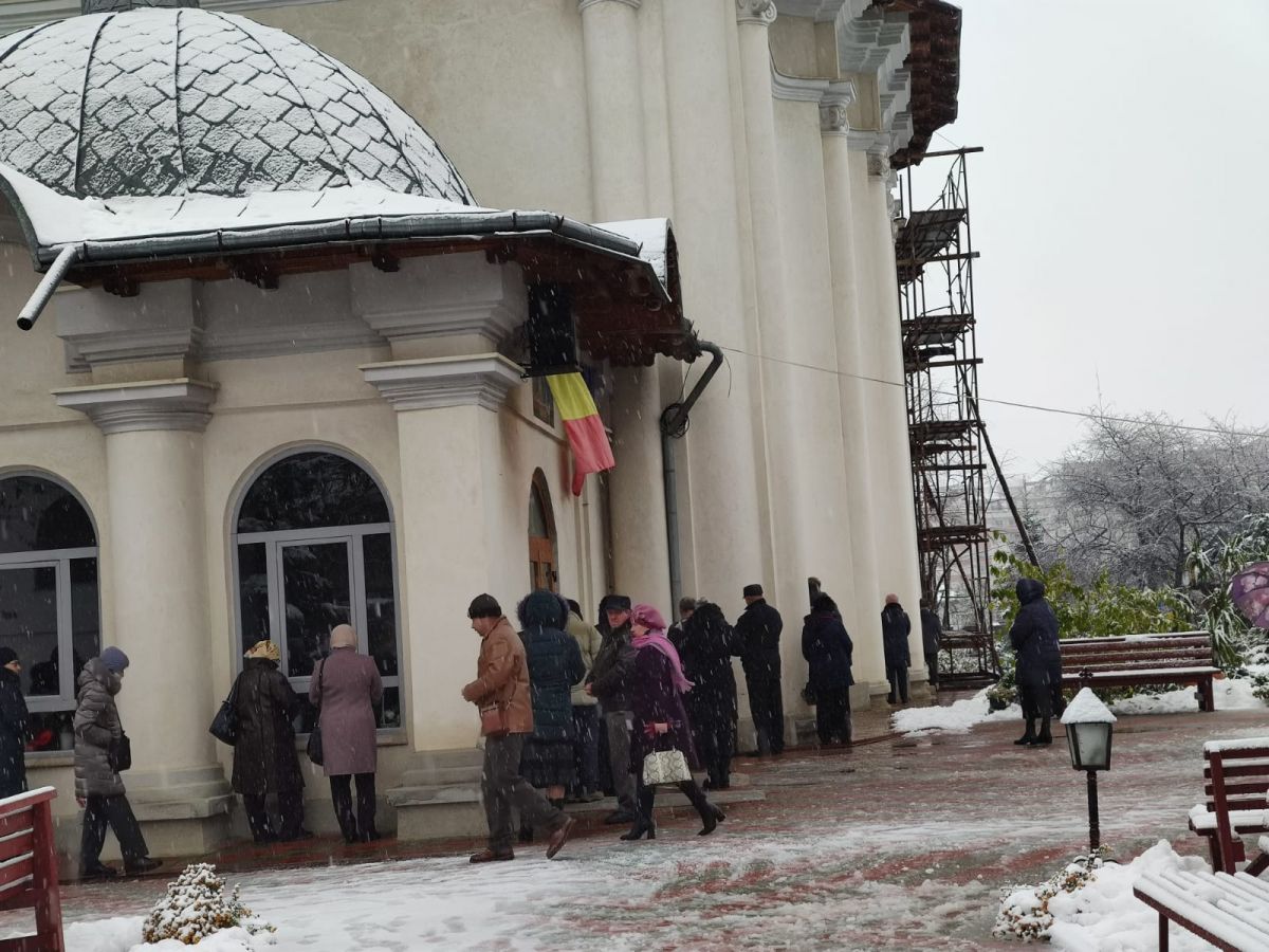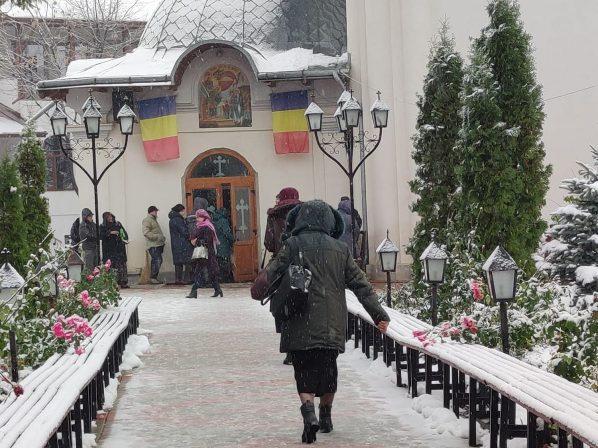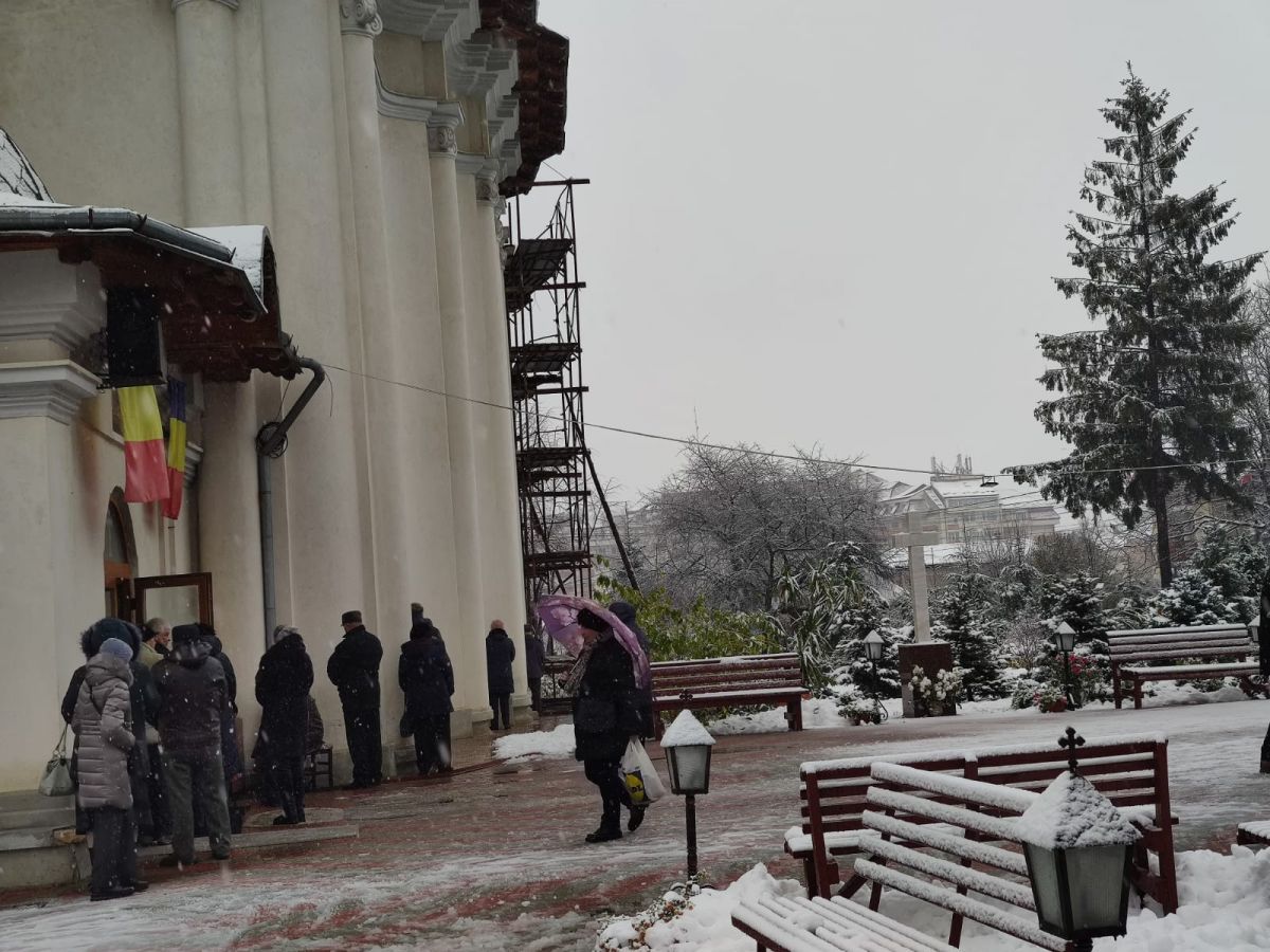 Ninge dens, însă credincioșii continuă să vină la biserică. Cei mai mulți au intrat în interiorul lăcașului de cult, însă unii au ales să asculte Sfânta Liturghie afară.