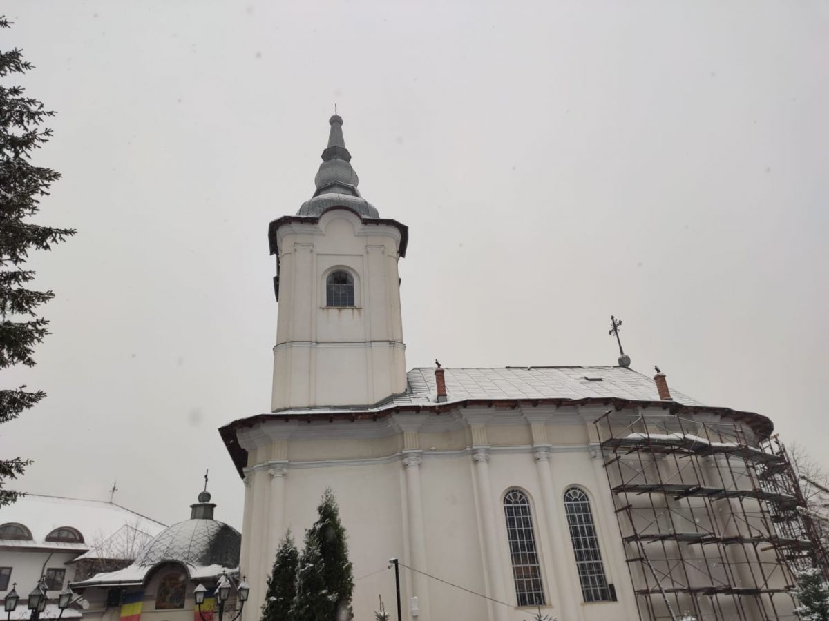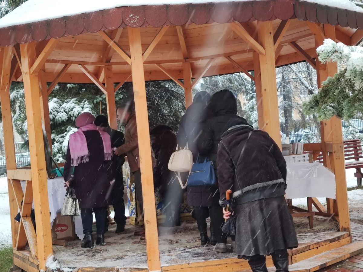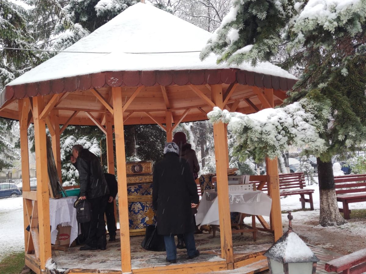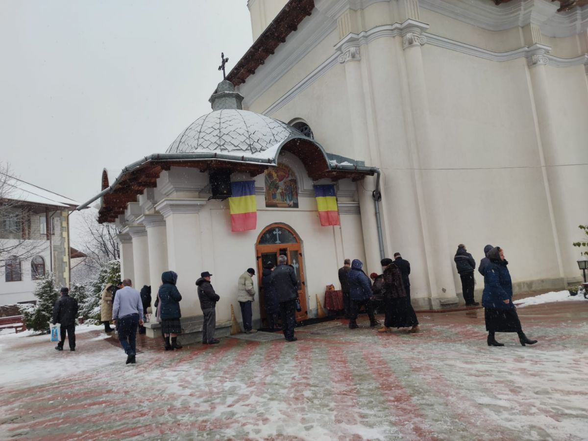 Ninge dens, însă credincioșii continuă să vină la biserică. Cei mai mulți au intrat în interiorul lăcașului de cult, însă unii au ales să asculte Sfânta Liturghie afară.