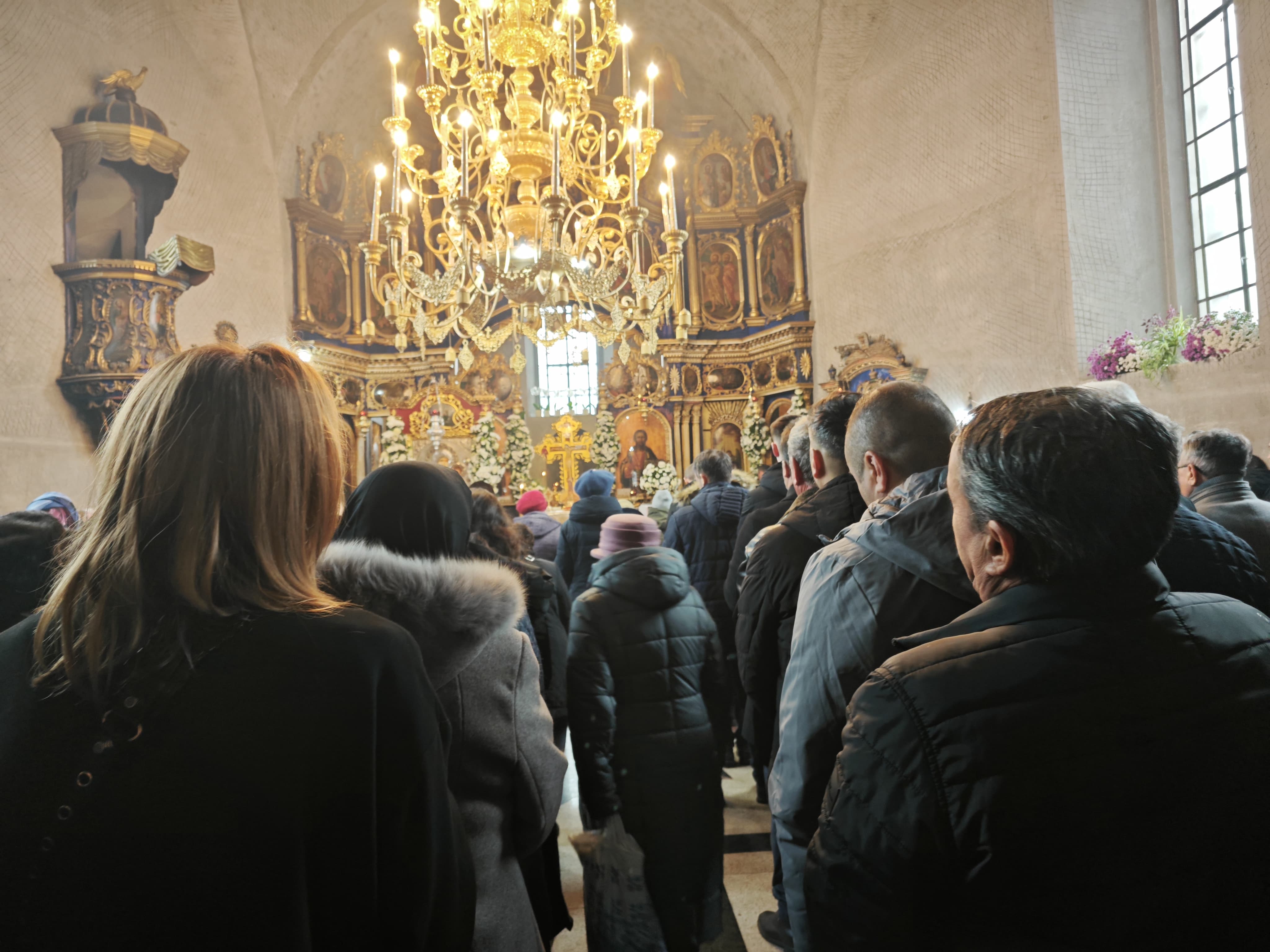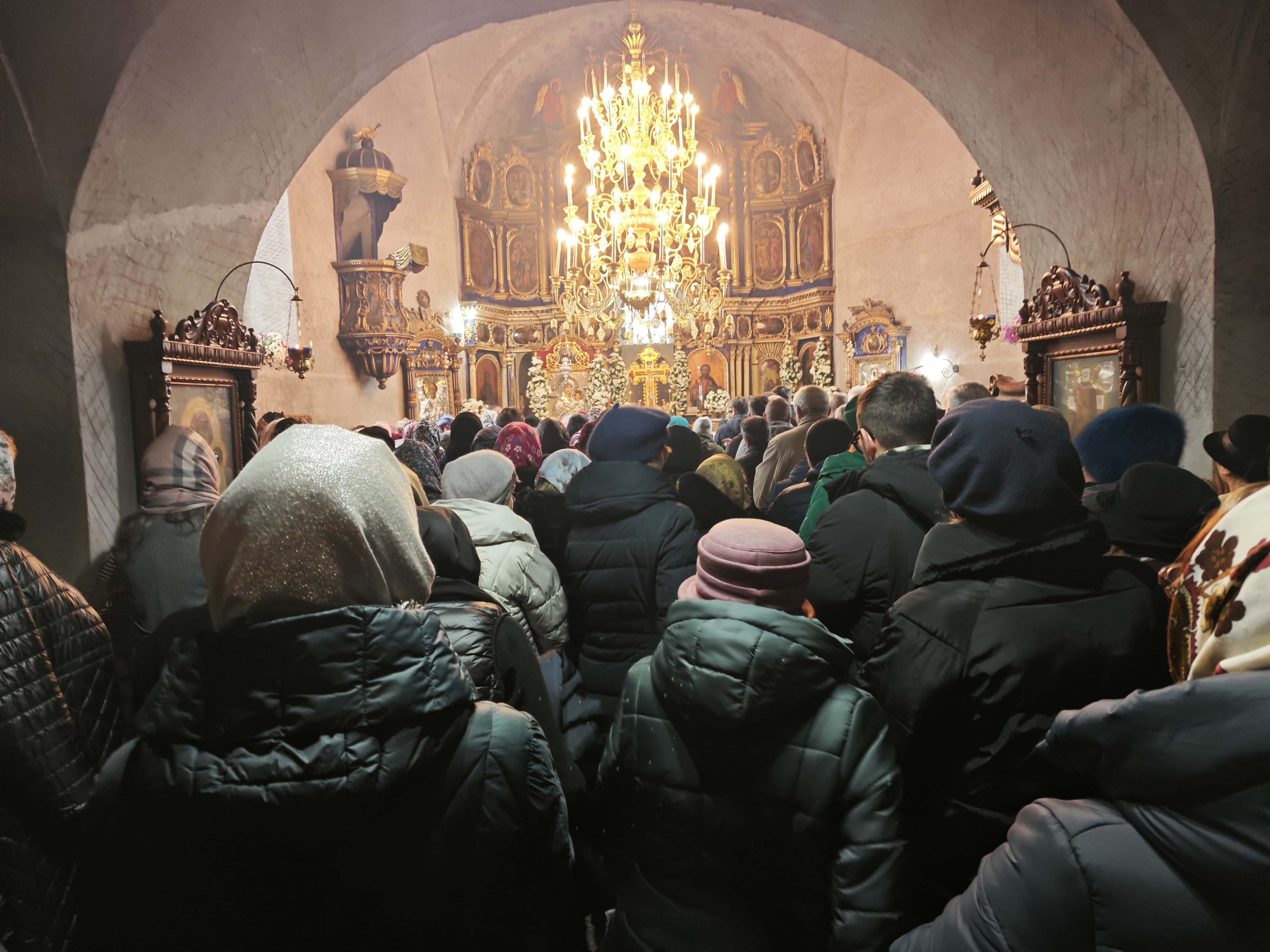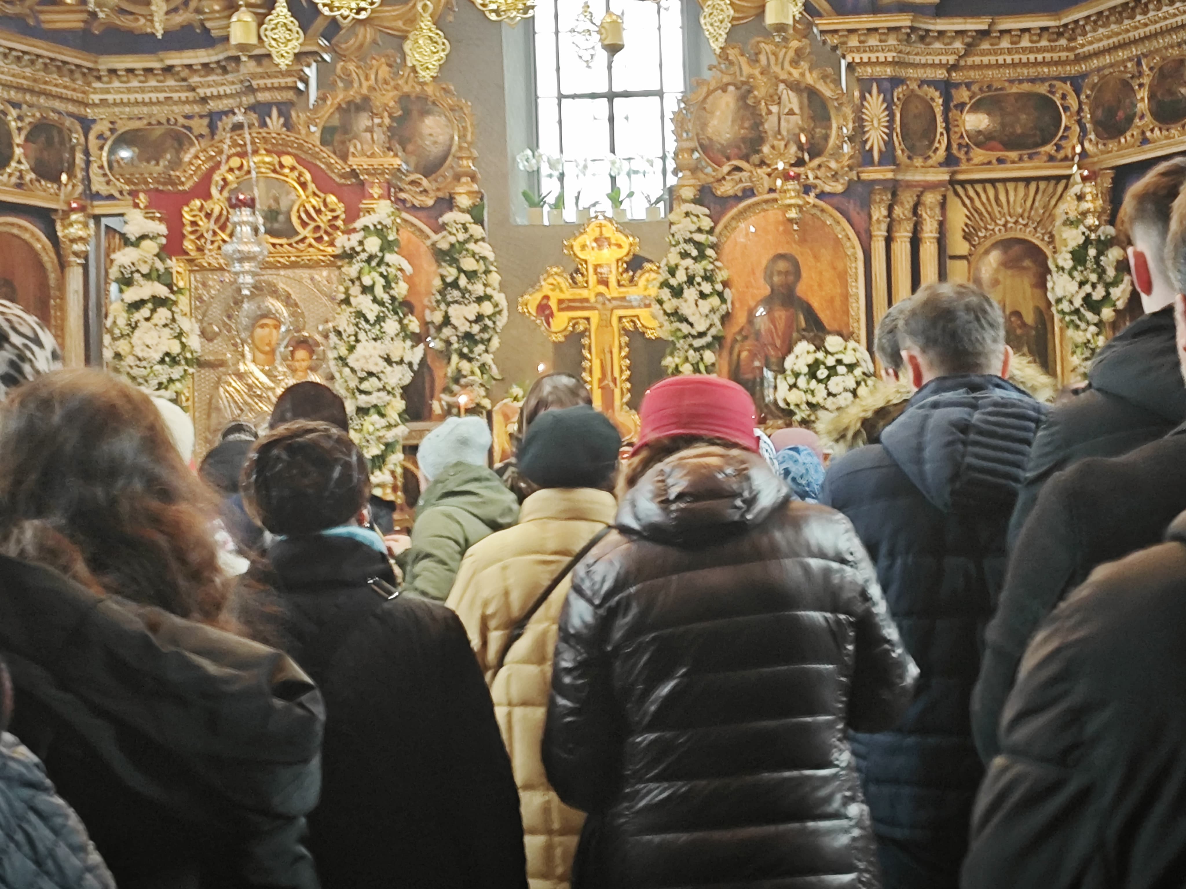 În aceste momente, lăcașul de cult este plin de credincioșii care ascultă Sfânta Liturghie.