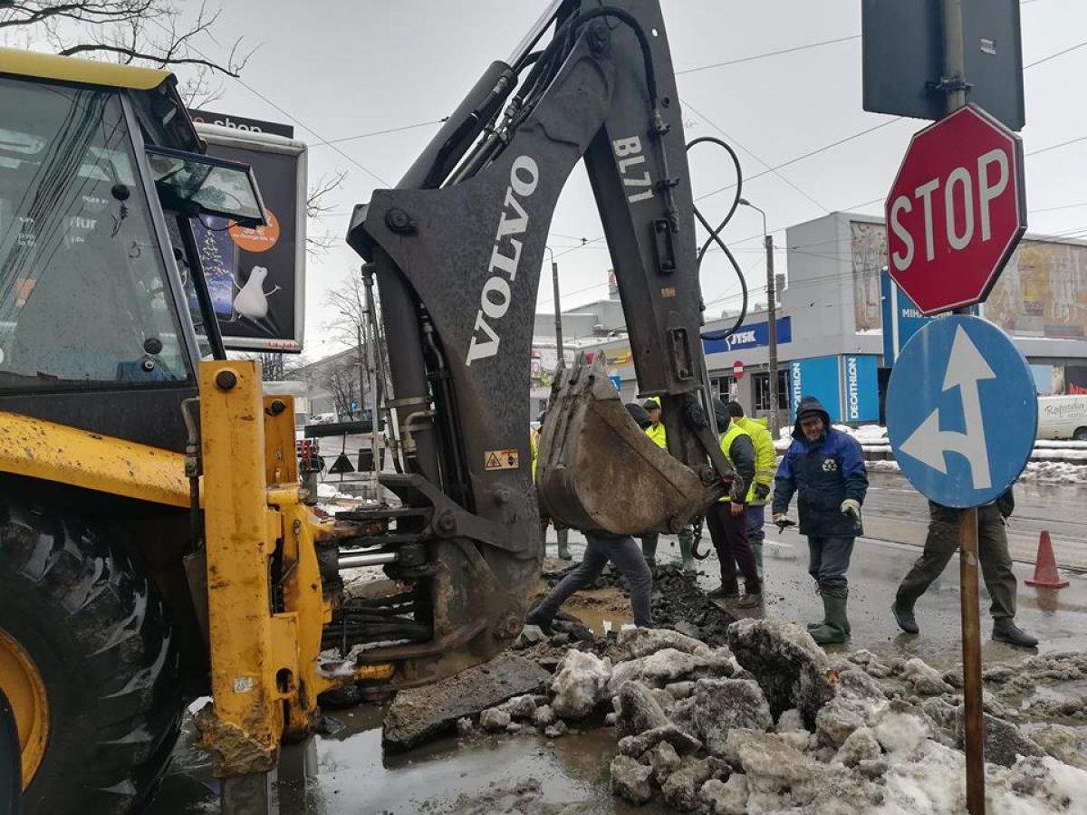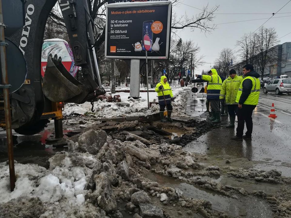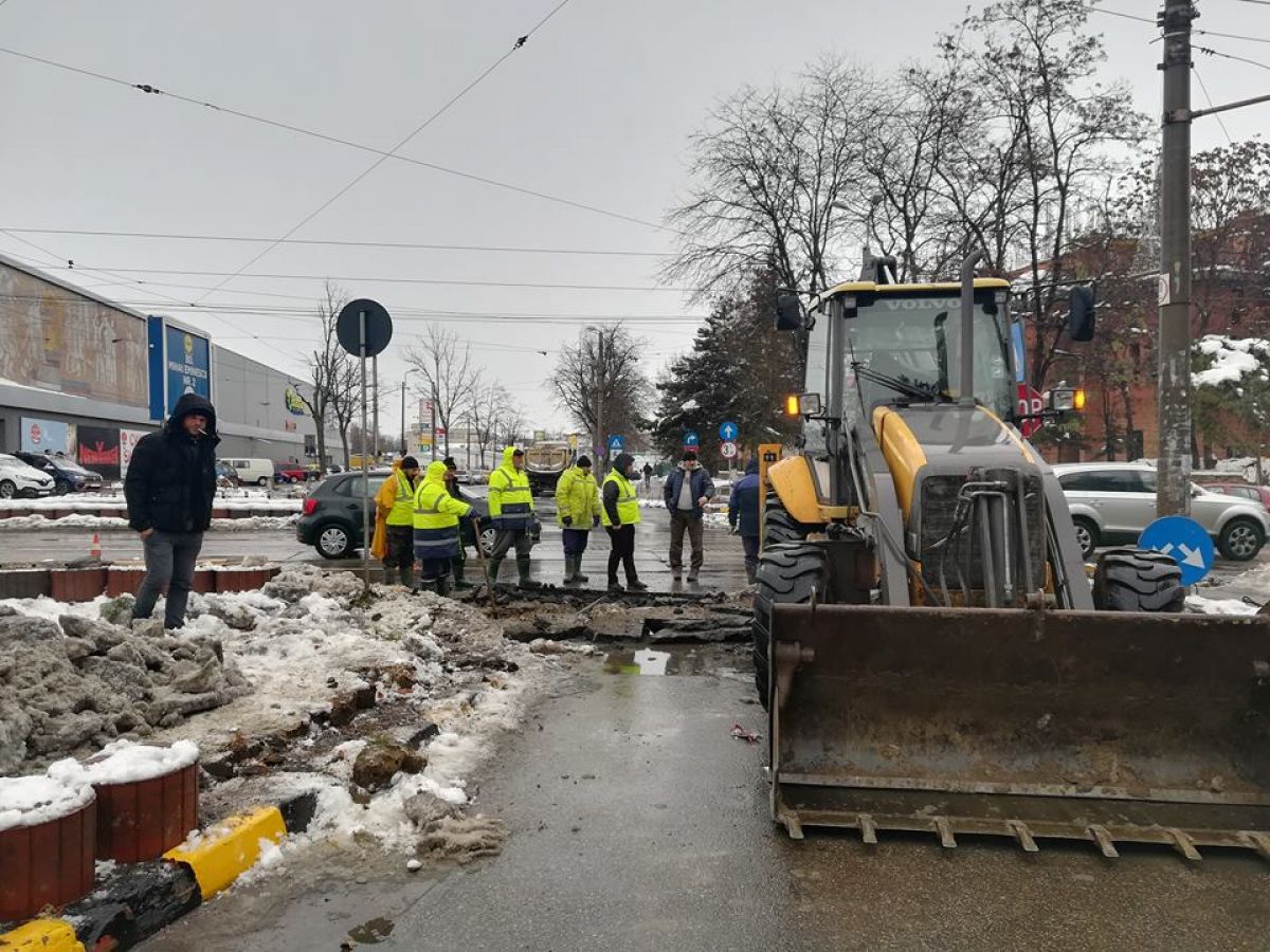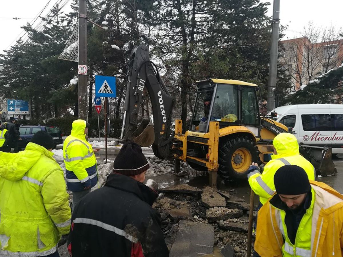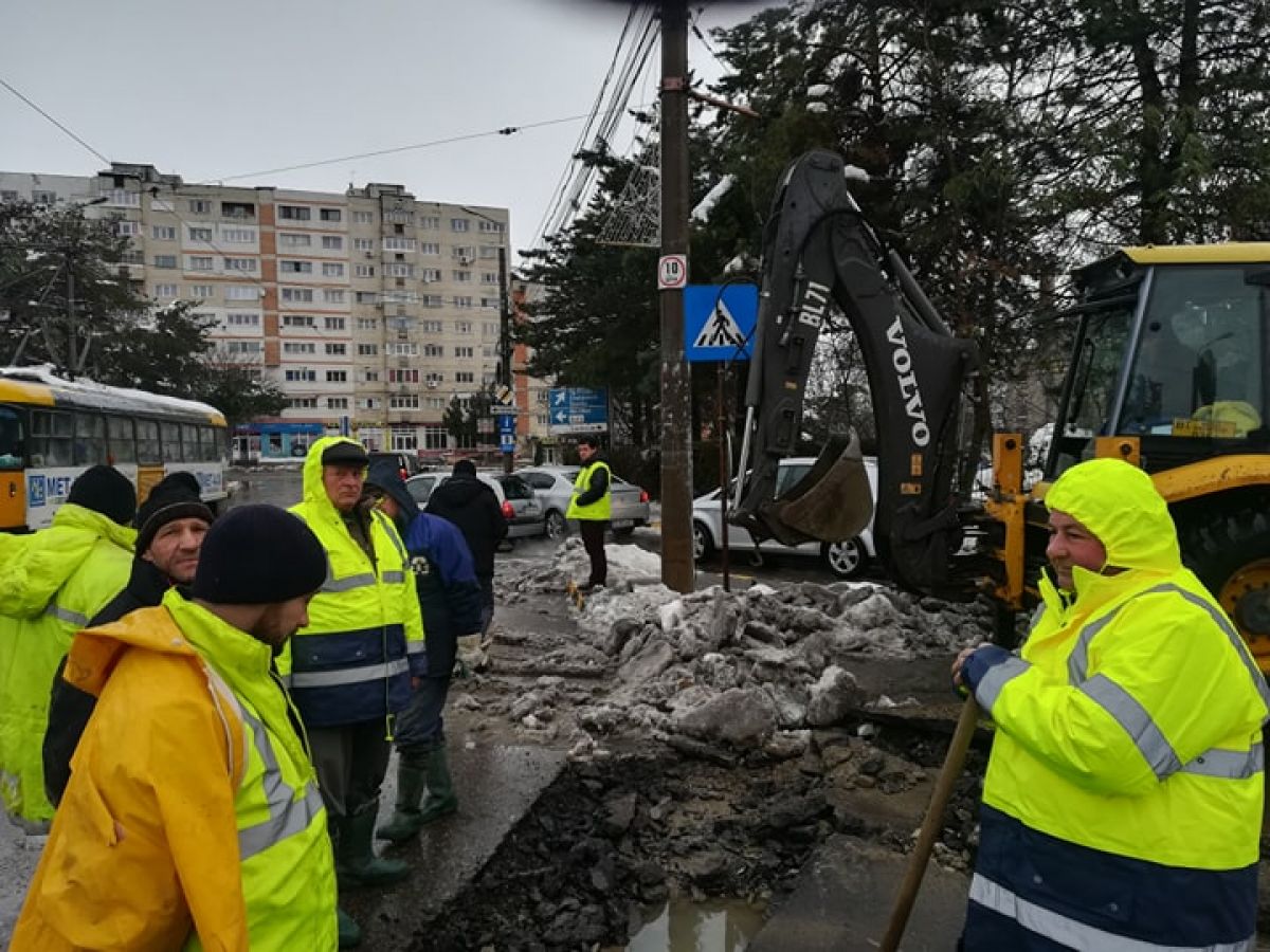 Echipajele de intervenţie sunt coordonate în teren de către directorul de exploatare Ady Petruşcă. În acest moment se sapă pentru a se ajunge la conducta care se află la o adâncime de aproximativ 3 metri şi jumătate. Apa ţăşneşte din carosabil şi într-un cămin, astfel că intervenţia este extrem de greoaie.