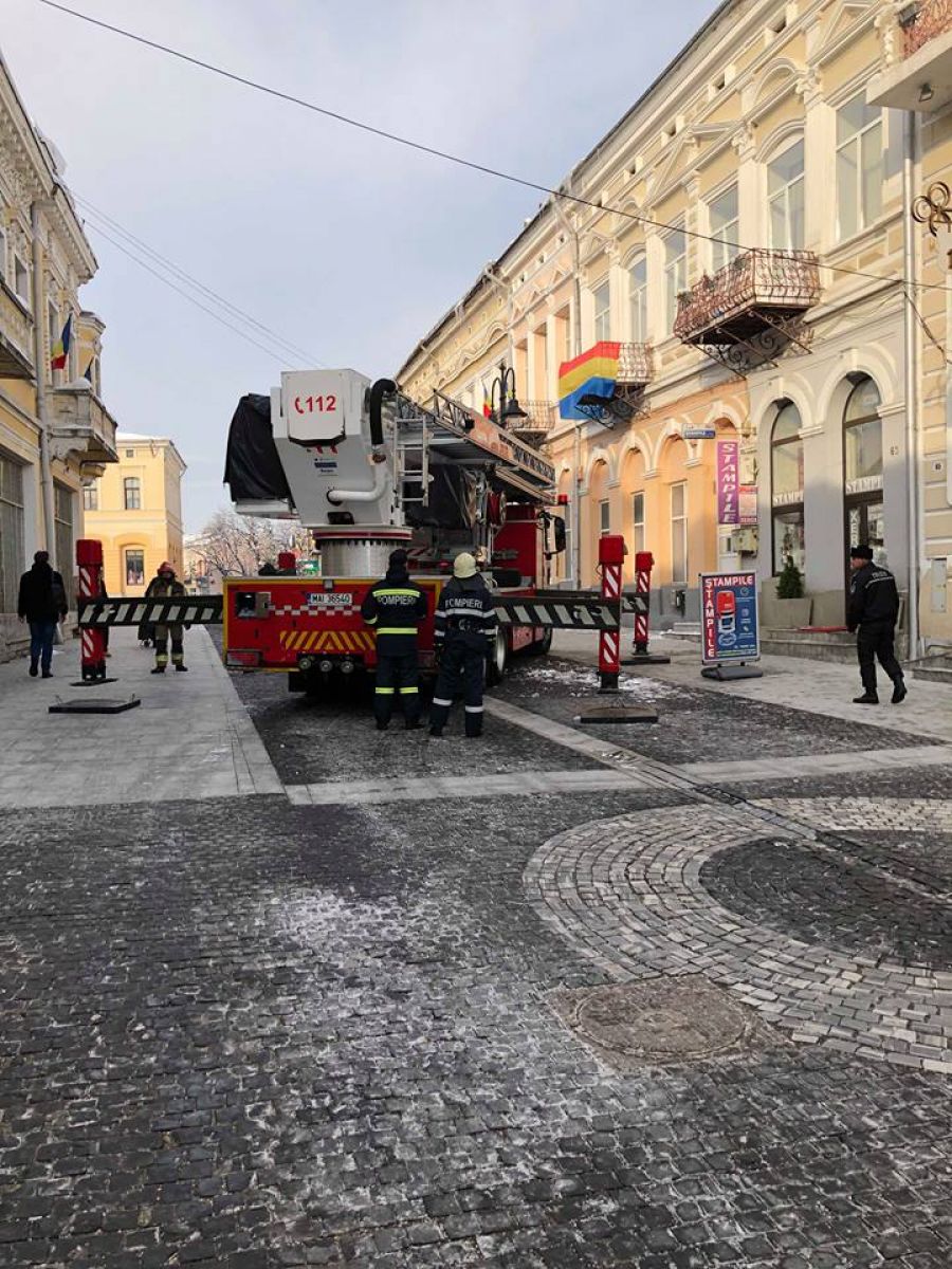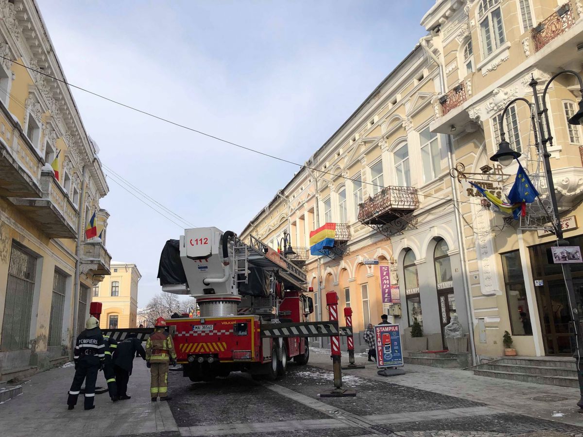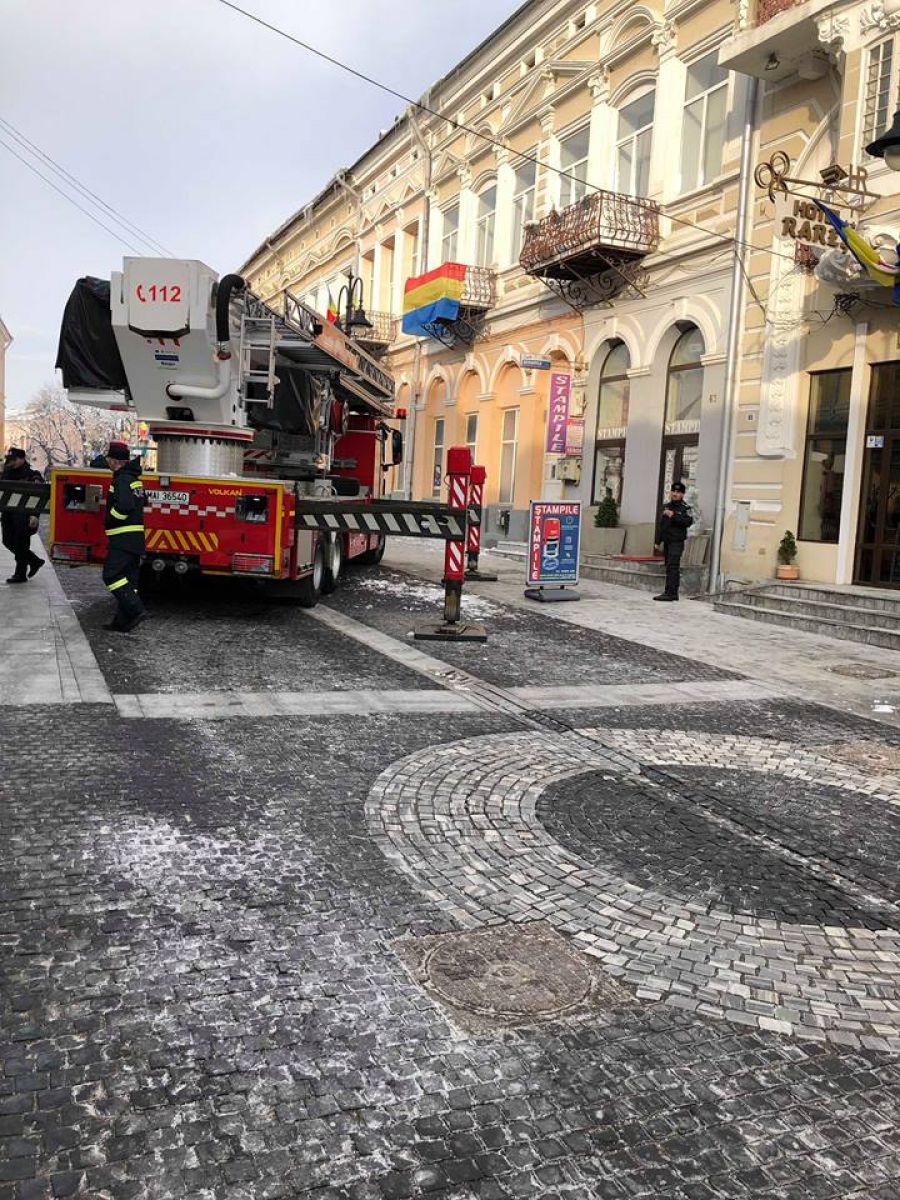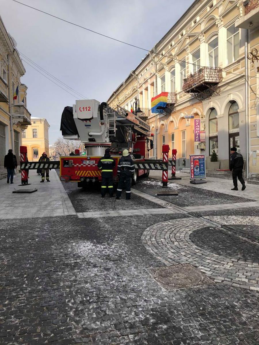 În aceste momente, mai mulți pompieri, dar și polițiști locali se află în Centrul Vechi din municipiu pentru a îndepărta țurțurii de gheață de la streșinile blocurilor.