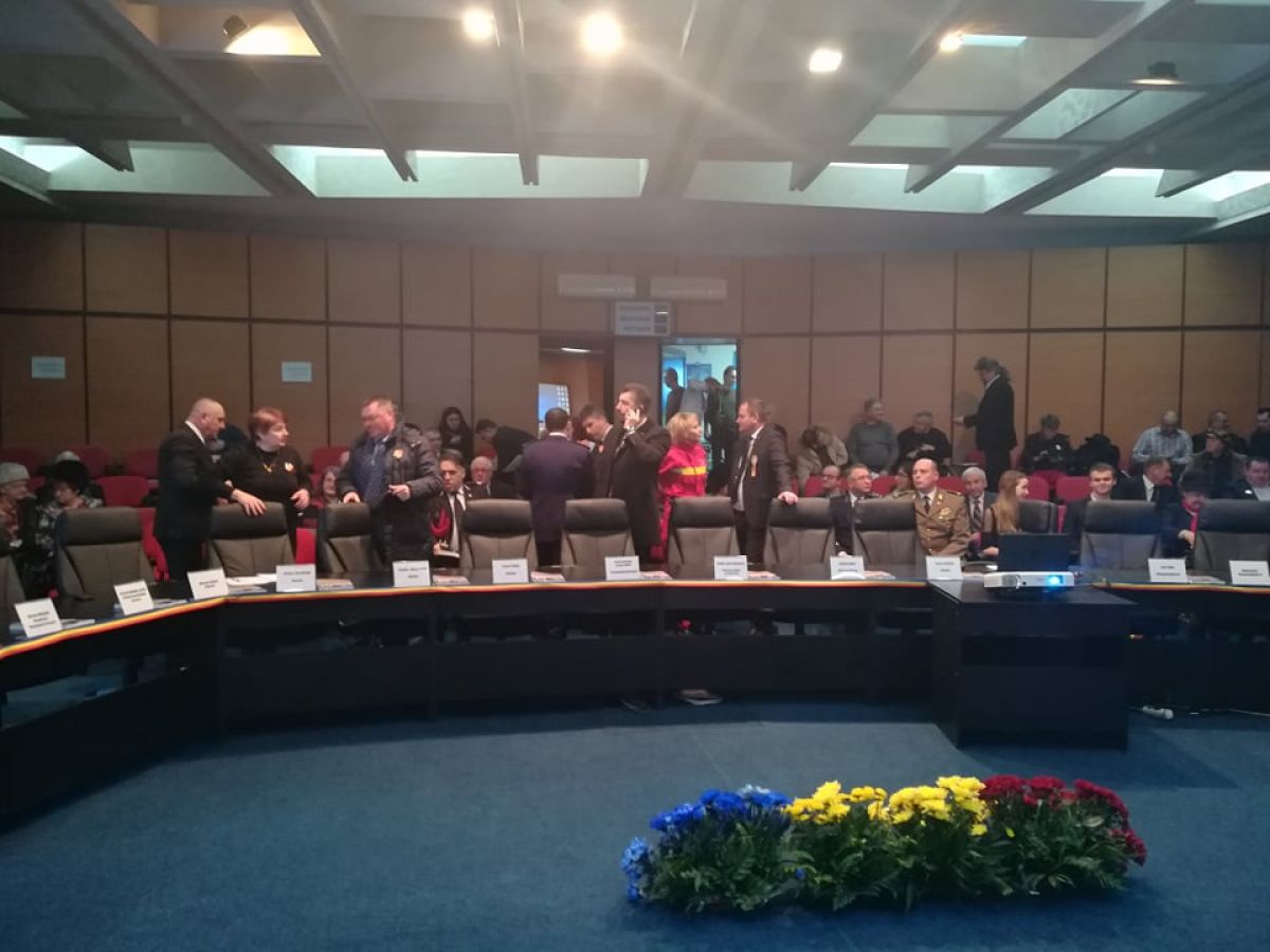 Deja, oficialităţile oraşului şi judeţului au început să ocupe scaune în sală, urmând a fi susţinute o serie de discursuri ce nu vor mai fi rostite în Piaţa 1 Decembrie 1918. Sunt prezenţi la şedinţa festivă parlamentari, directori de instituţii, consilieri judeţeni şi locali.