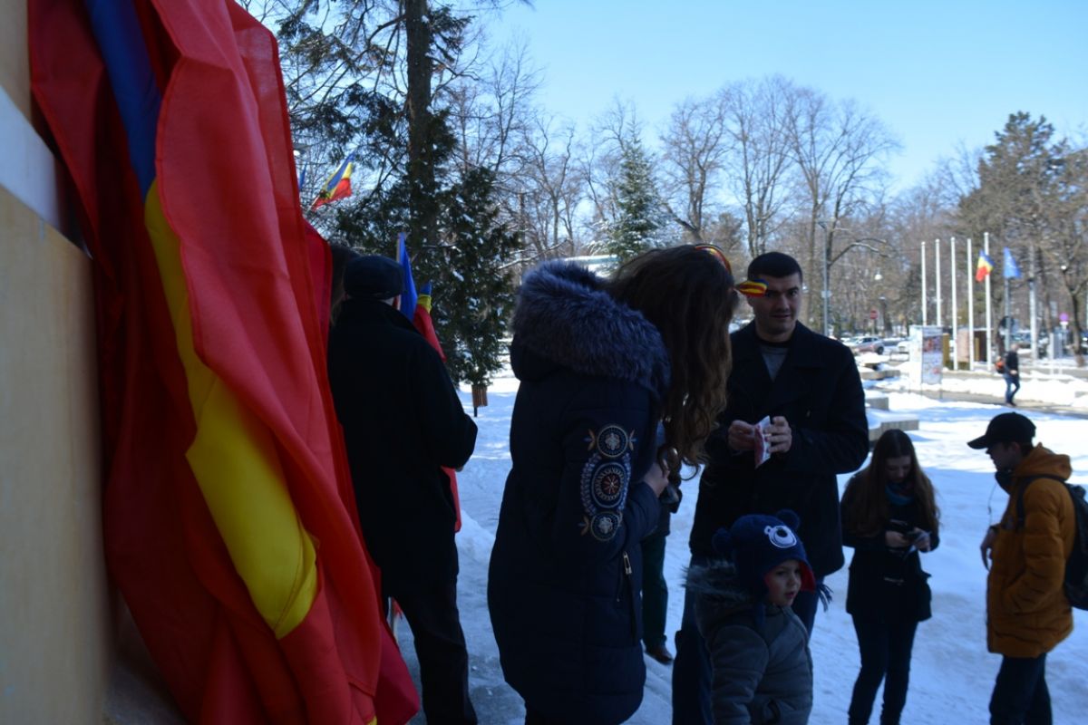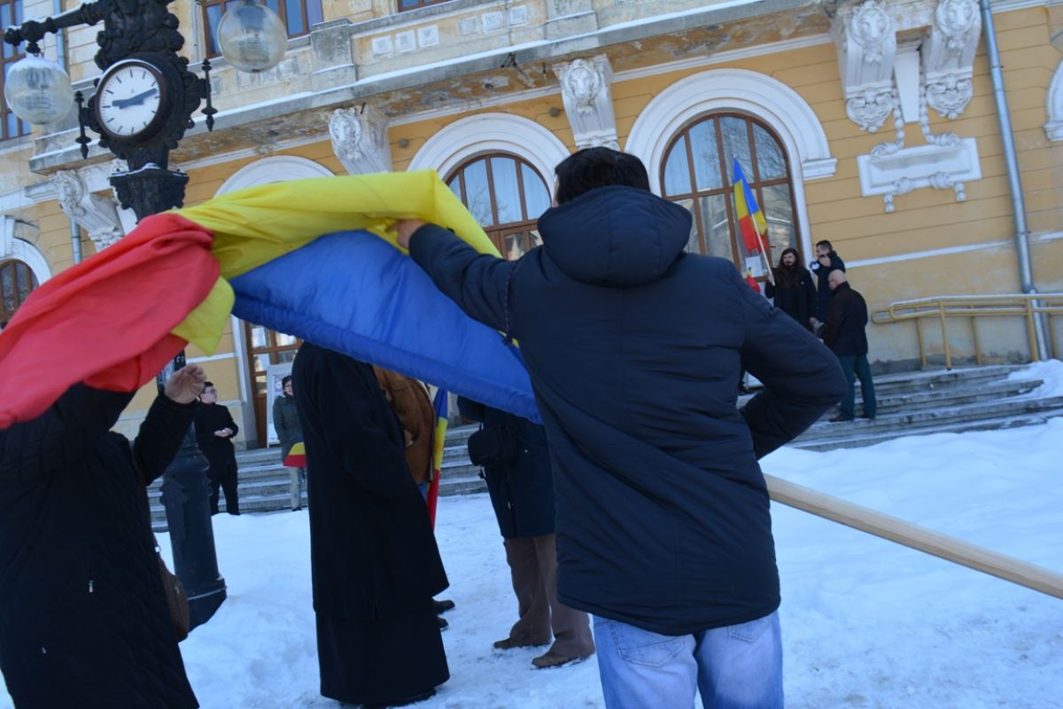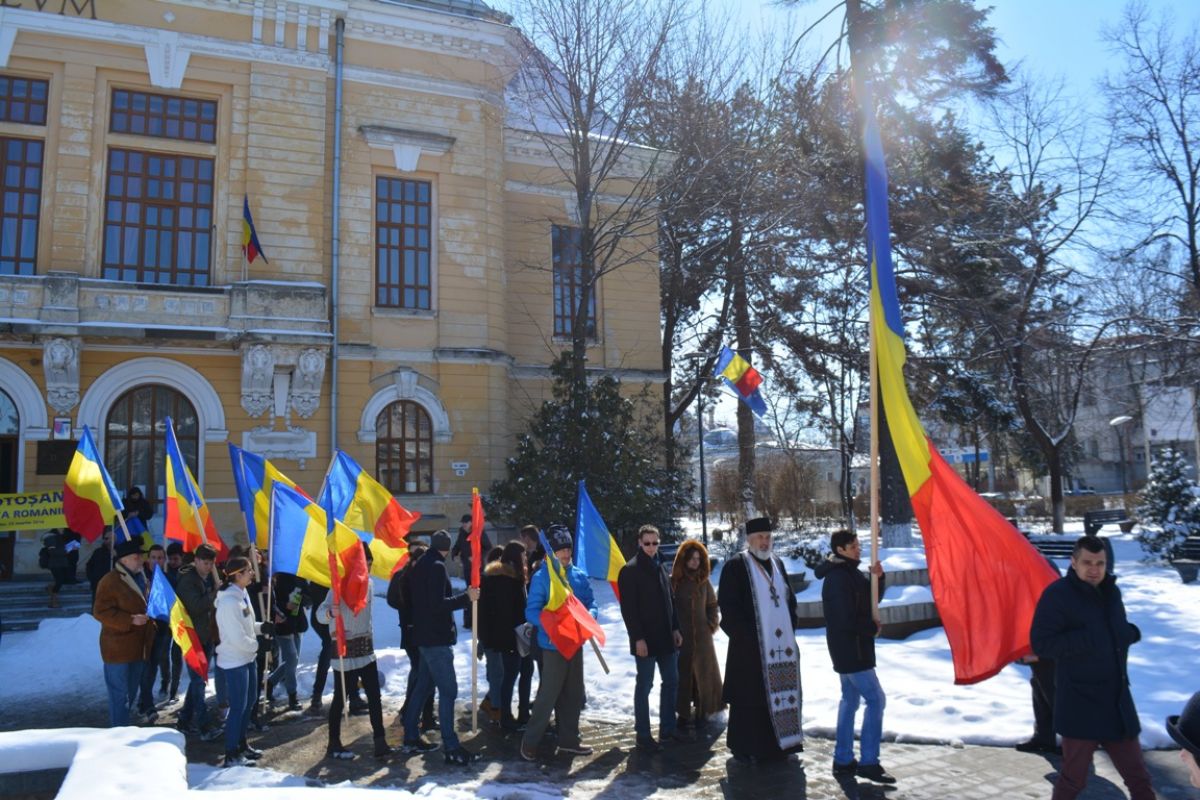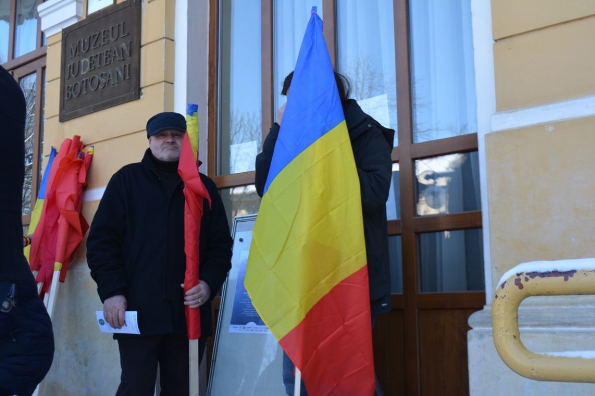 Botoşănenii patrioţi flutură tricolorul, cordonul fiind deschis de un steag uriaş şi de un banner cu mesajul „Judeţul Botoşani vrea reîntregirea României”.