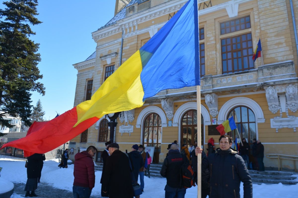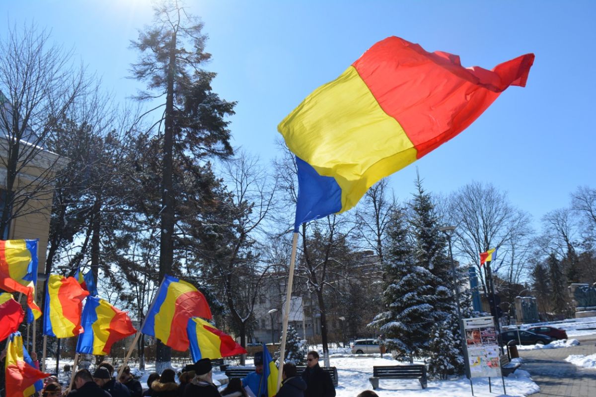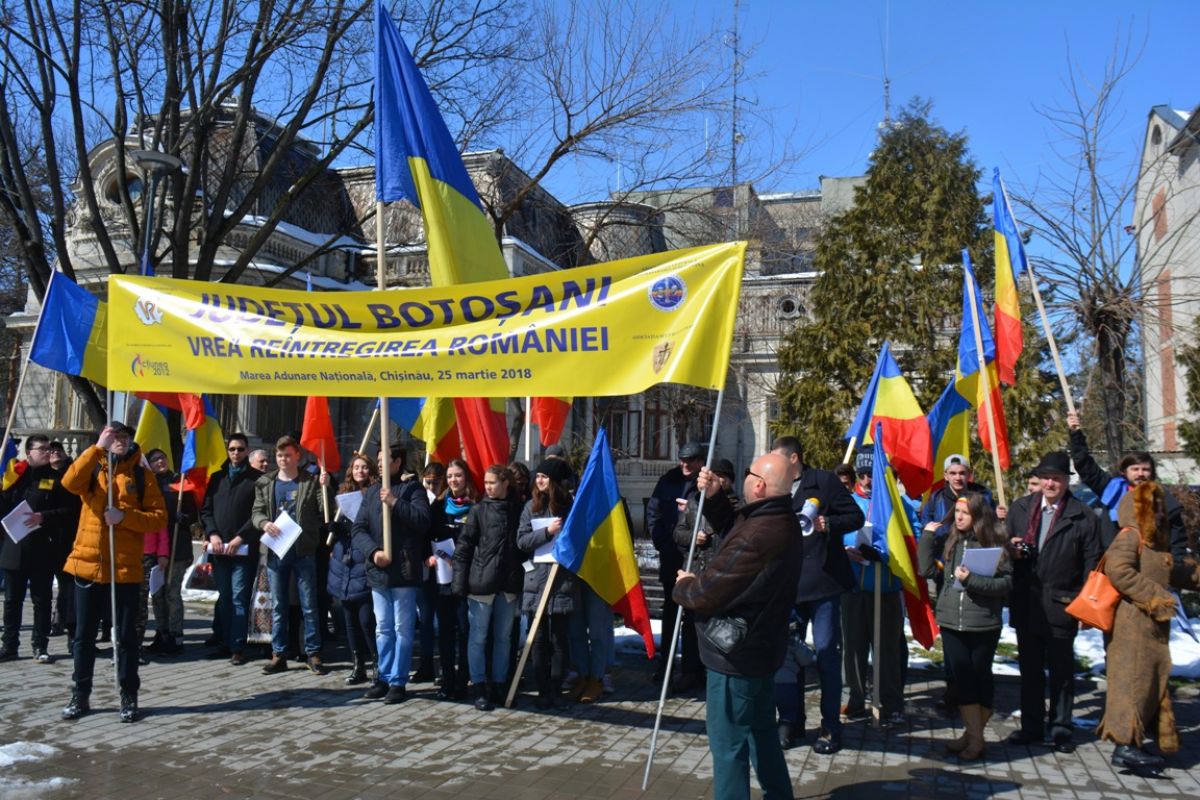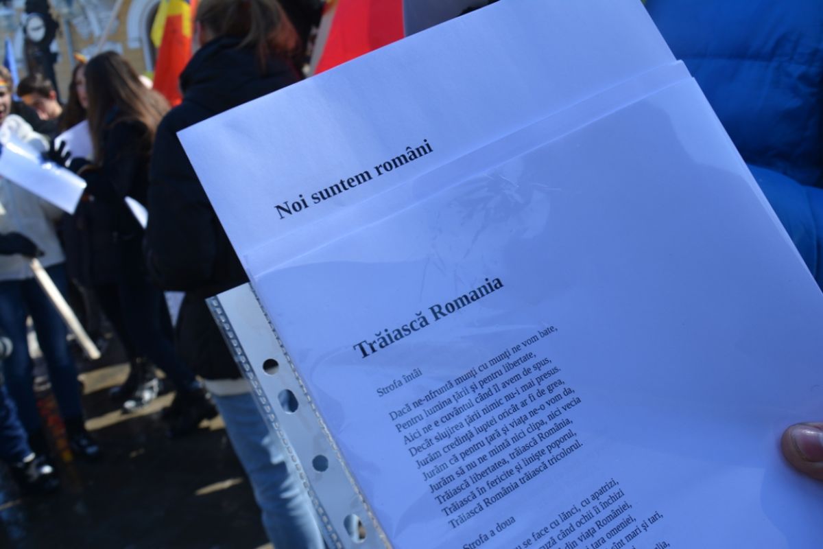 Sunt aproape 100 de manifestanţi care cântă „Deşteaptă-te, române” şi care scandează lozinci precum, „Basarabia e România”, „Trăiască, trăiască, trăiască şi înflorească / Moldova, Ardealul şi Ţara Românească” şi „Unire! Unire”.