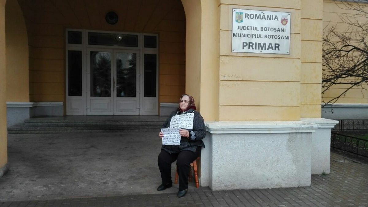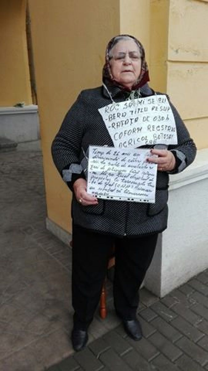 Veronica Bordeanu are 72 de ani și spune că se luptă de aproape trei decenii pentru a intra în posesia unei bucăți de pământ de 0,30 hectare, poziționată în Cătămărăști Deal, unde a funcționat fosta fabrică de lapte. Terenul i-ar fi fost confiscat de fostul CAP și deși a inițiat mai multe demersuri, proprietatea nu i-ar mai fi fost retrocedată. Femeia spune că are și o hotărâre judecătorească prin care a obținut respectiva suprafață de teren și care nu a fost pusă în aplicare. De la Primărie i s-ar fi transmis că se află deja în posesia celor 30 de ari, însă, terenul pare să fie ocupat de un operator privat. Veronica Bordeanu arată că va sta în fața Primăriei Botoșani în fiecare zi, de la ora 9.00 la 12.00, până când problema ei va fi soluționată.
