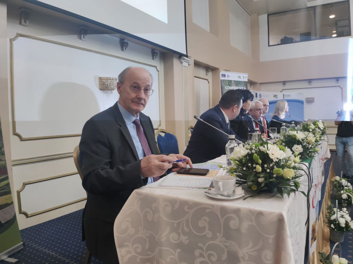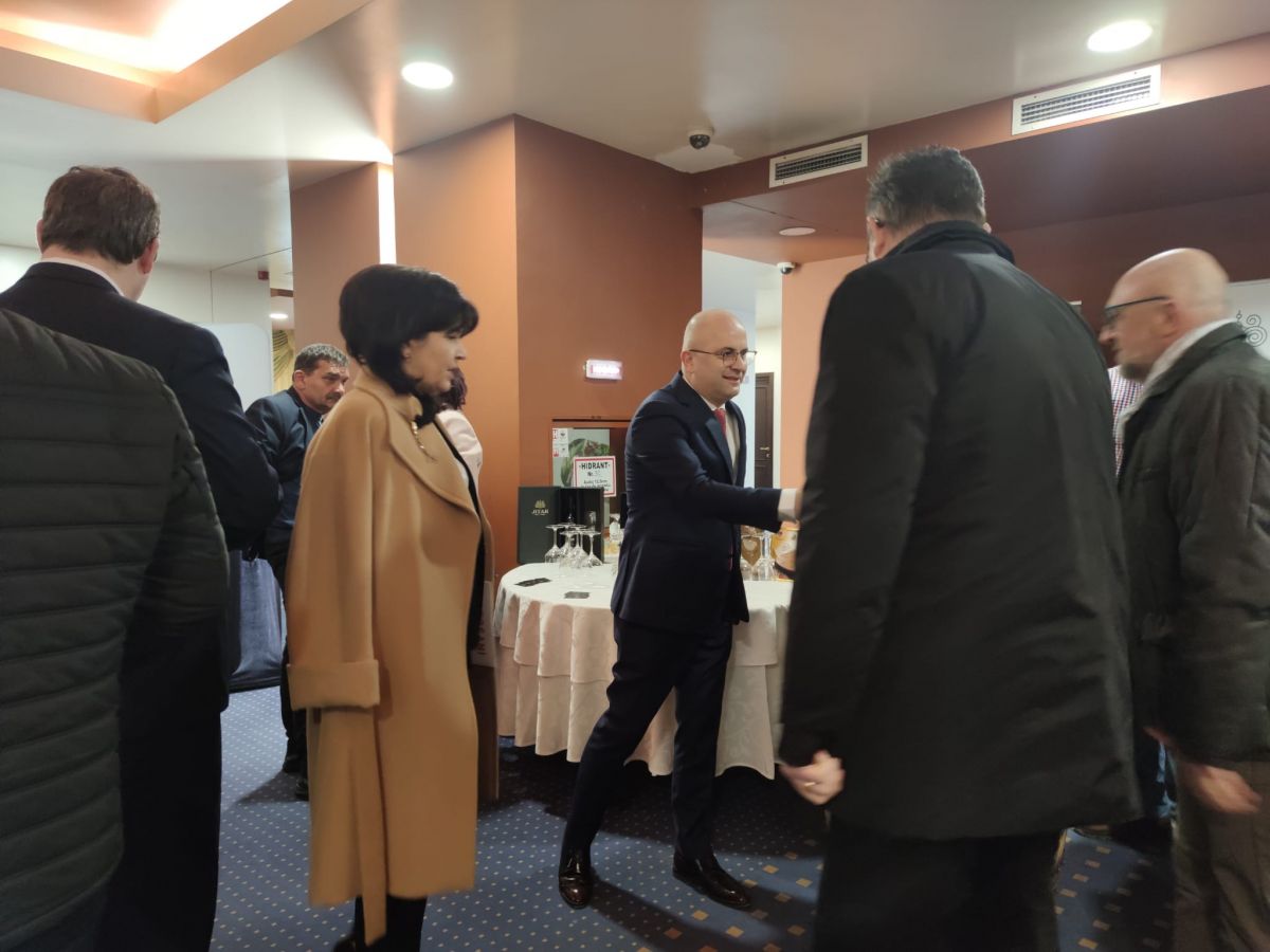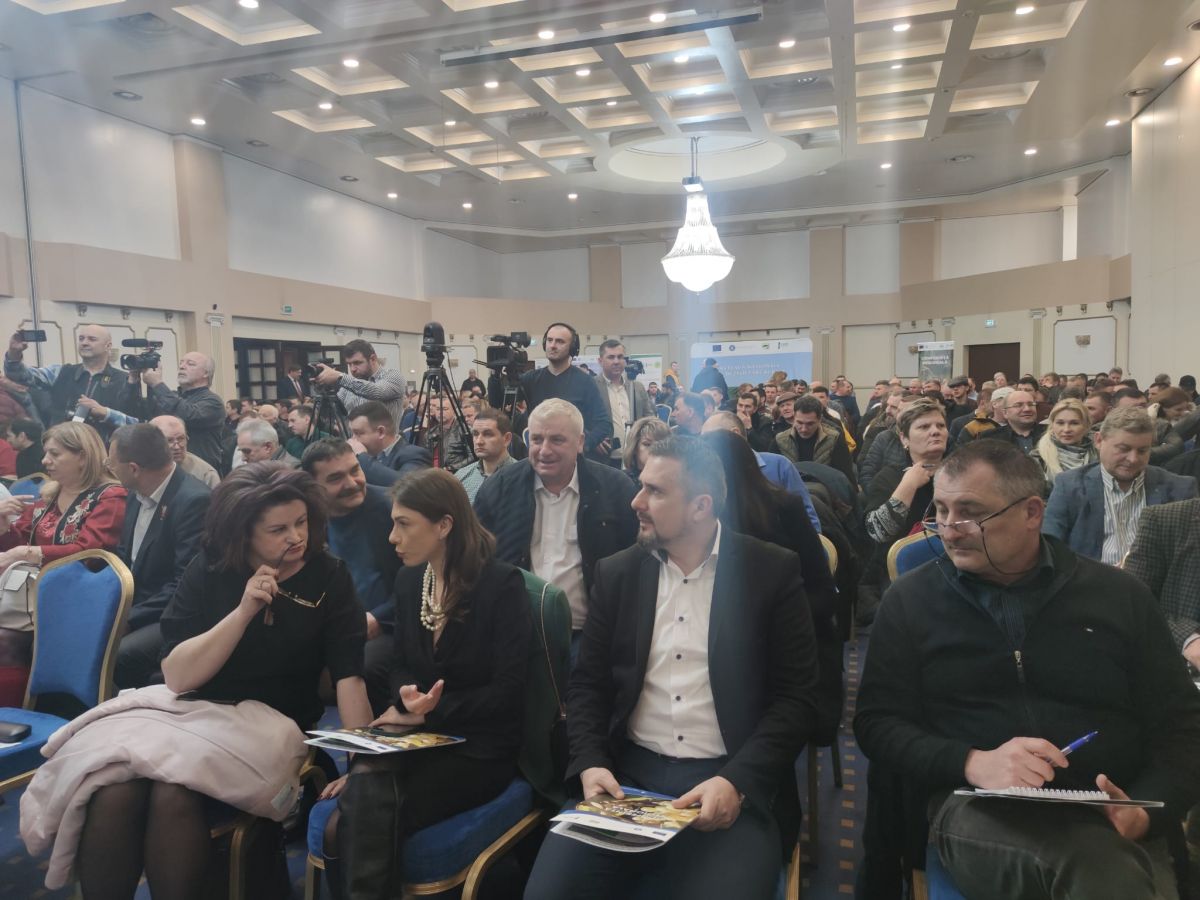 Participă la o întâlnire în sala Mihai Eminescu a Hotelului Rapsodia cu primarii din județul Botoșani, în sală fiind prezenți și fermieri.