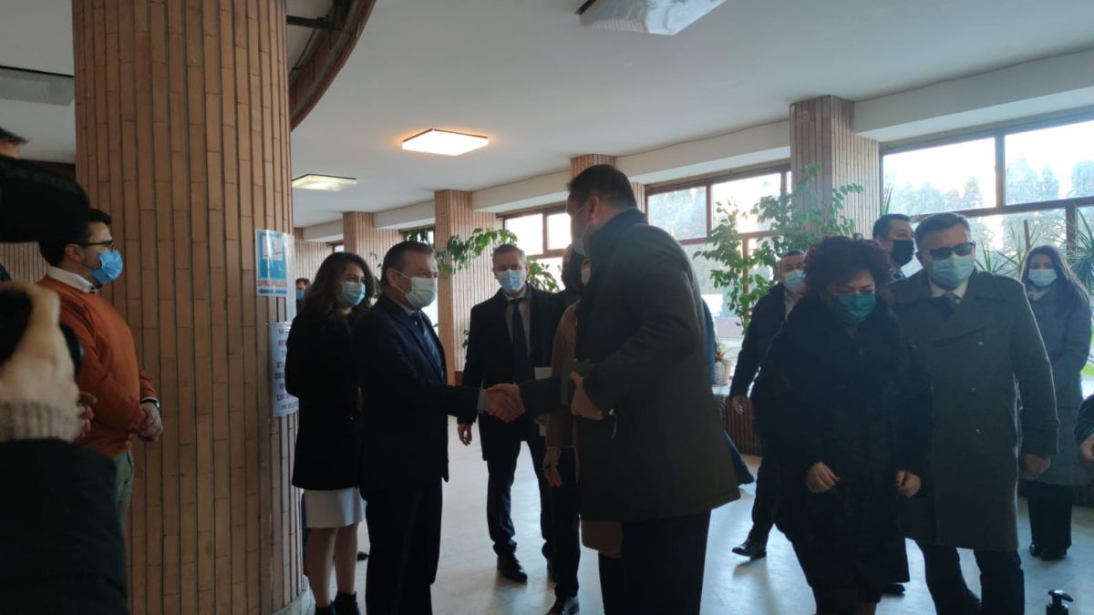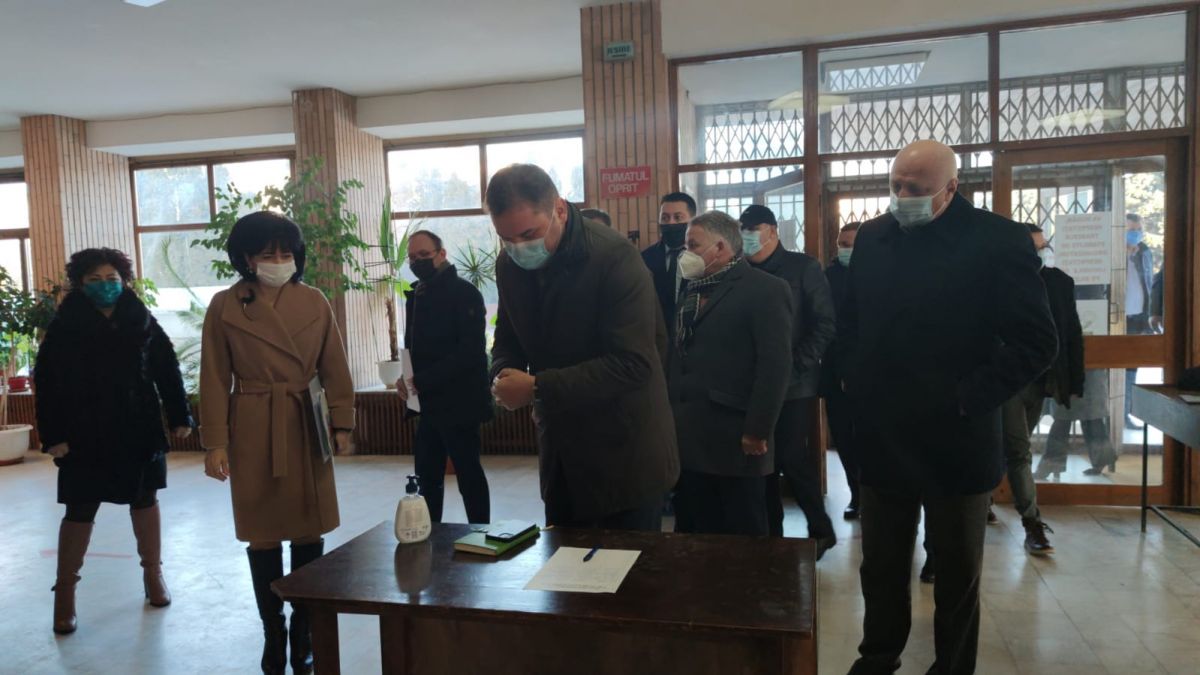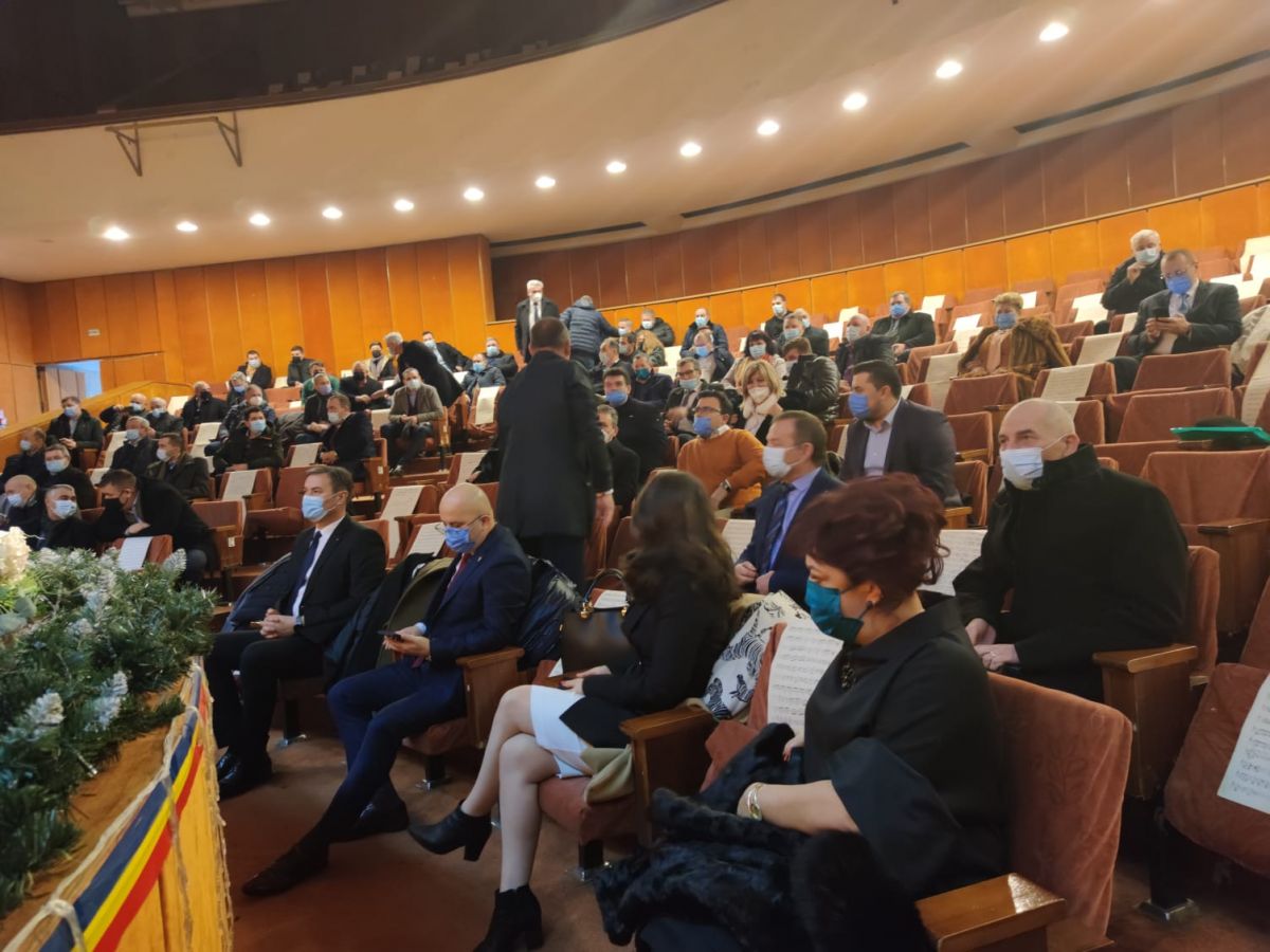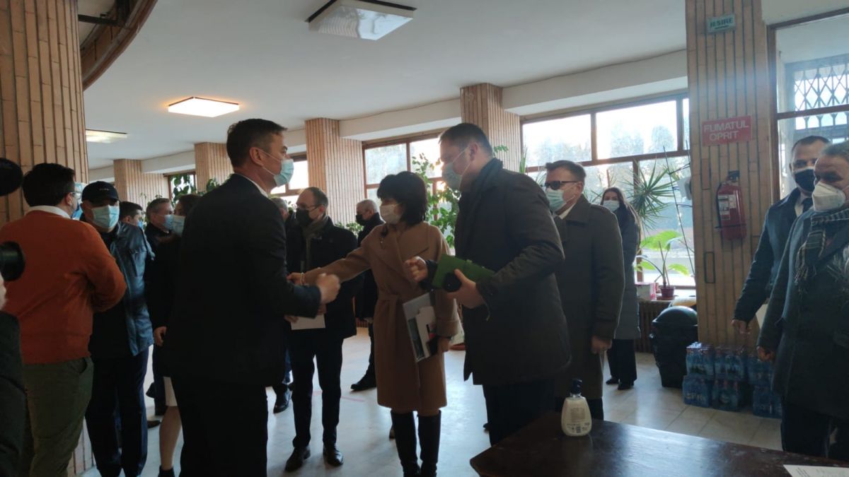 Cu o întârziere de aproximativ 15 minute, Ministrul Dezvoltării, Cseke Attila, a ajuns la Casa Sindicatelor însoțit de prefectul Dan Nechifor, de Doina Federovici, președintele Consiliului Județean, deputatul Costel Șoptică și primarul Cosmin Andrei.
