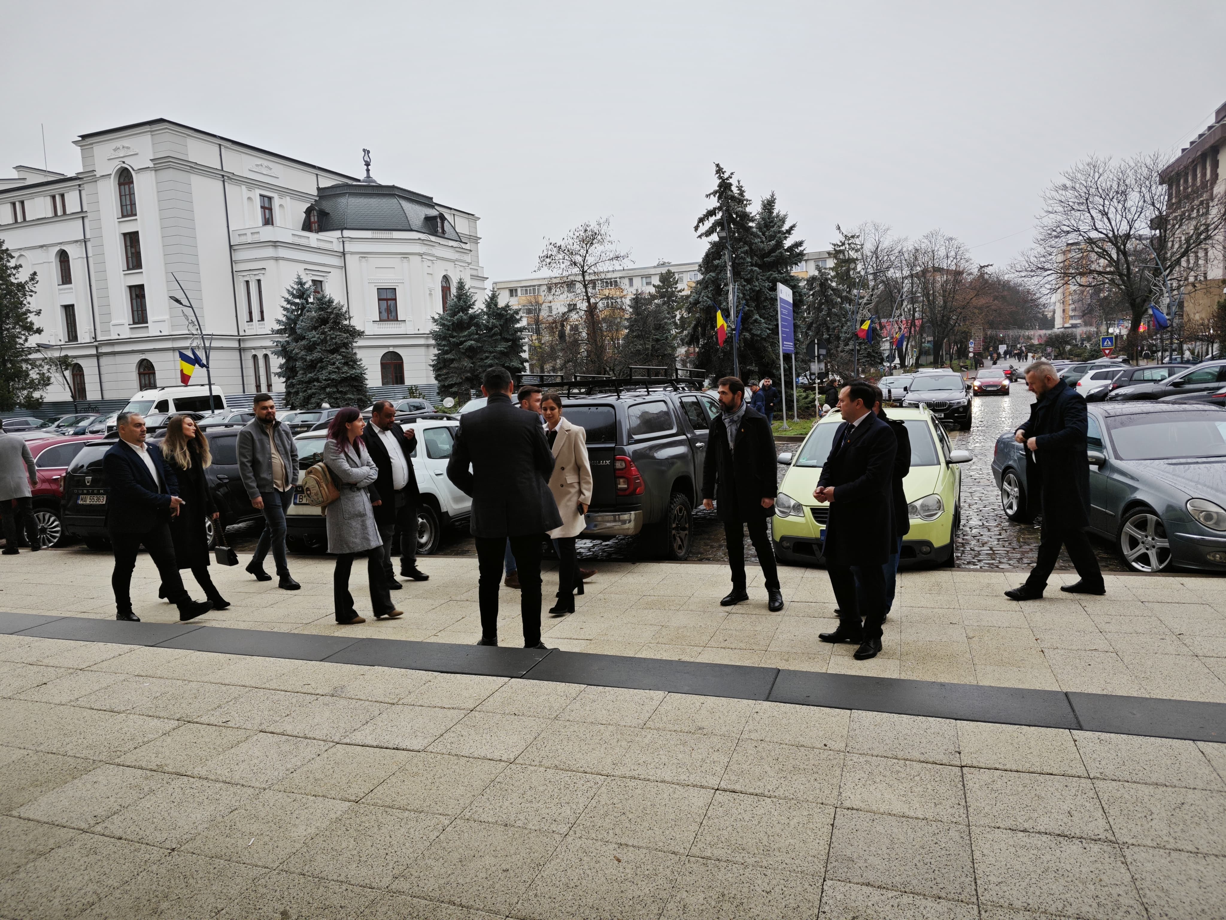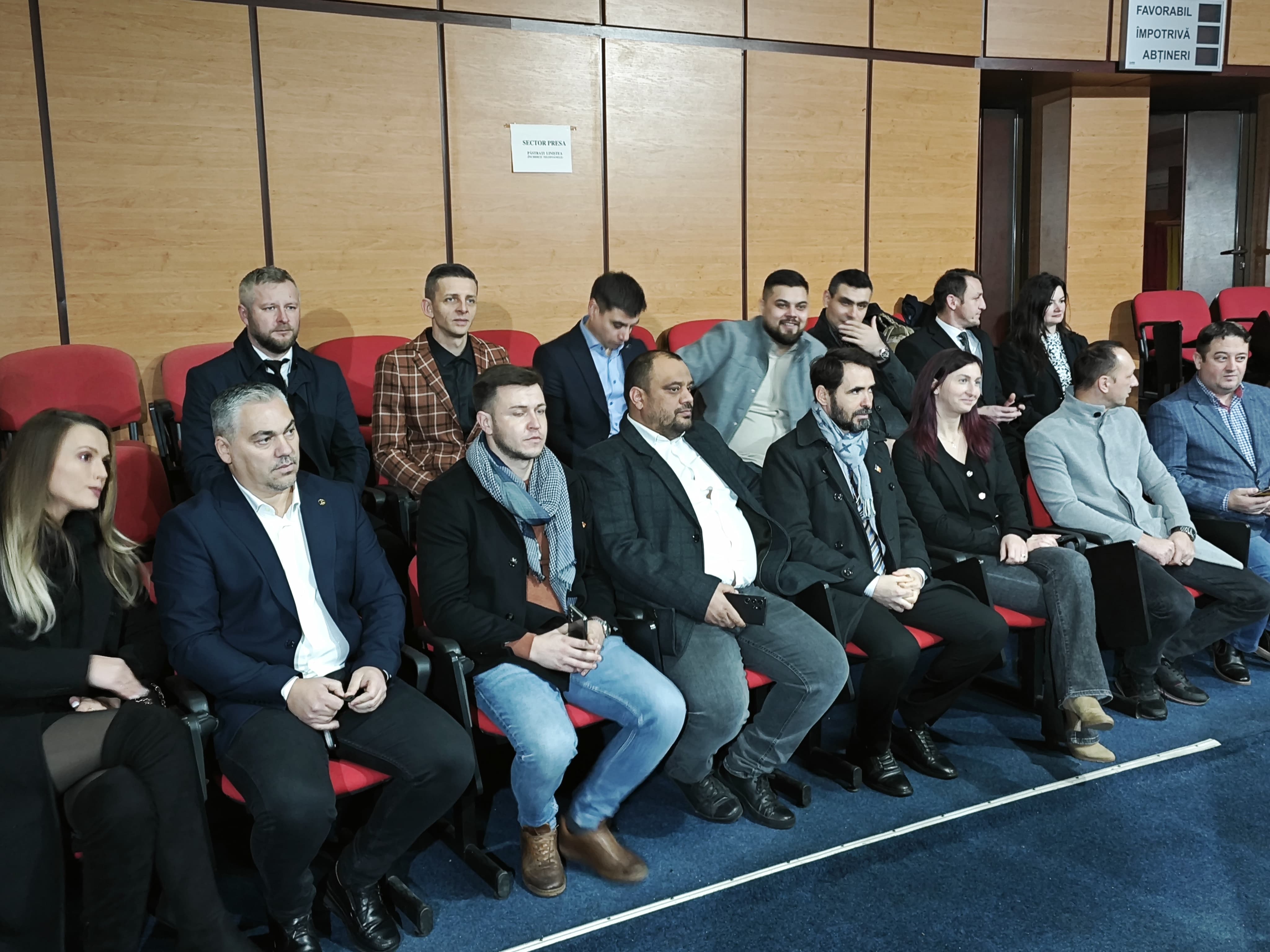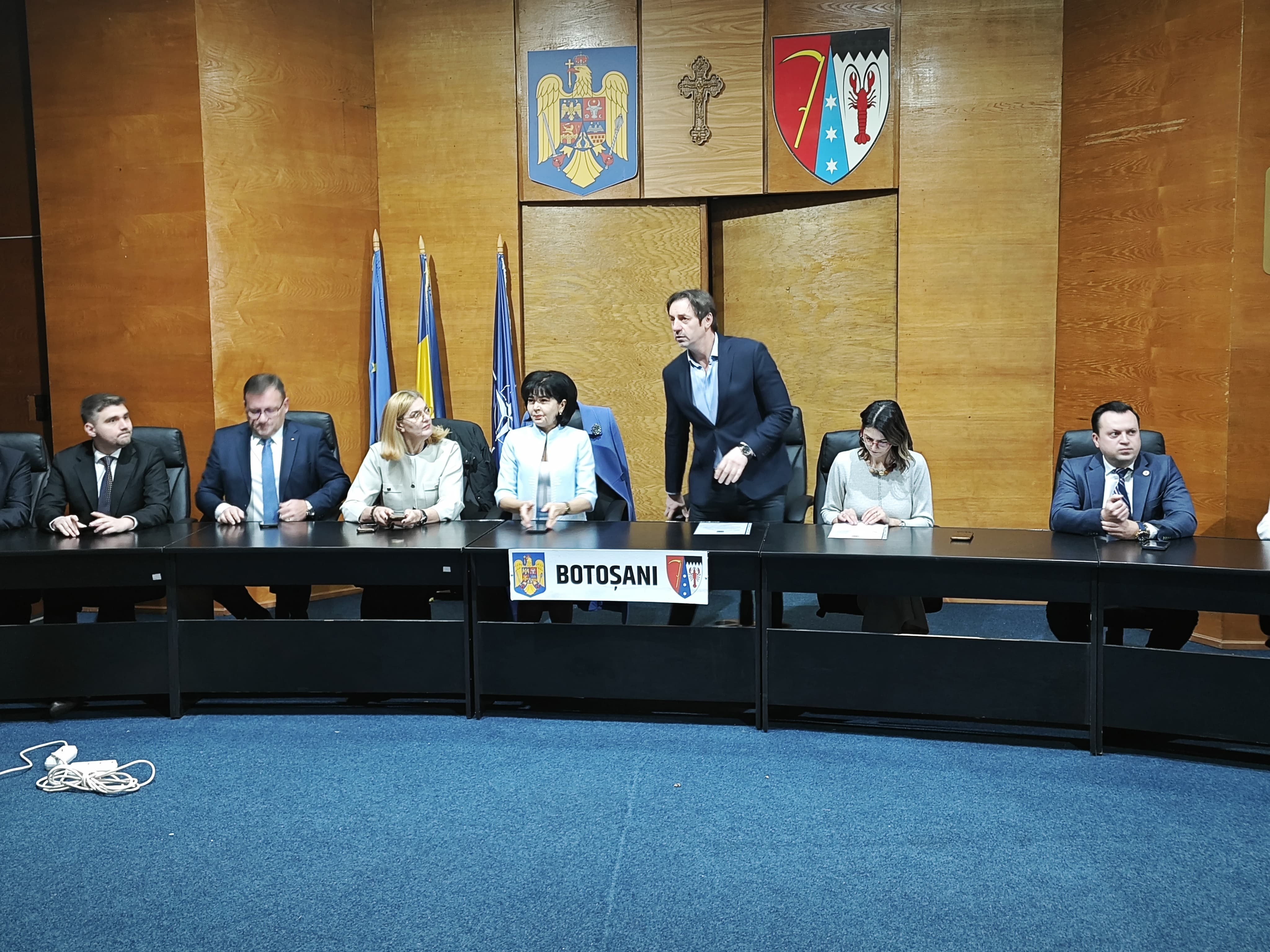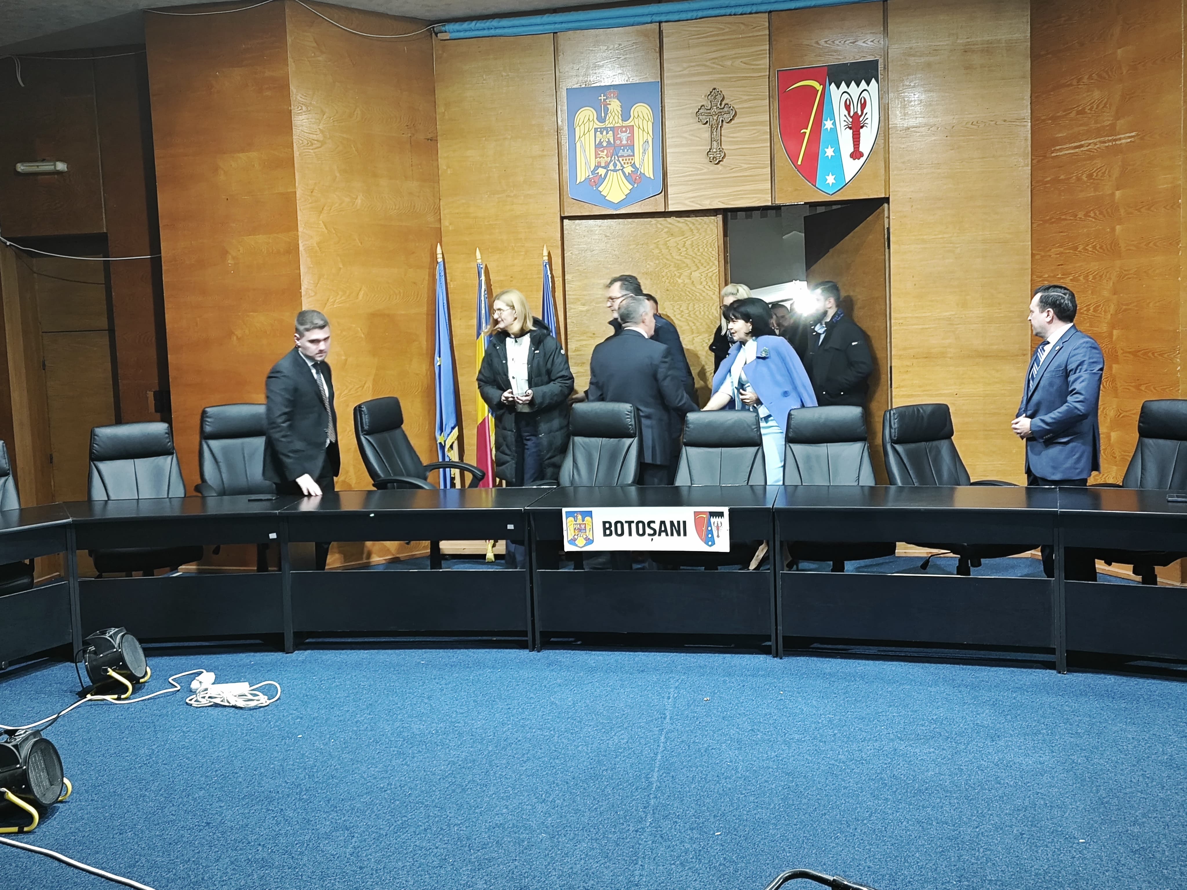 La ceremonie sunt prezenți membri ai echipelor de la PSD, PNL și AUR, inclusiv primarul municipiului Botoșani, Cosmin Andrei.