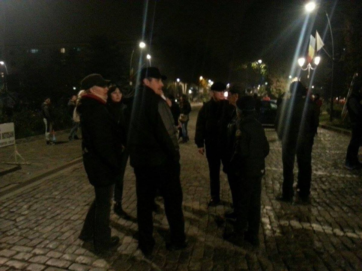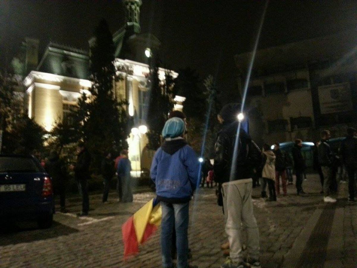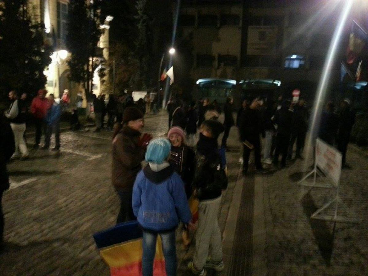 Oamenii sunt aici pentru a comemora victimele din clubul Colectiv și a protesta la adresa întregii clase politice. Deocamdată manifestația este una cât se poate de liniștită, participanții discută în mai multe grupuri fără să scandeze și fără să afișeze pancarte. Din când în când, se mai aud câteva goarne și tobe. Unii participanți au venit cu steaguri tricolore în timp ce alții au tricolorul prins la braț. Majoritatea sunt tineri, sunt însă prezenți în Piața Revoluției și părinți cu copii, unul dintre aceștia având tricolorul pictat pe obraz. Chiar în fața Primăriei ard mai multe lumânări. (S.B.)