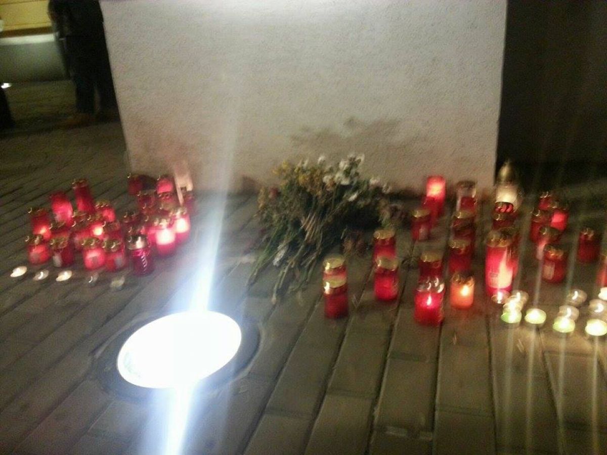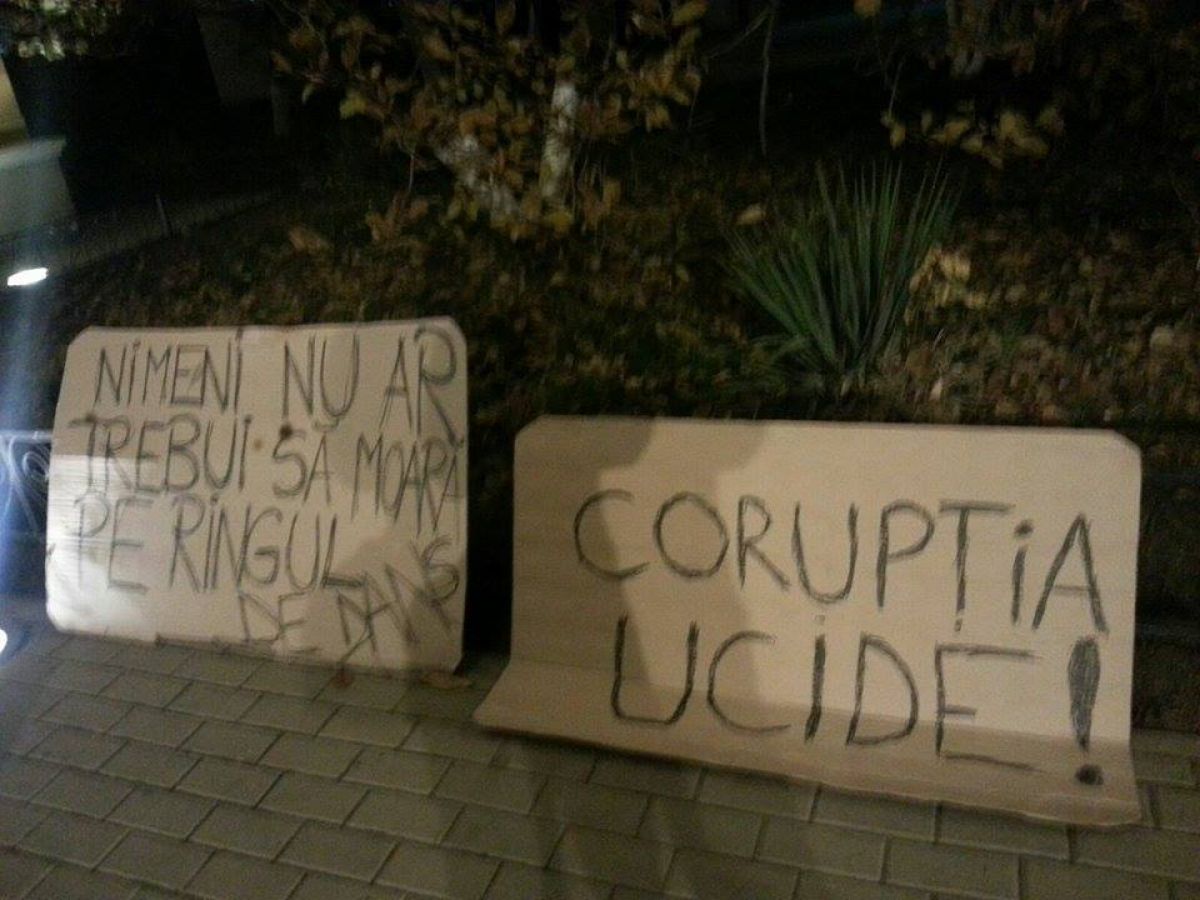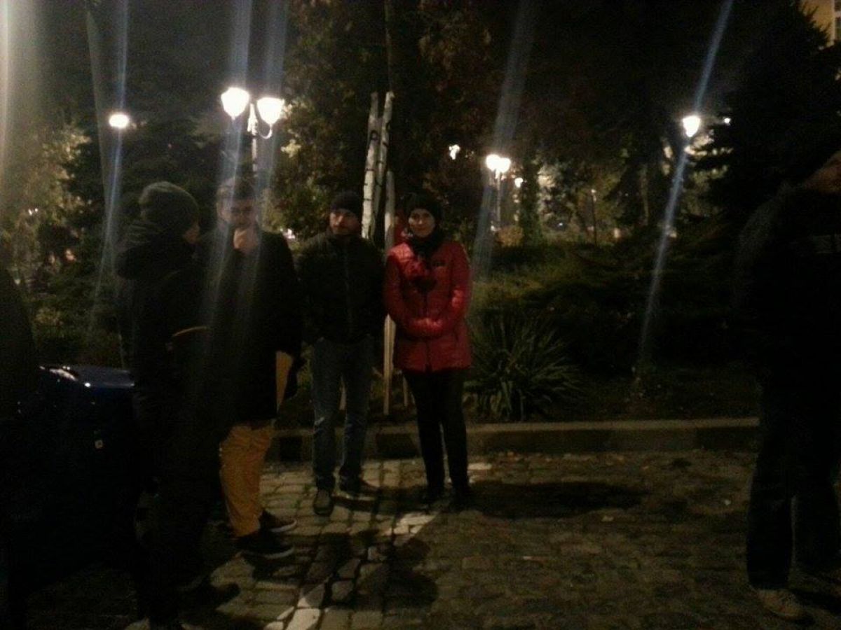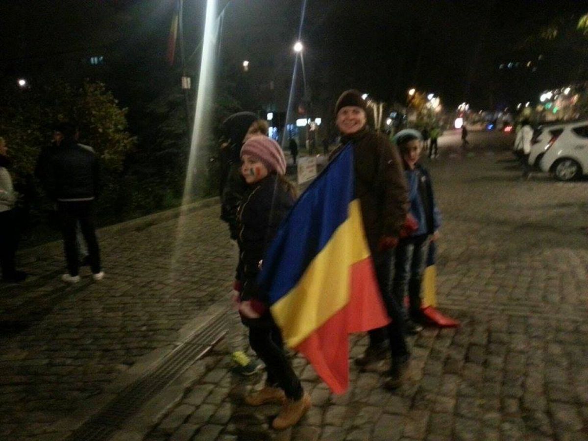 Oamenii sunt aici pentru a comemora victimele din clubul Colectiv și a protesta la adresa întregii clase politice. Deocamdată manifestația este una cât se poate de liniștită, participanții discută în mai multe grupuri fără să scandeze și fără să afișeze pancarte. Din când în când, se mai aud câteva goarne și tobe. Unii participanți au venit cu steaguri tricolore în timp ce alții au tricolorul prins la braț. Majoritatea sunt tineri, sunt însă prezenți în Piața Revoluției și părinți cu copii, unul dintre aceștia având tricolorul pictat pe obraz. Chiar în fața Primăriei ard mai multe lumânări. (S.B.)