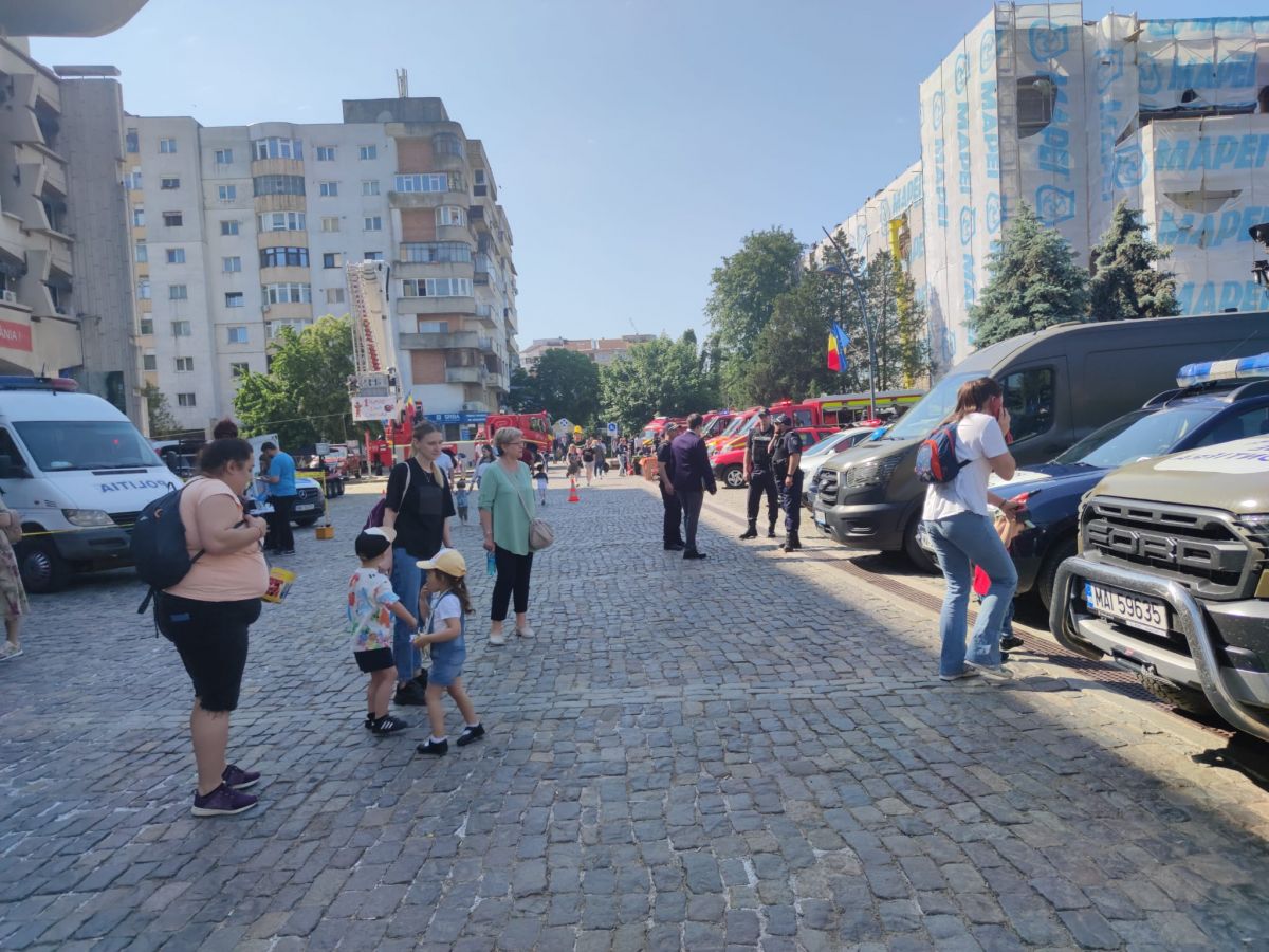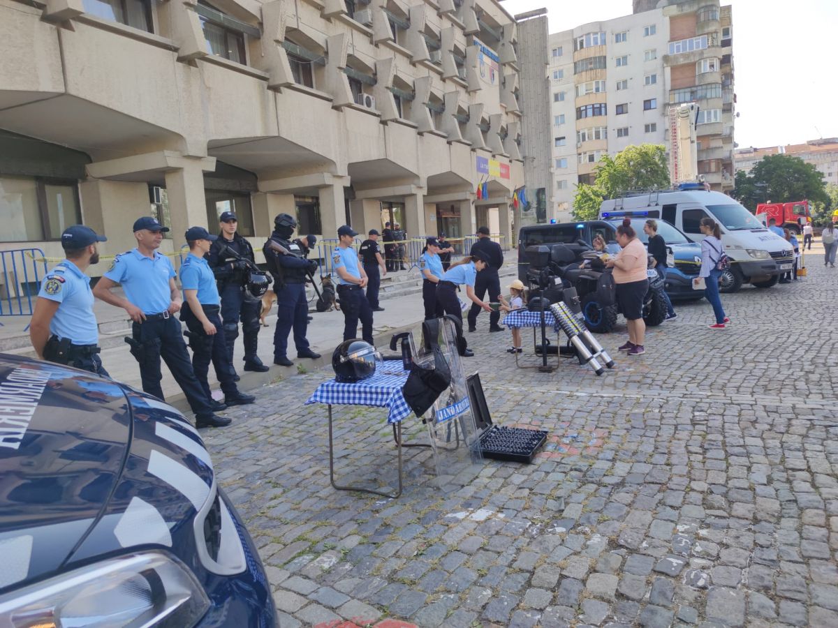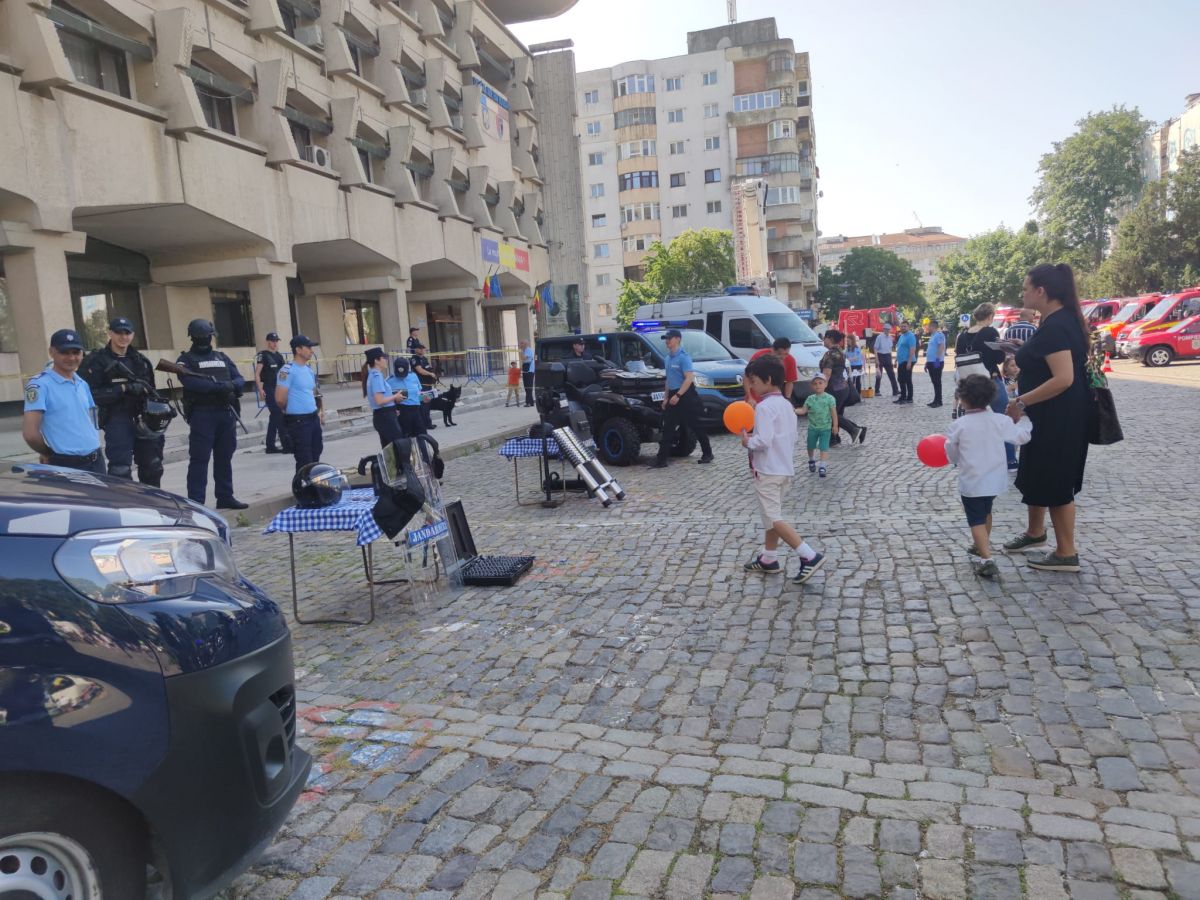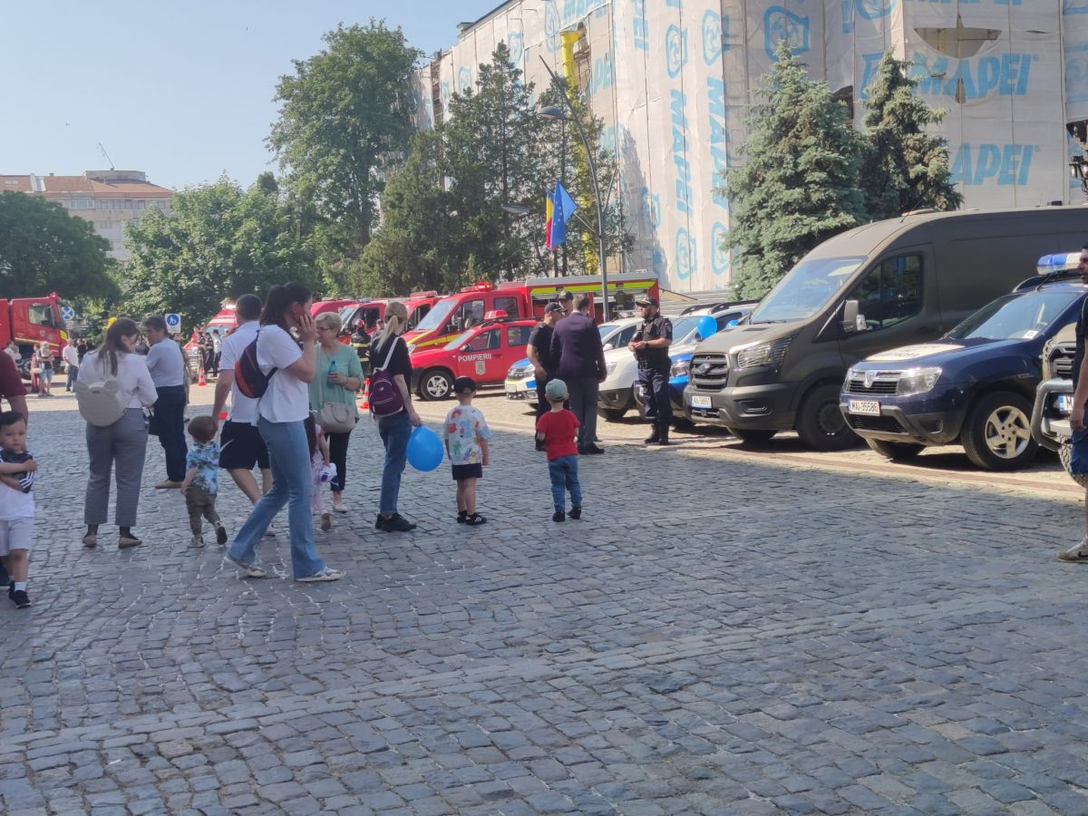 Parcarea din fața Prefecturii este plină de polițiști, pompieri, jandarmi, polițiști de frontieră,, trupe speciale de intervenție rapidă. Copiii pot vedea autospecialele de intervenție și tehnica specifică.