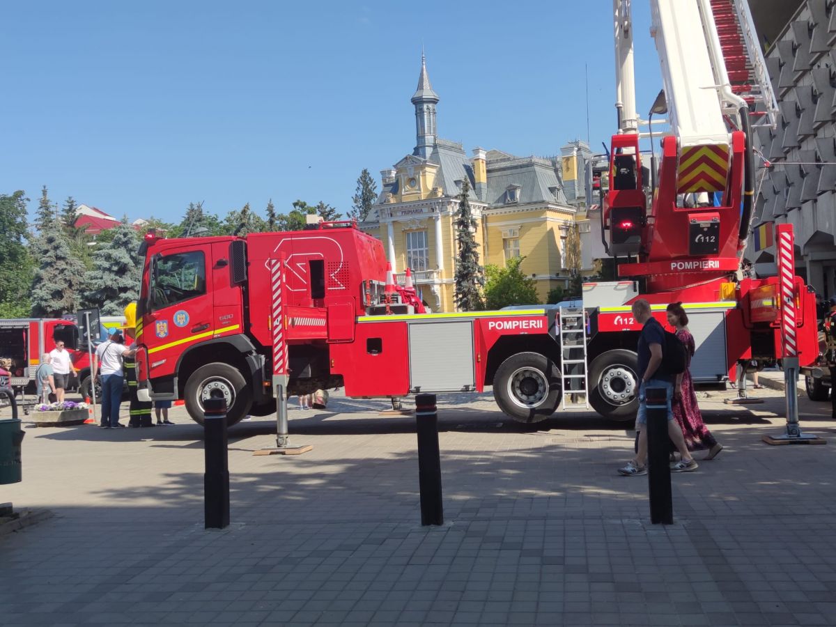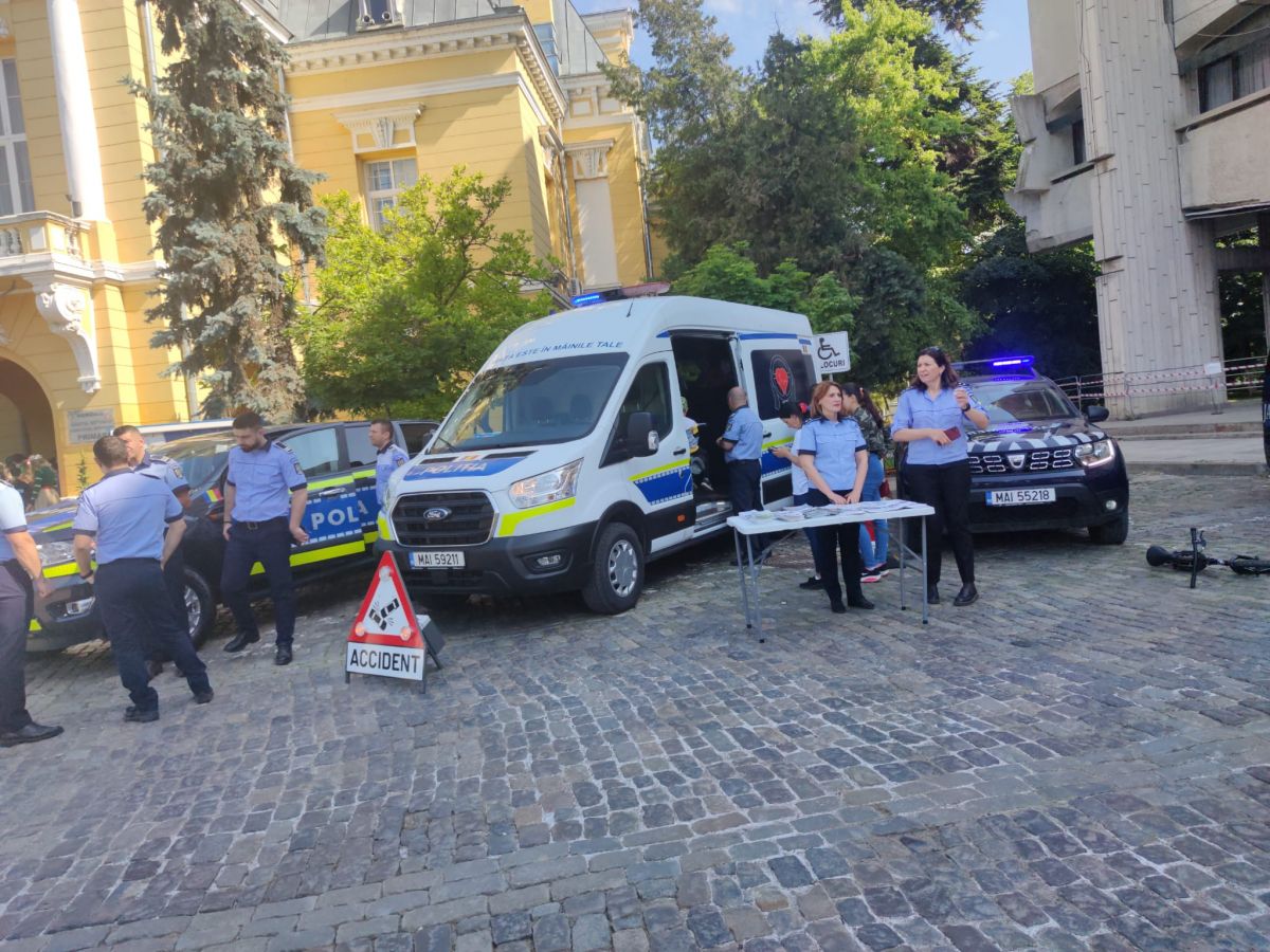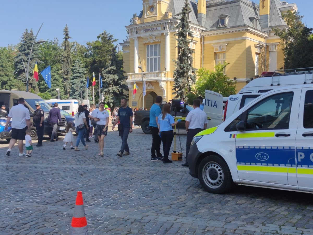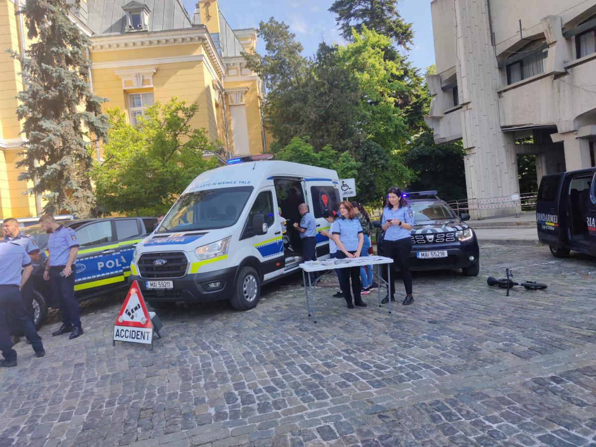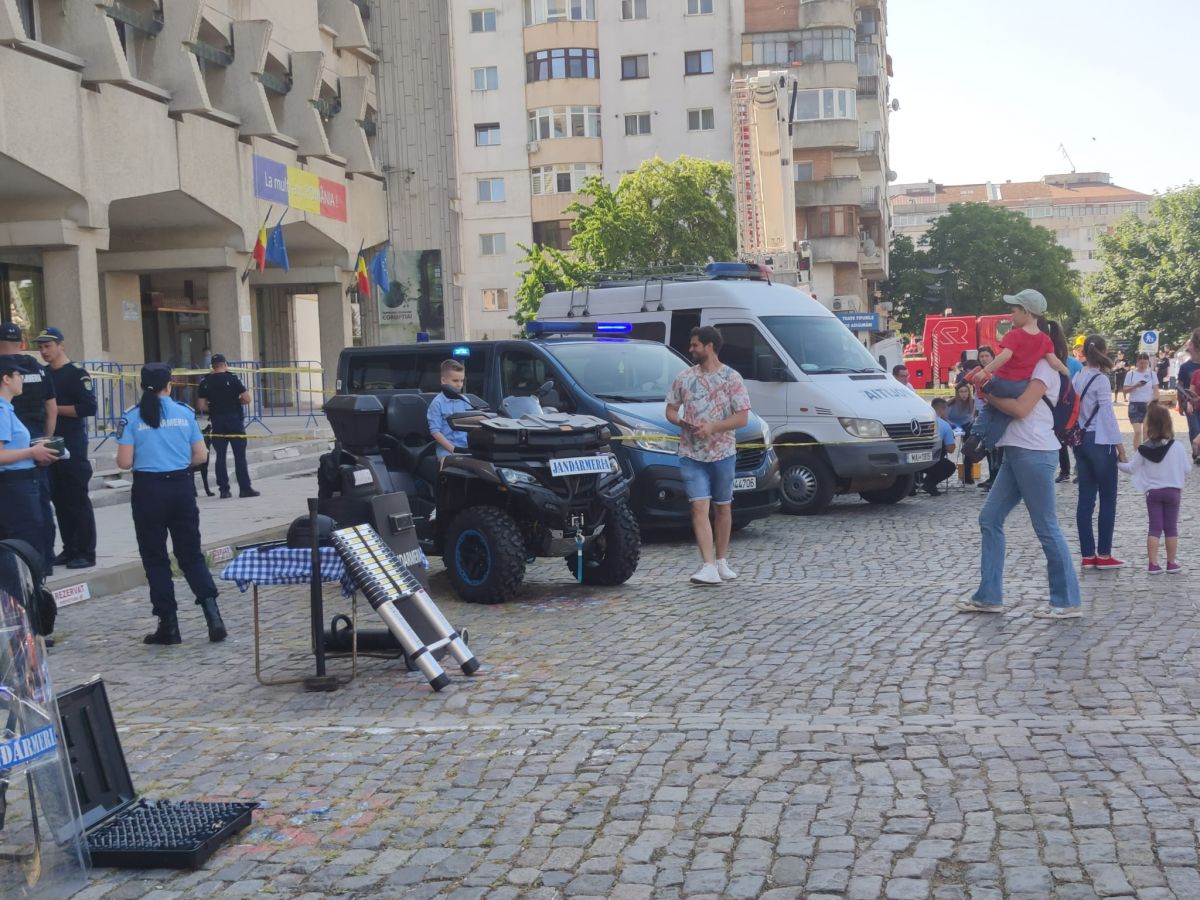 Parcarea din fața Prefecturii este plină de polițiști, pompieri, jandarmi, polițiști de frontieră,, trupe speciale de intervenție rapidă. Copiii pot vedea autospecialele de intervenție și tehnica specifică.