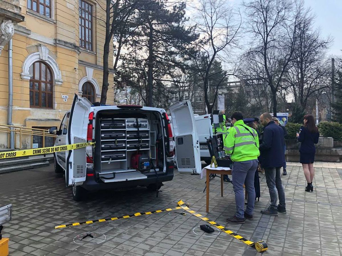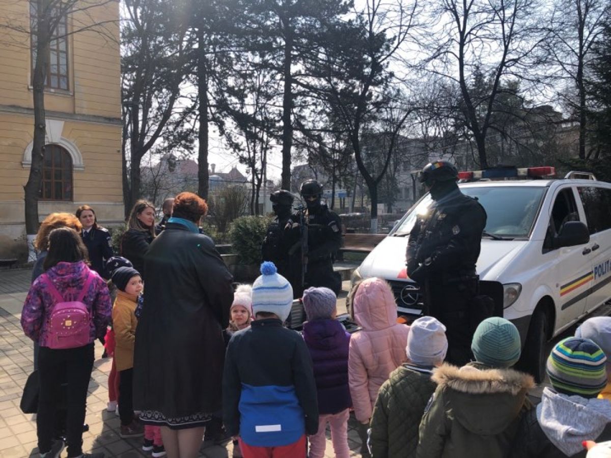 Oamenii legii au adus cu ei aparatura folosită în misiunile de investigații și au expus în fața instituției de cultură câteva arme. Sunt prezenţi alături de ei, mascați, criminaliști, dar și un câine, spre deliciul celor mici.