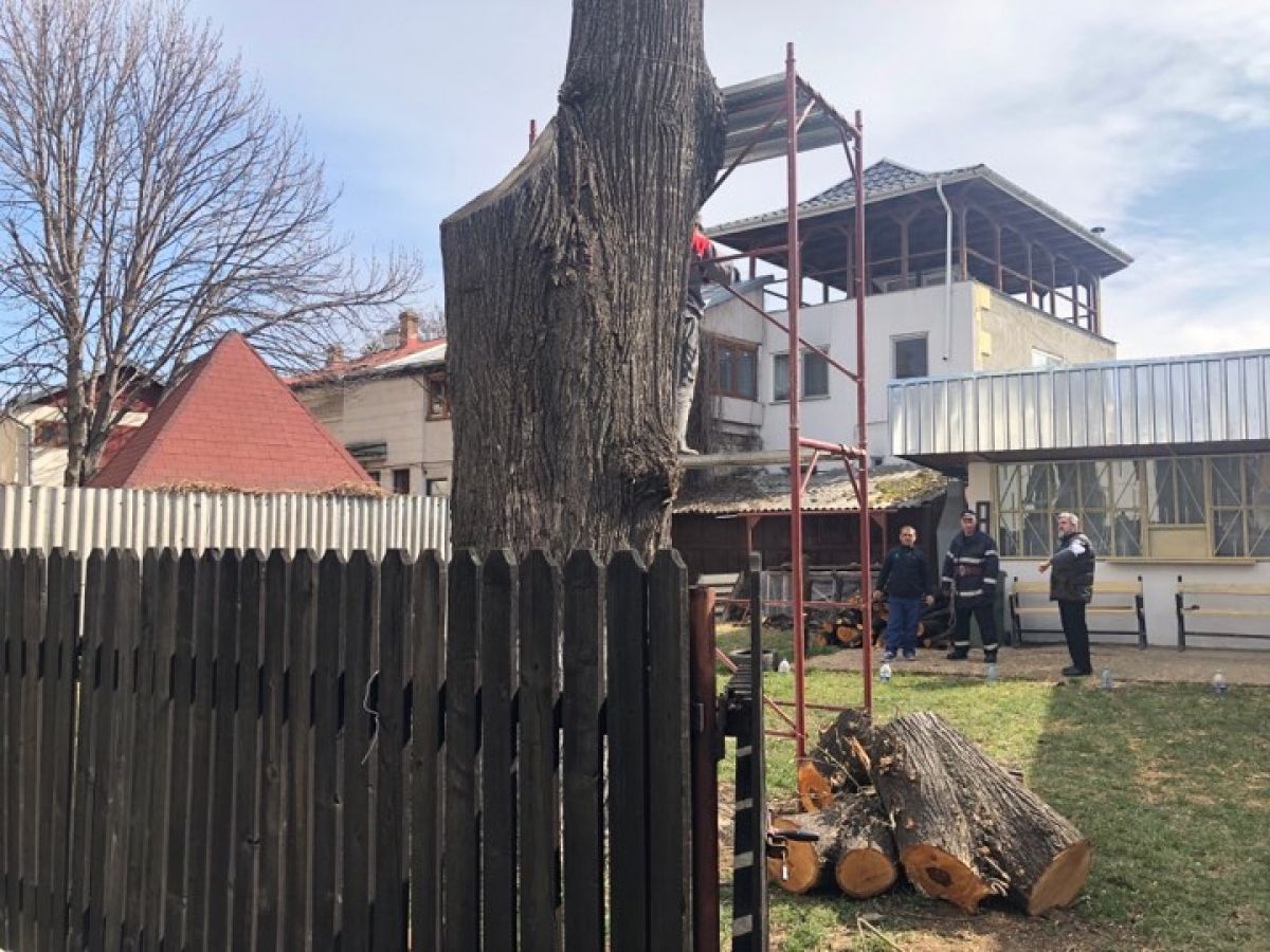 Trunchiul fiind foarte gros, pompierii folosesc frânghii, dar și o drujba pentru ca tăierea acestuia să se facă în siguranță, fără a exista vreun pericol pentru cetăţeni.