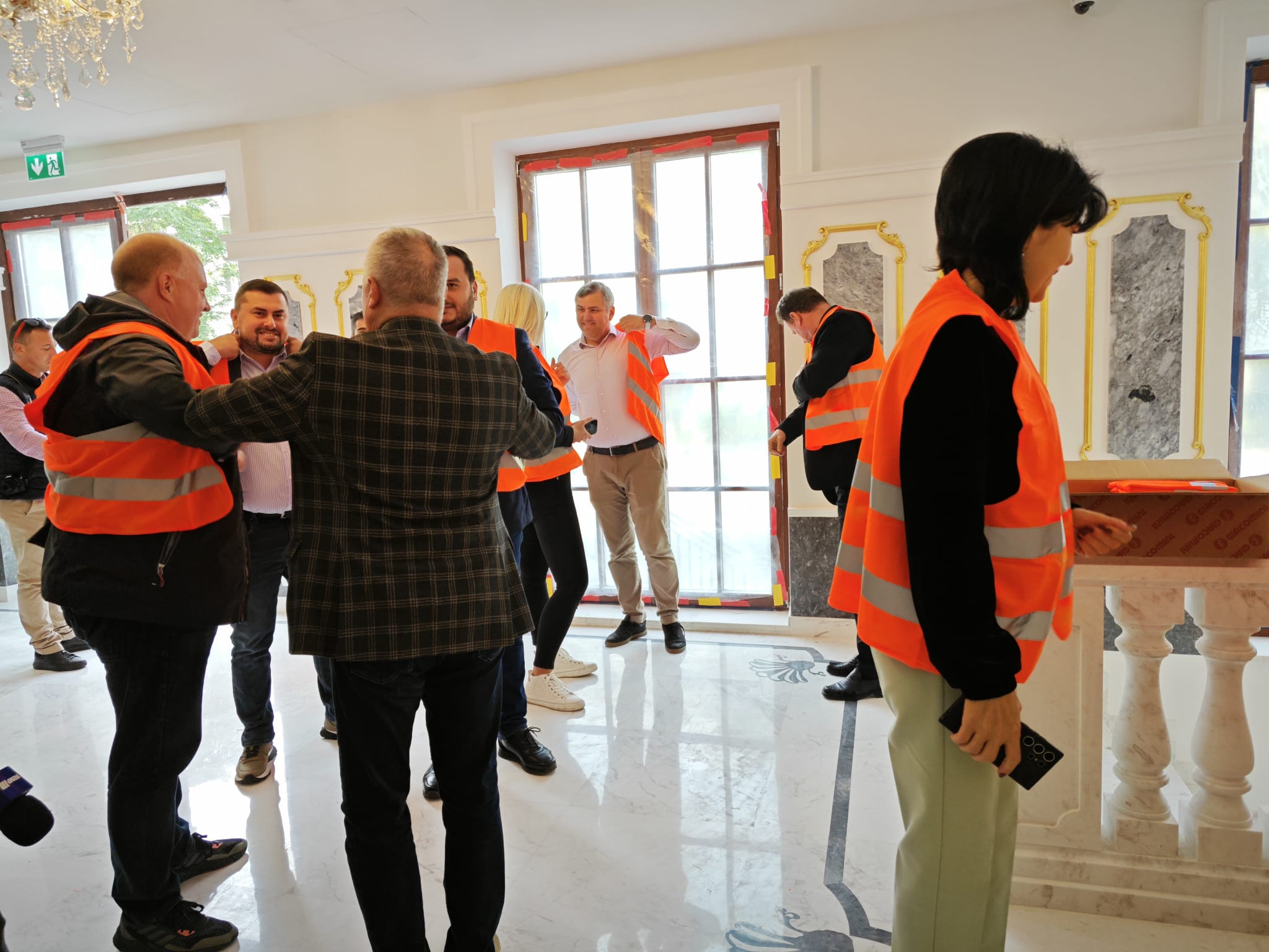 În aceste momente, primarul Cosmin Andrei face un tur al etajelor din clădire și primește informații de la constructor.