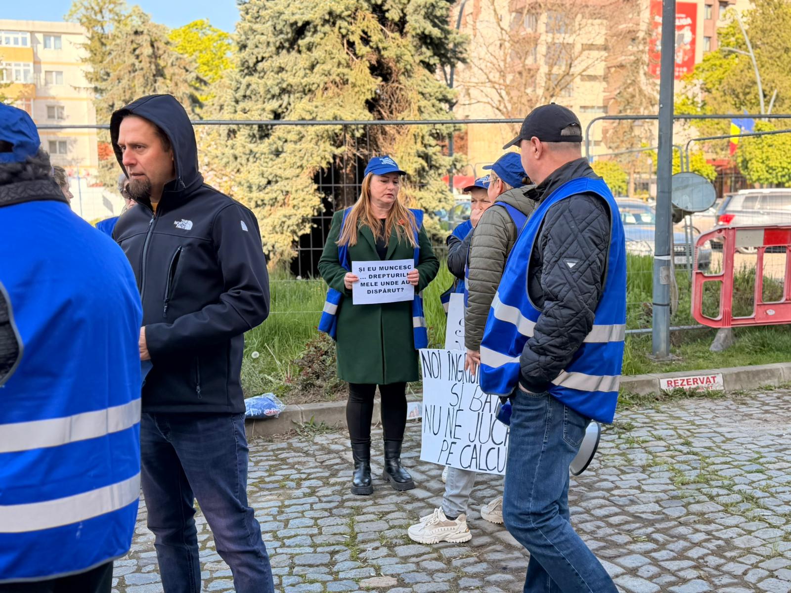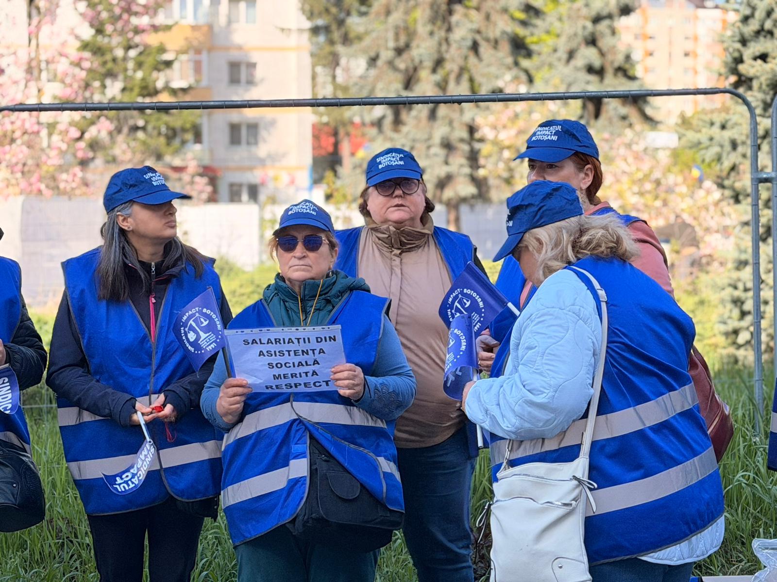 Protestatarii au pancarte cu diferite mesaje precum: Vrem să muncim, nu să cerșim / Salariații din asistența socială merită respect.