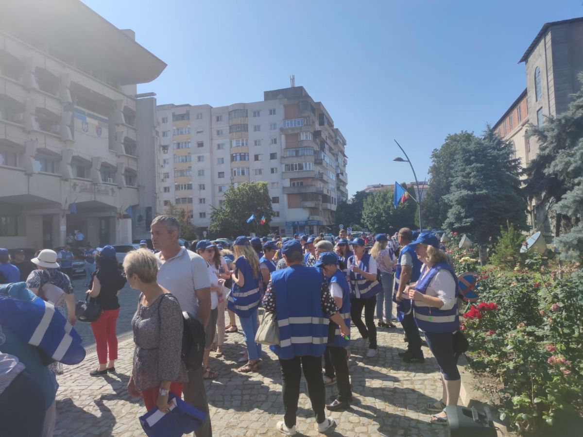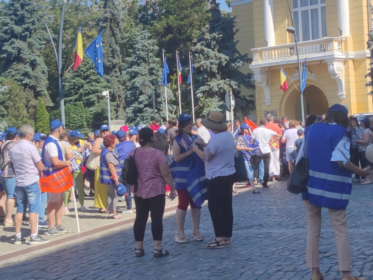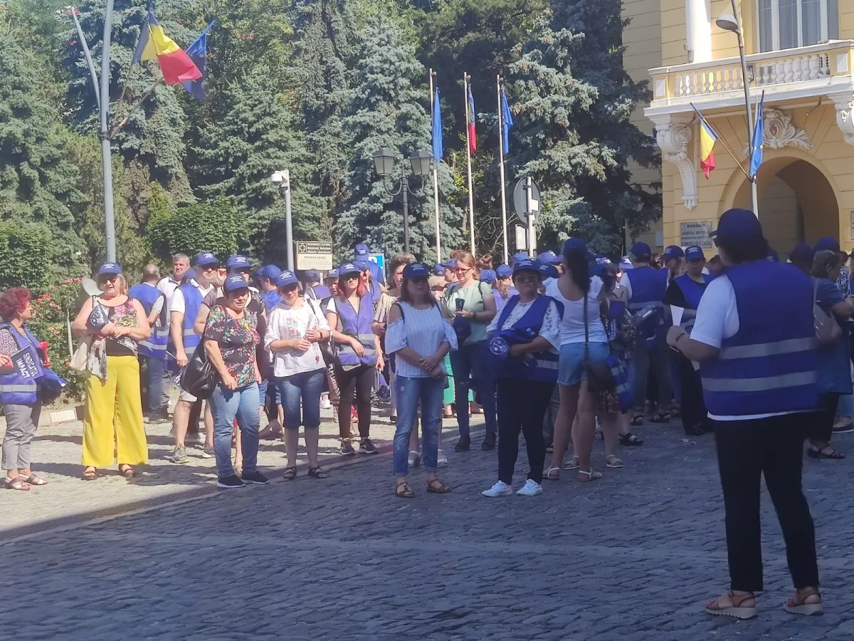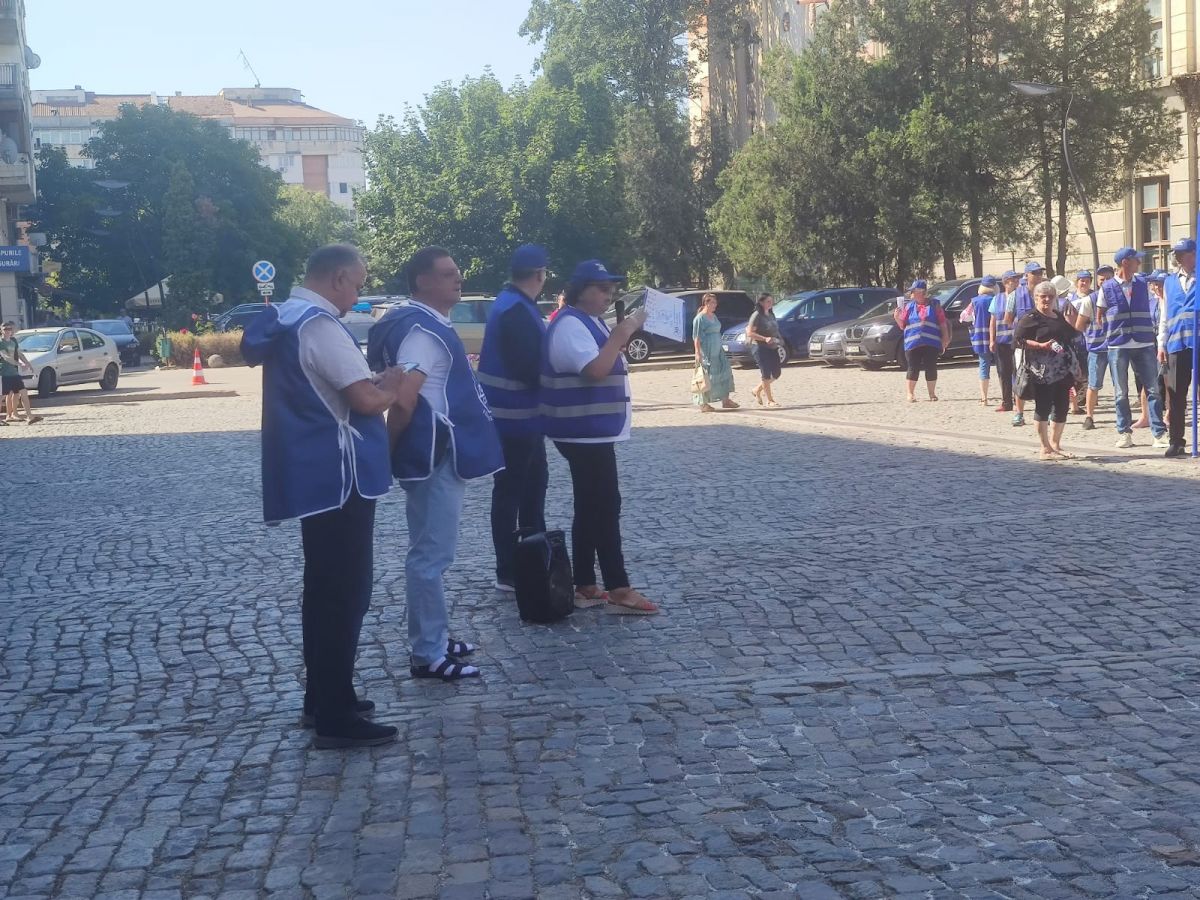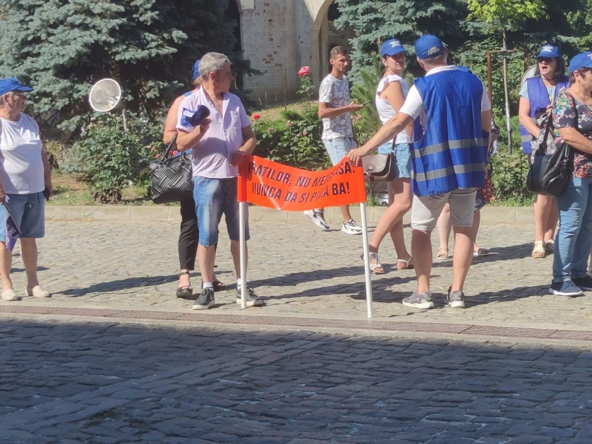 Protestează aproximativ 100 de angajați cu pancarte, stegulețe. Având în vedere vremea caniculară, s-au adus baxuri de apă pentru participanți